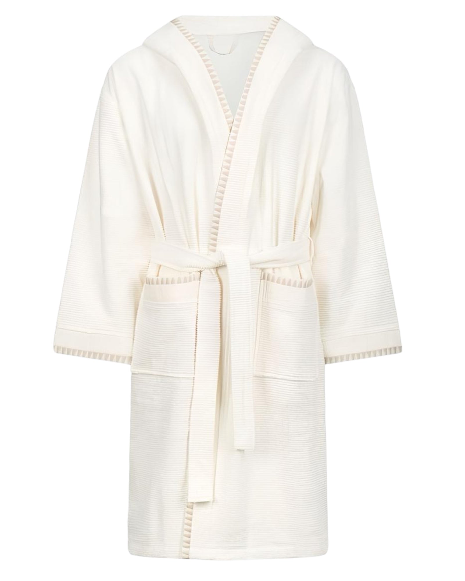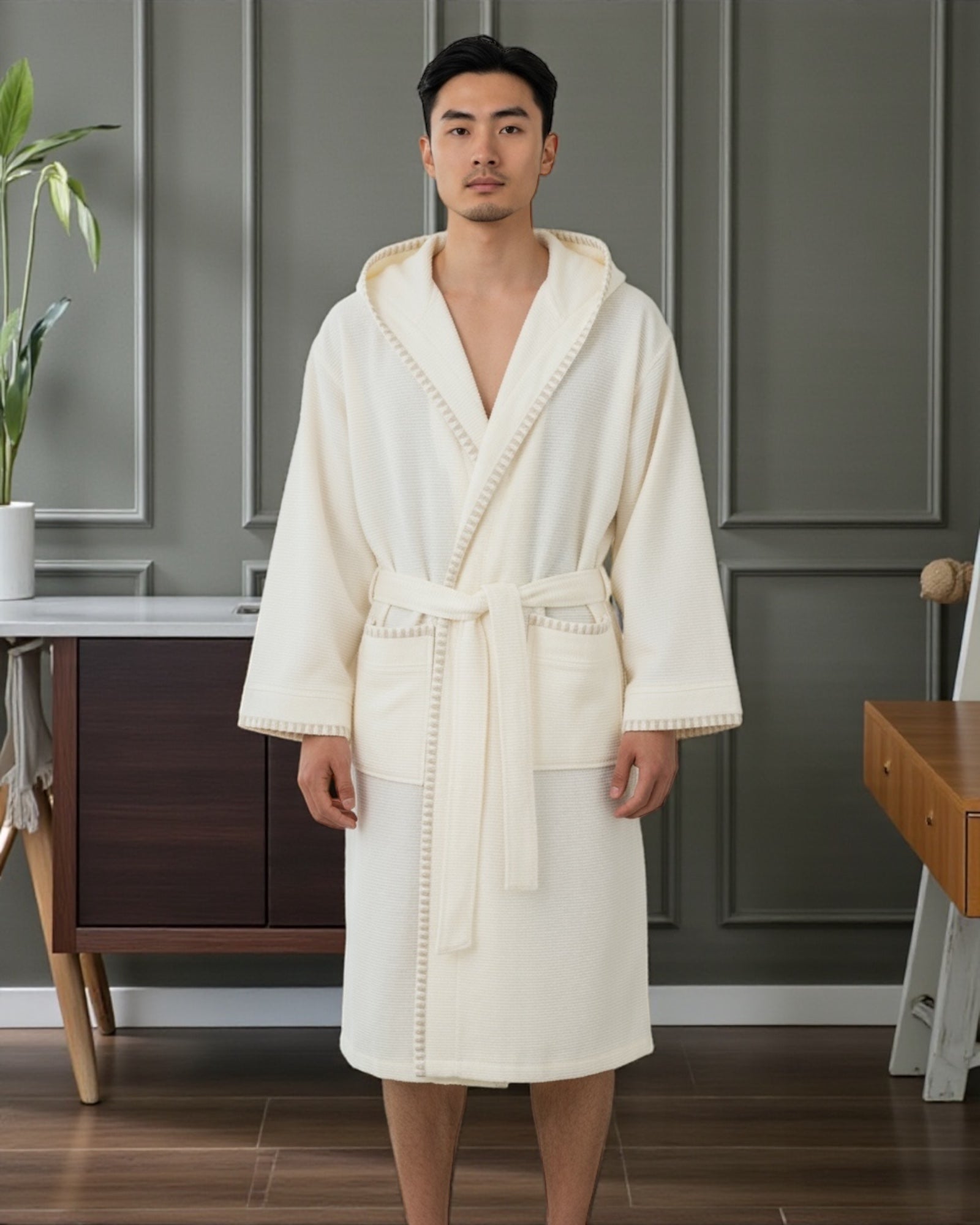 Comodo e pratico, è dotato di cappuccio, due tasche frontali e cintura regolabile, per un comfort totale dopo la doccia, in palestra, spa o in viaggio.