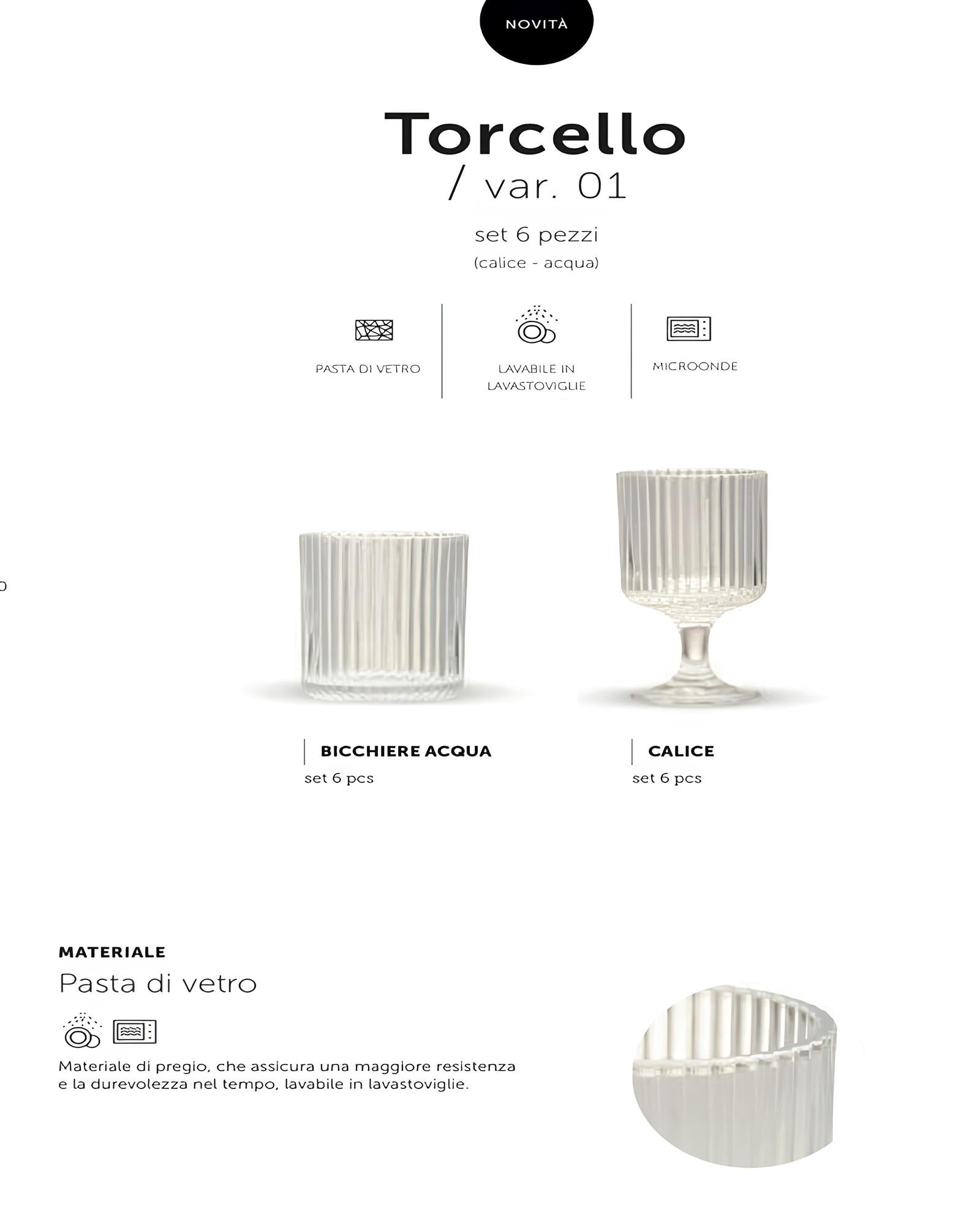 Il Set di Bicchieri e Calici Torcello è composto da 6 pezzi in pasta di vetro, disponibile in diversi colori.