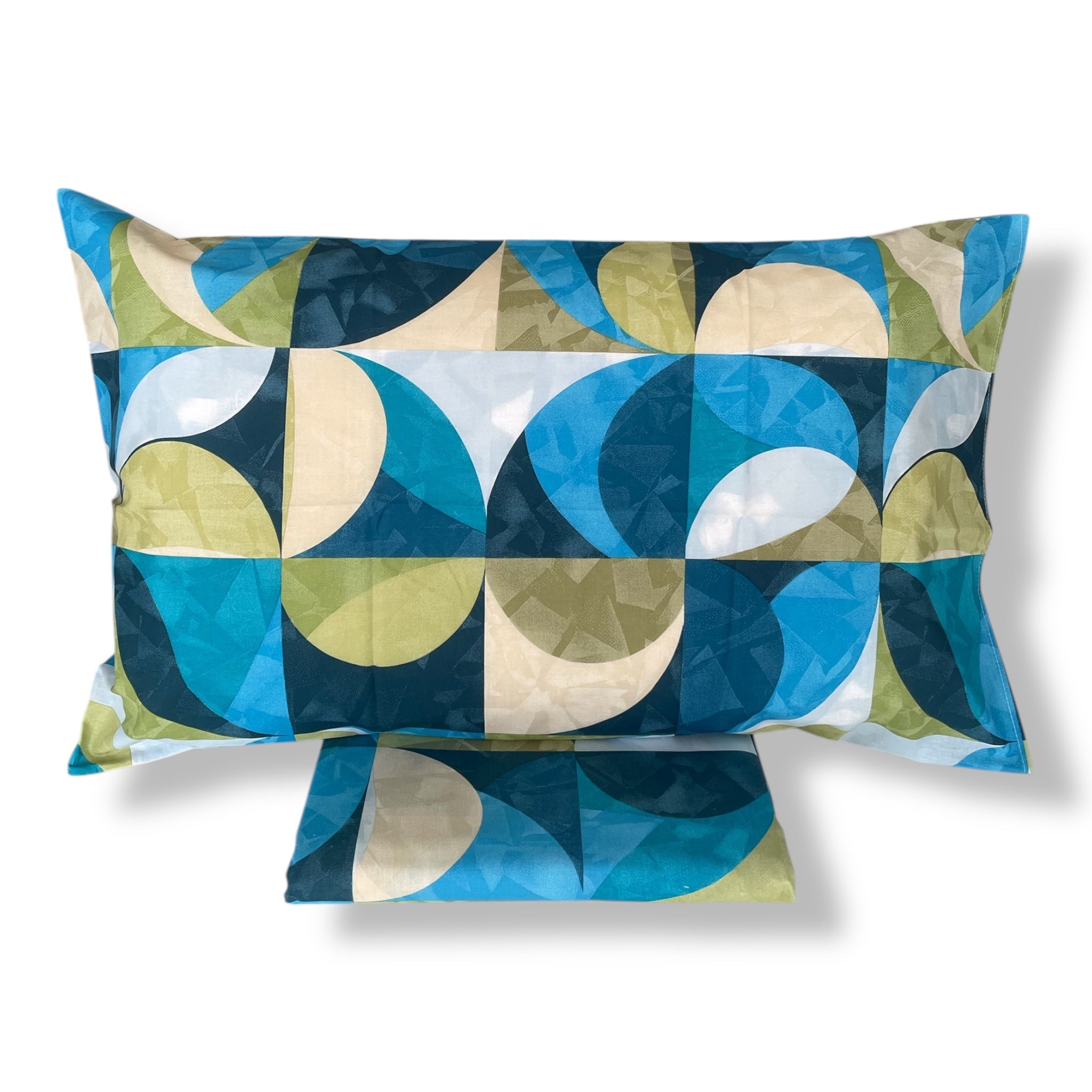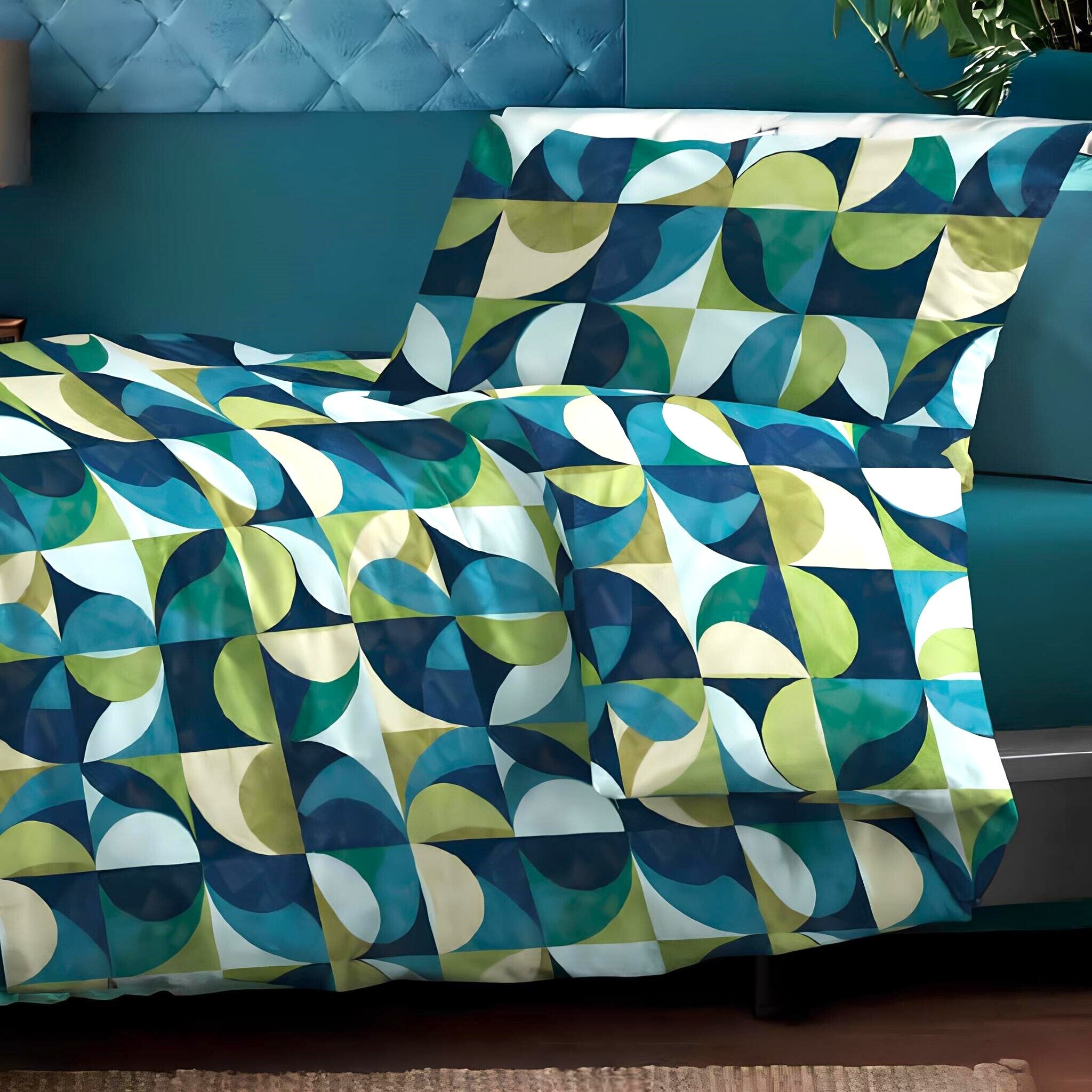La fantasia geometrica blu e verde dona alla camera da letto un tocco contemporaneo e raffinato.