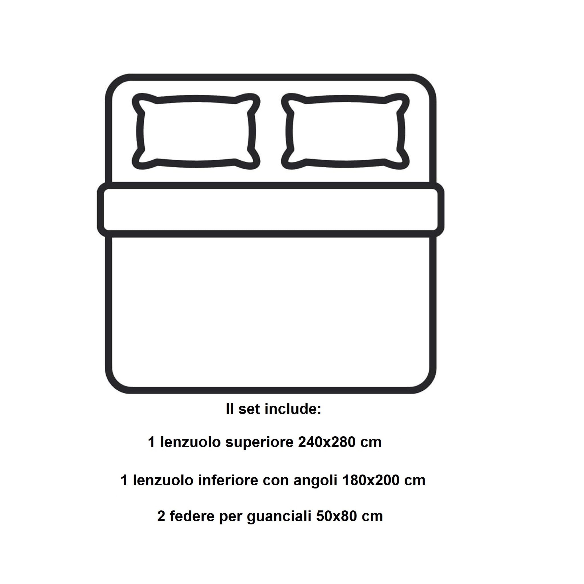 🛏️ Completo matrimoniale – 1 lenzuolo sopra 240x280, 1 sotto con angoli 180x200, 2 federe 50x80