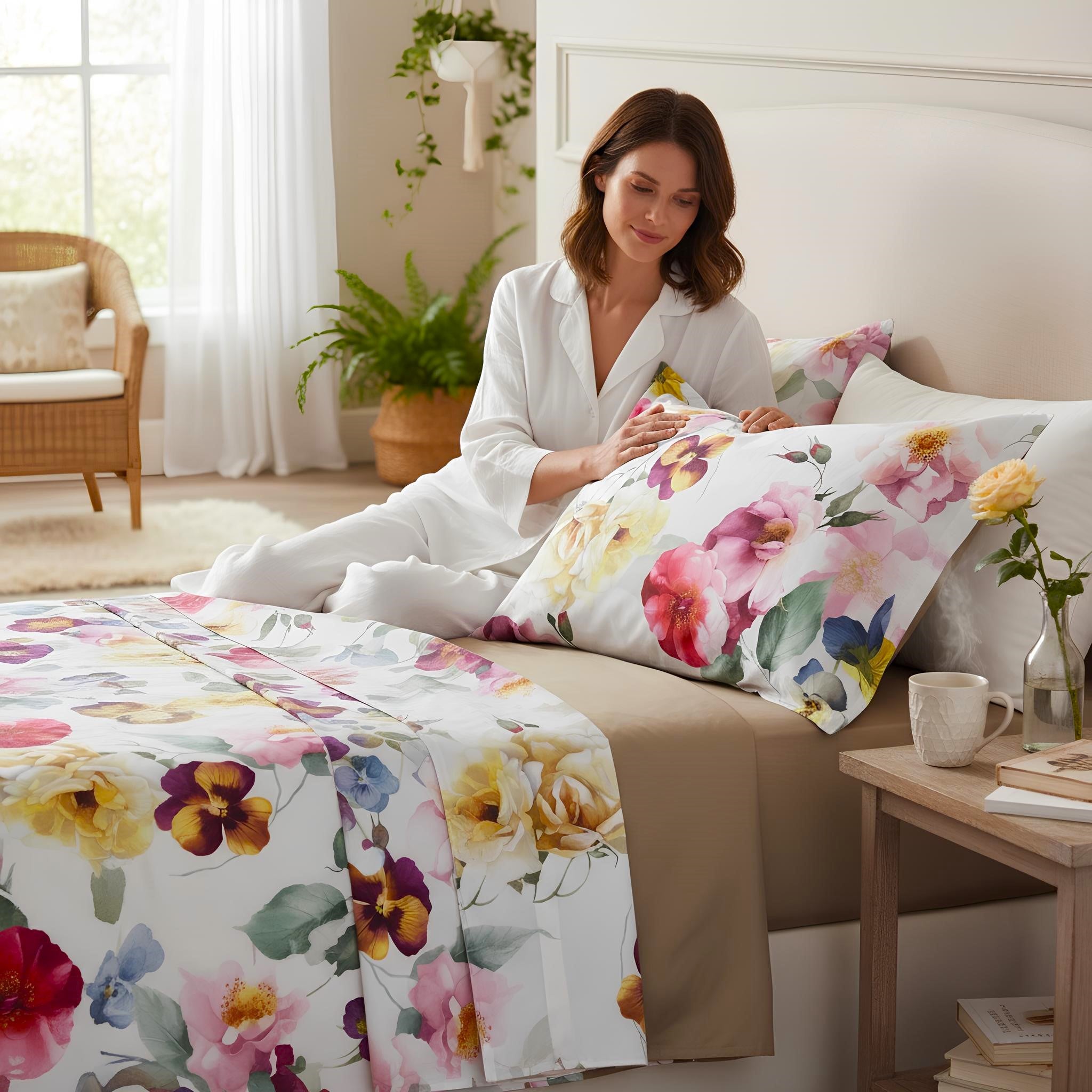 Rinnova la tua camera con la delicata eleganza del completo lenzuola matrimoniale Mirabello Art. Bloom Cascade, parte della raffinata collezione Emporium.