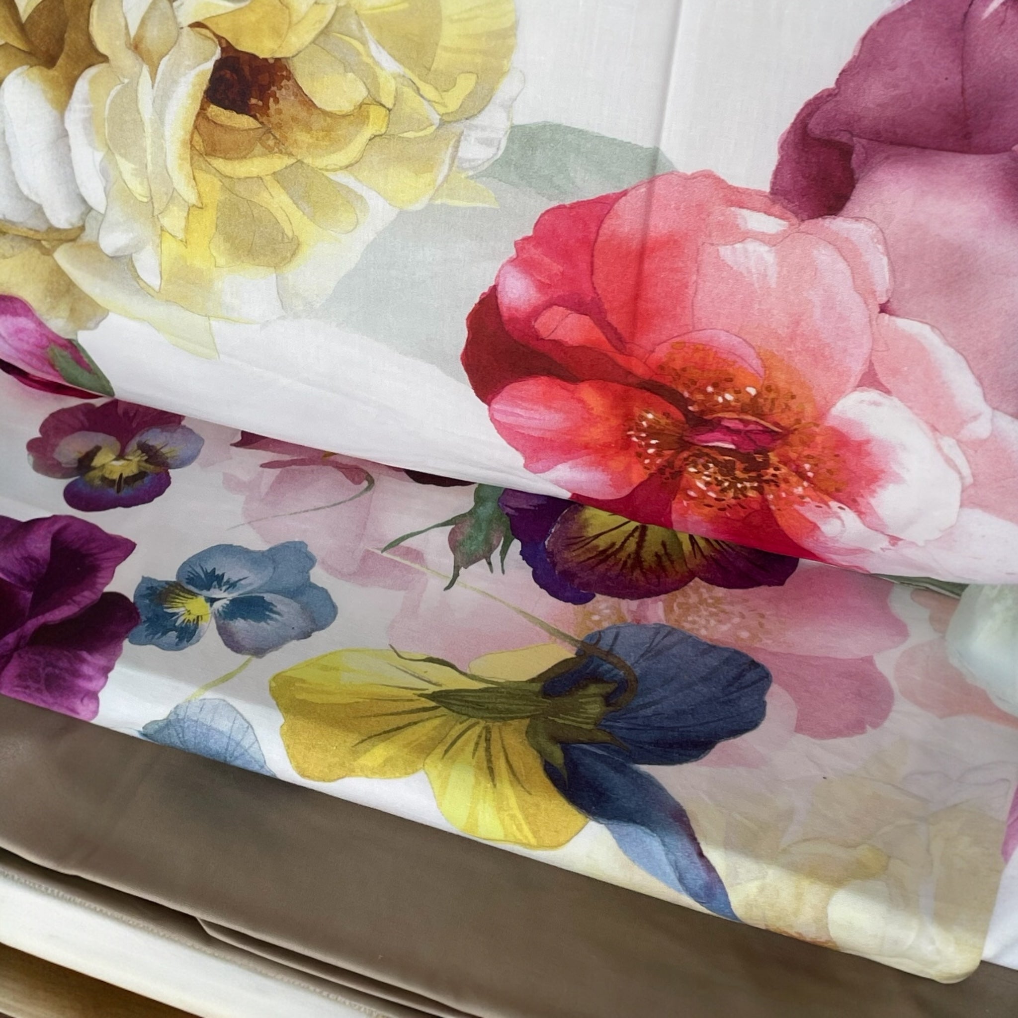 Il lenzuolo superiore effetto copriletto (250x290 cm) presenta una splendida stampa floreale multicolore, mentre il lenzuolo con angoli (175x205 cm) in tinta unita tortora crea un raffinato contrasto. Le due federe 50x80 cm completano il set con la stessa eleganza.