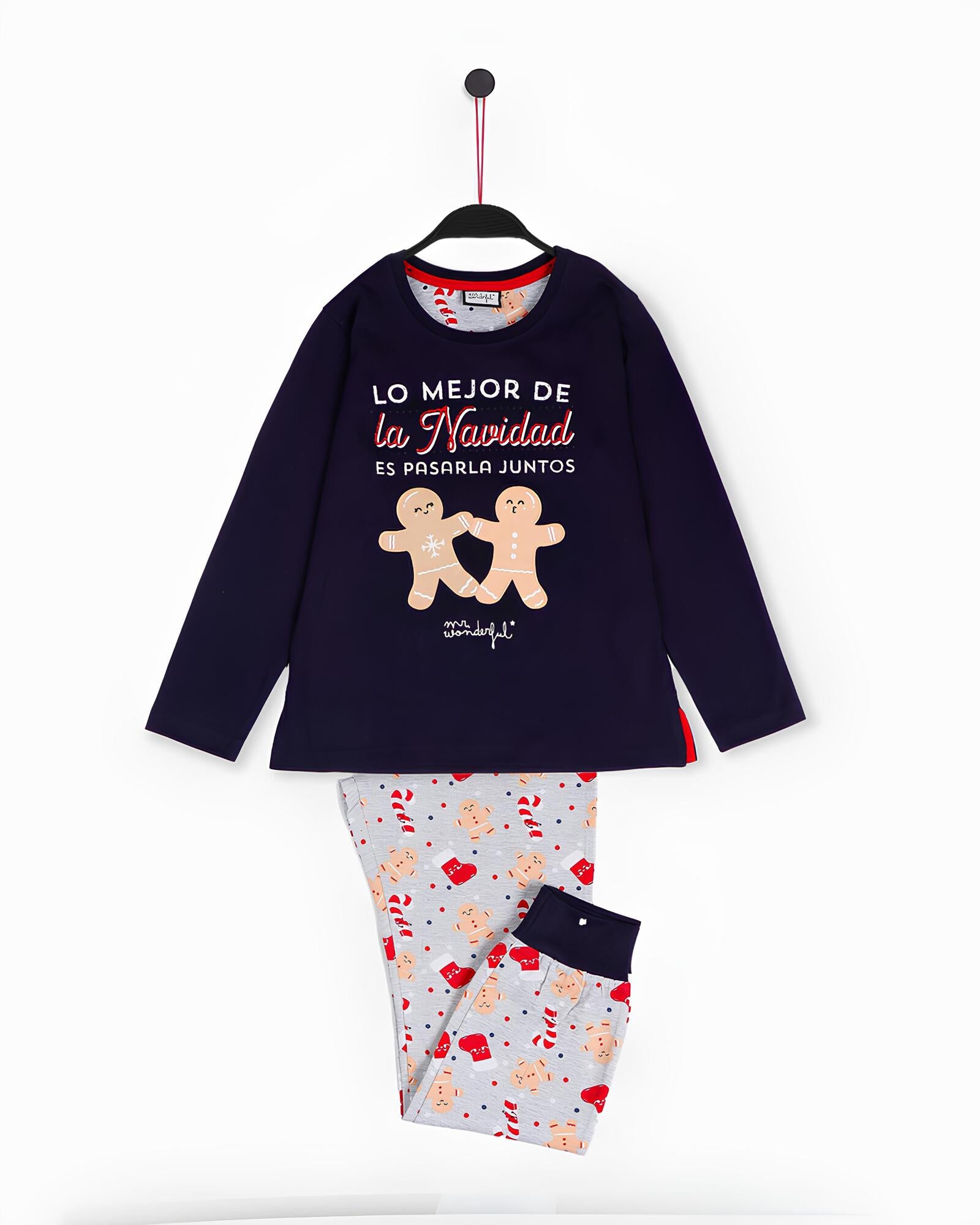 Pigiama natalizio per bambina Mr. Wonderful in caldo cotone. Maglia blu modello girocollo con stampa centrale motivo natalizio. Pantalone stampato con motivi natalizi con polsini a fondo gamba. Vita elasticizzata e coulisse regolabile per una migliore vestibilità. Confezionato in una splendida scatola regalo.