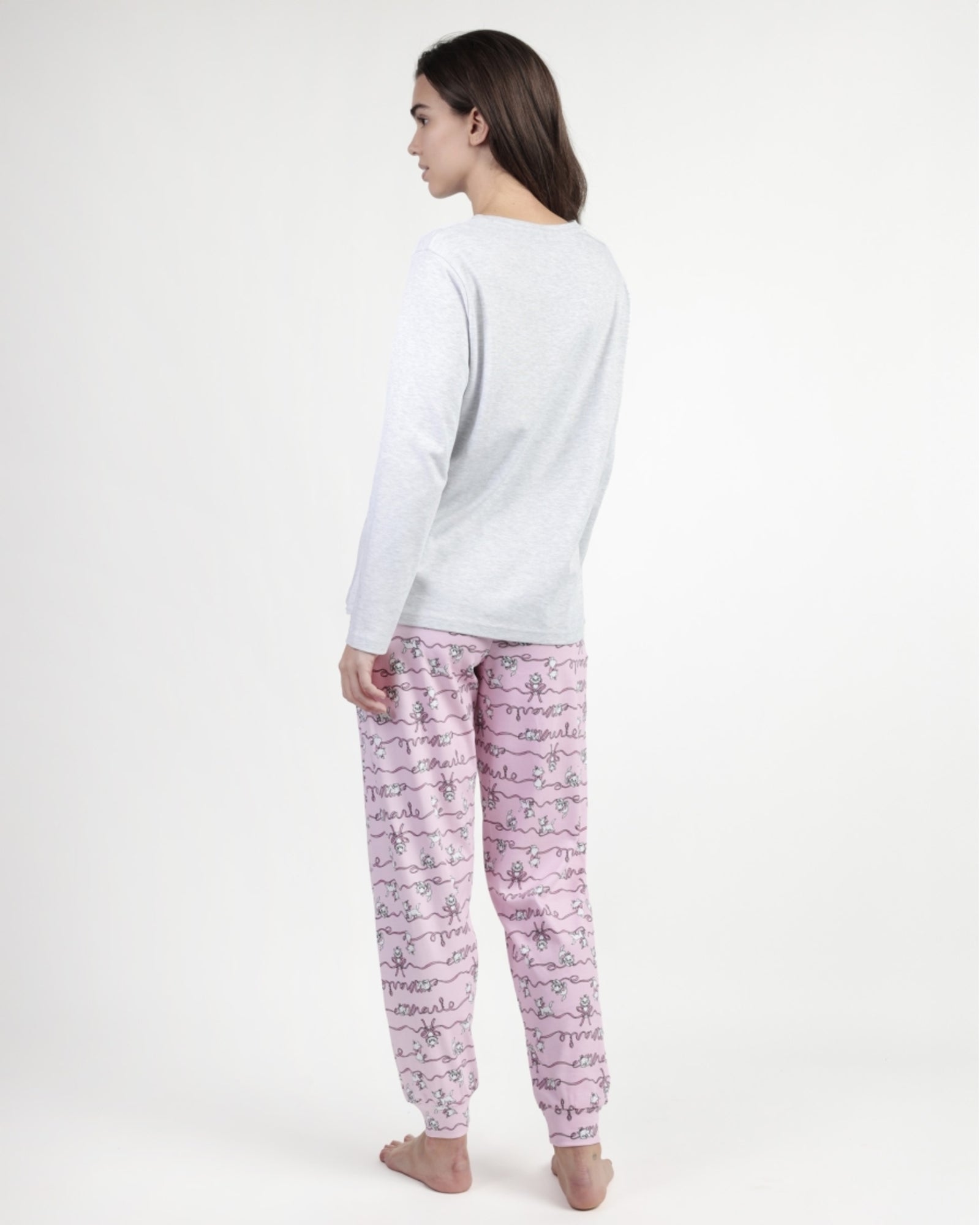 La maglia grigio mélange presenta una romantica stampa glitterata di Marie, mentre i pantaloni rosa con stampa all over e polsini donano un tocco di allegria e una vestibilità comoda e naturale.