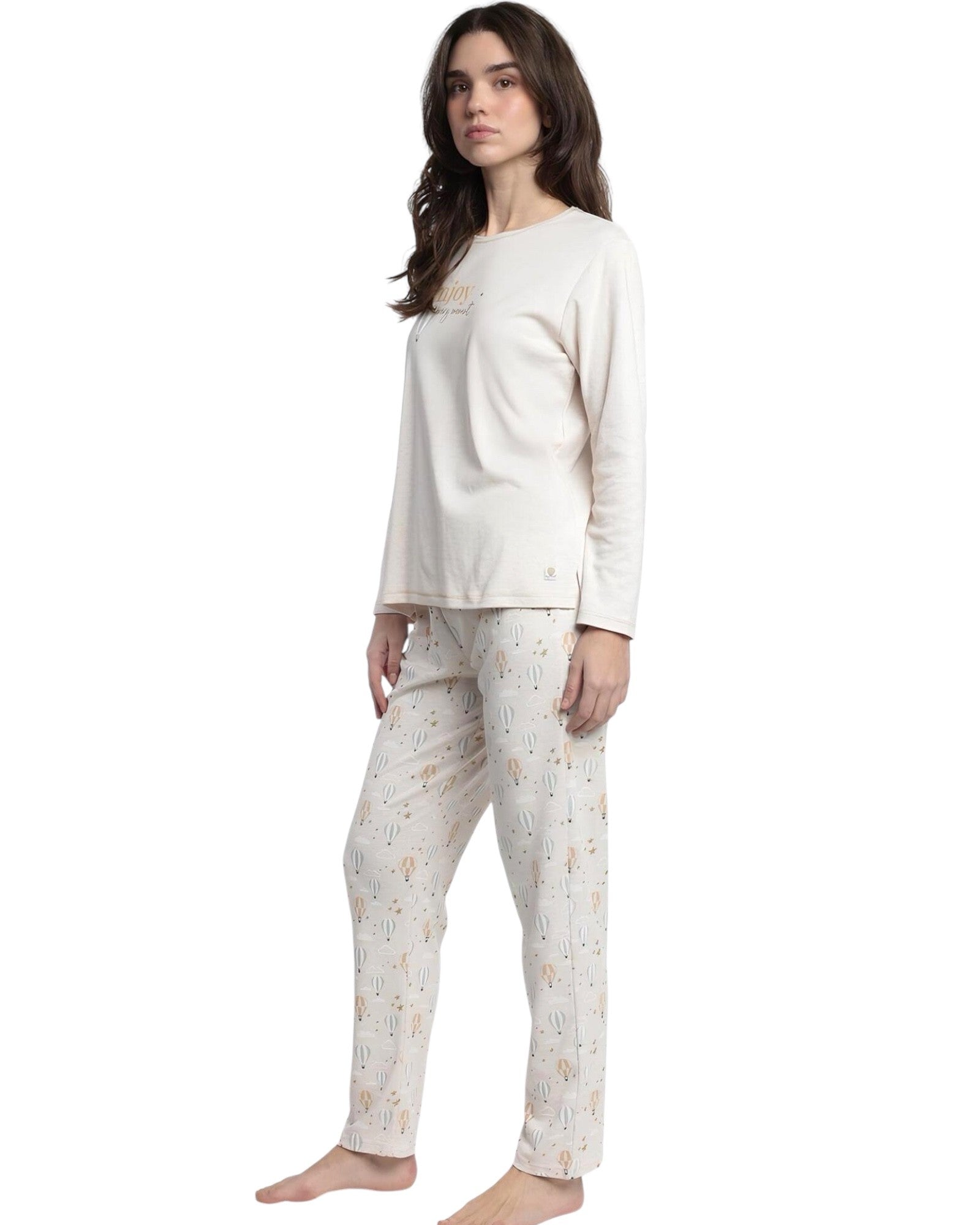 La maglia beige a maniche lunghe presenta una stampa elegante con la frase Enjoy Every Moment e un delicato disegno con mongolfiere, simbolo di leggerezza e libertà.