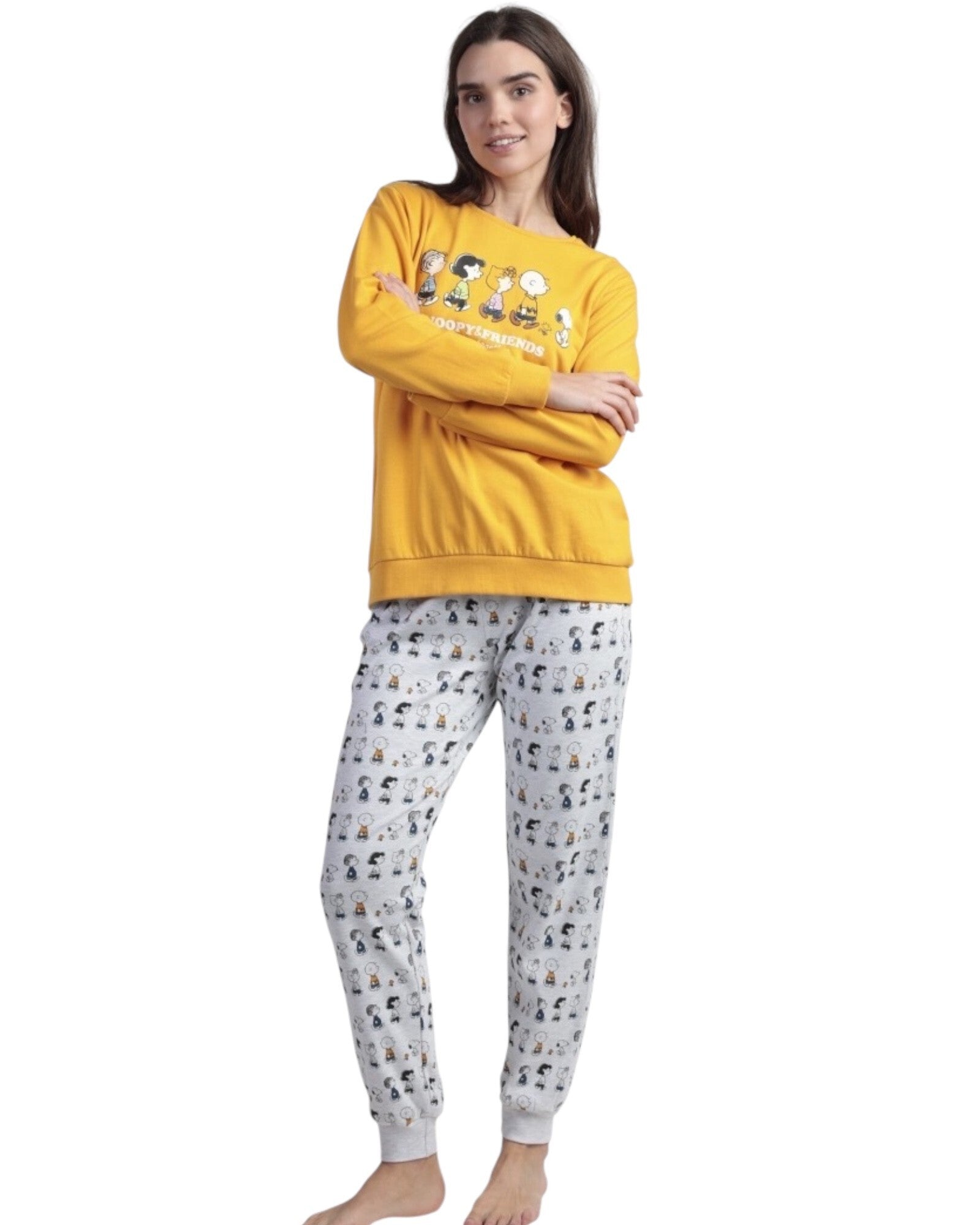 La maglia color senape, ispirata ai mitici Snoopy & Friends, è realizzata in pile di cotone con stampa e dettagli in rilievo, mentre i pantaloni lunghi in maglia interlock con elastico e coulisse assicurano una vestibilità comoda e morbida.