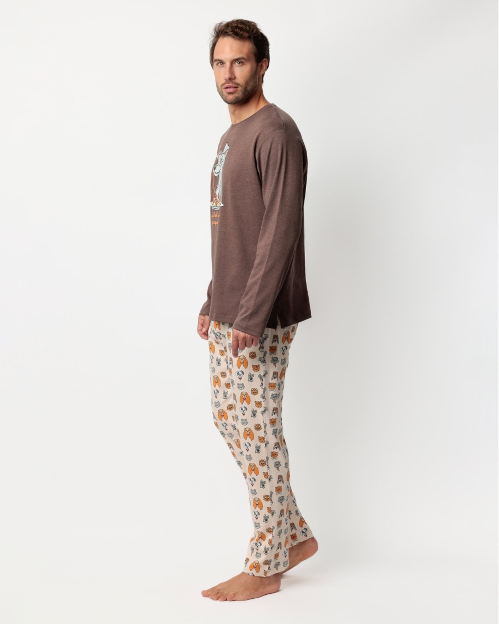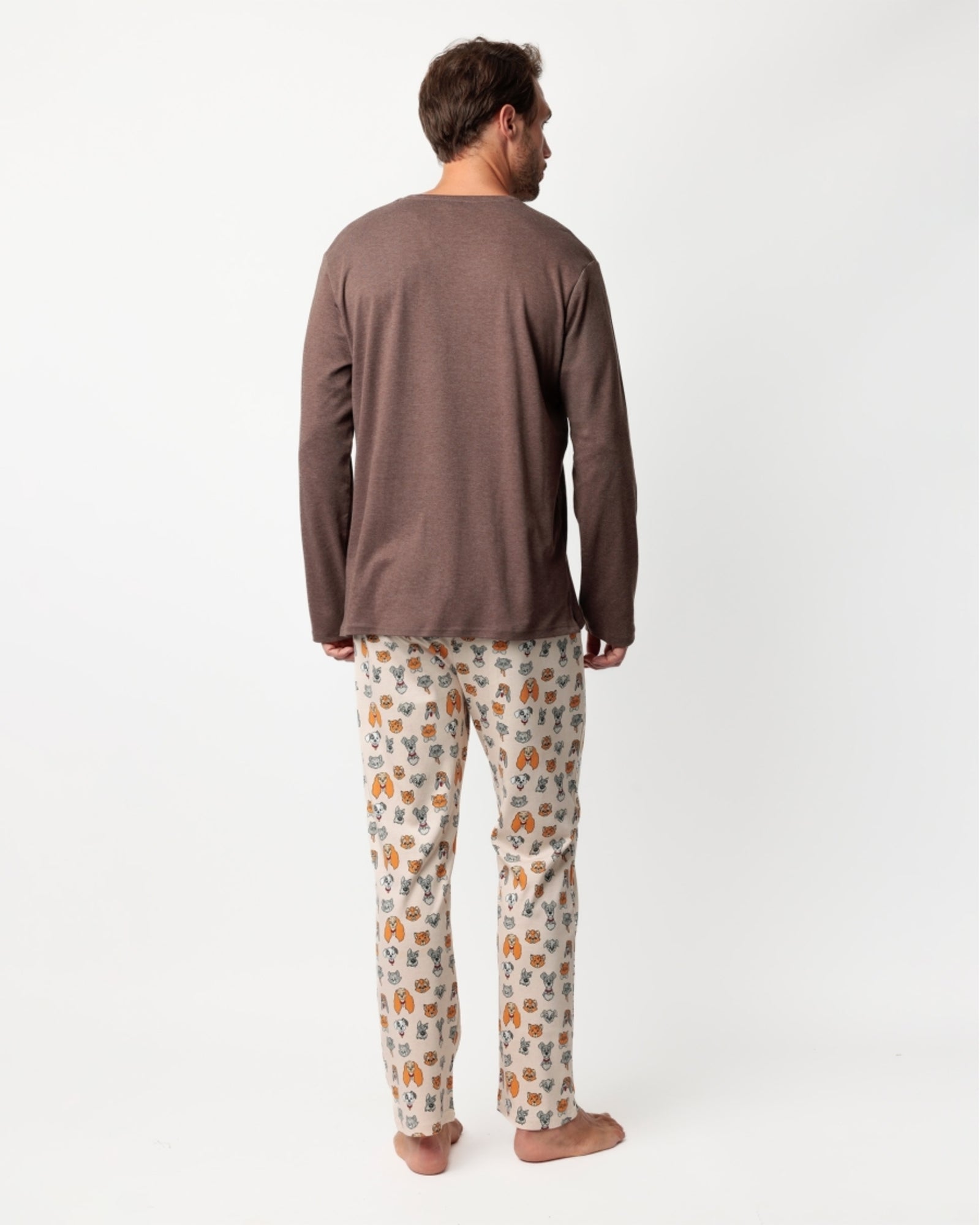 La maglia color cioccolato con stampa esclusiva Disney e i pantaloni in maglia interlock con fantasia all over creano un look rilassato ma curato nei dettagli, ideale per momenti di puro relax.