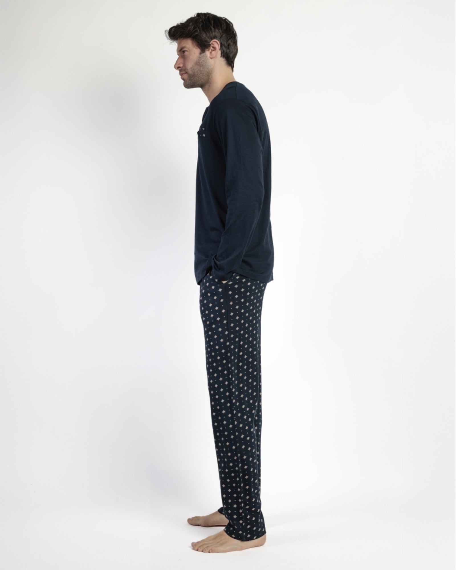 La maglia blu navy con scollo serafino e taschino decorativo esprime l’eleganza discreta della linea Admas Classic, mentre i pantaloni lunghi con coulisse e tasche laterali garantiscono una vestibilità comoda e naturale.