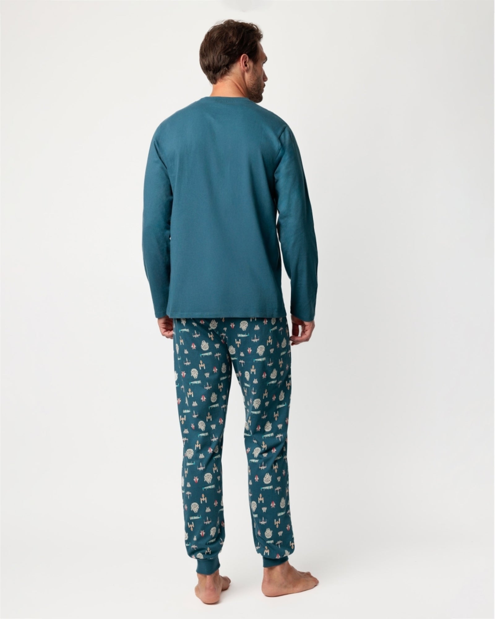 La maglia blu oceano con stampa esclusiva delle astronavi più iconiche e i pantaloni coordinati con fantasia all over uniscono stile e comfort in un capo perfetto per la stagione fredda.