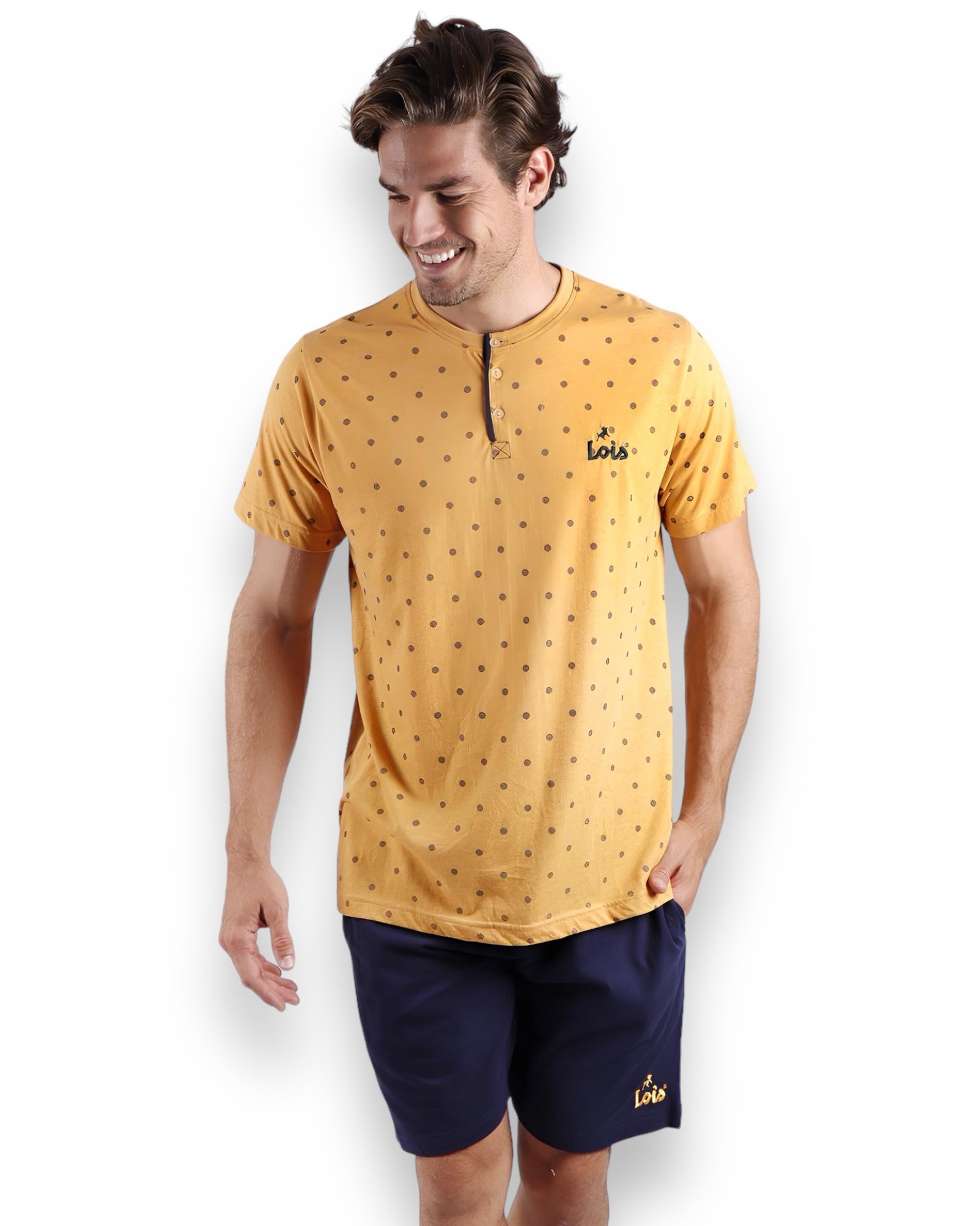 Pigiama Uomo in cotone a maniche corte e pantaloncino corto. La T-shirt a maniche corte, girocollo con abbottonatura, con stampa a pois e dettagli ricamati. Pantaloncini con tasche, cintura regolabile e dettaglio ricamato. Tessuto morbido al tatto confezionato in scatola