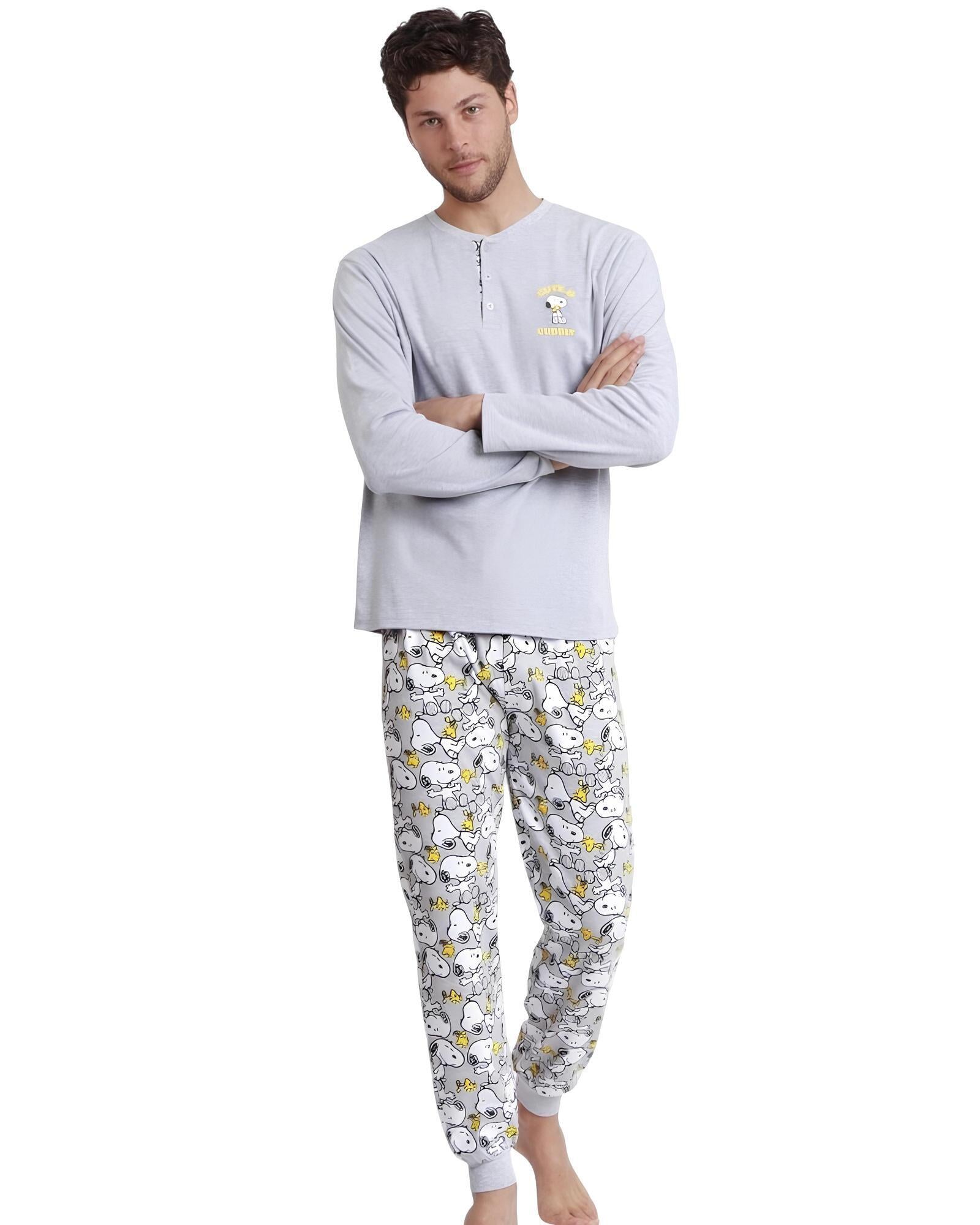 Il pigiama uomo Peanuts Art. 62014 è realizzato in caldo cotone interlock, morbido e traspirante, con maglia grigio mélange decorata da Snoopy e Woodstock.