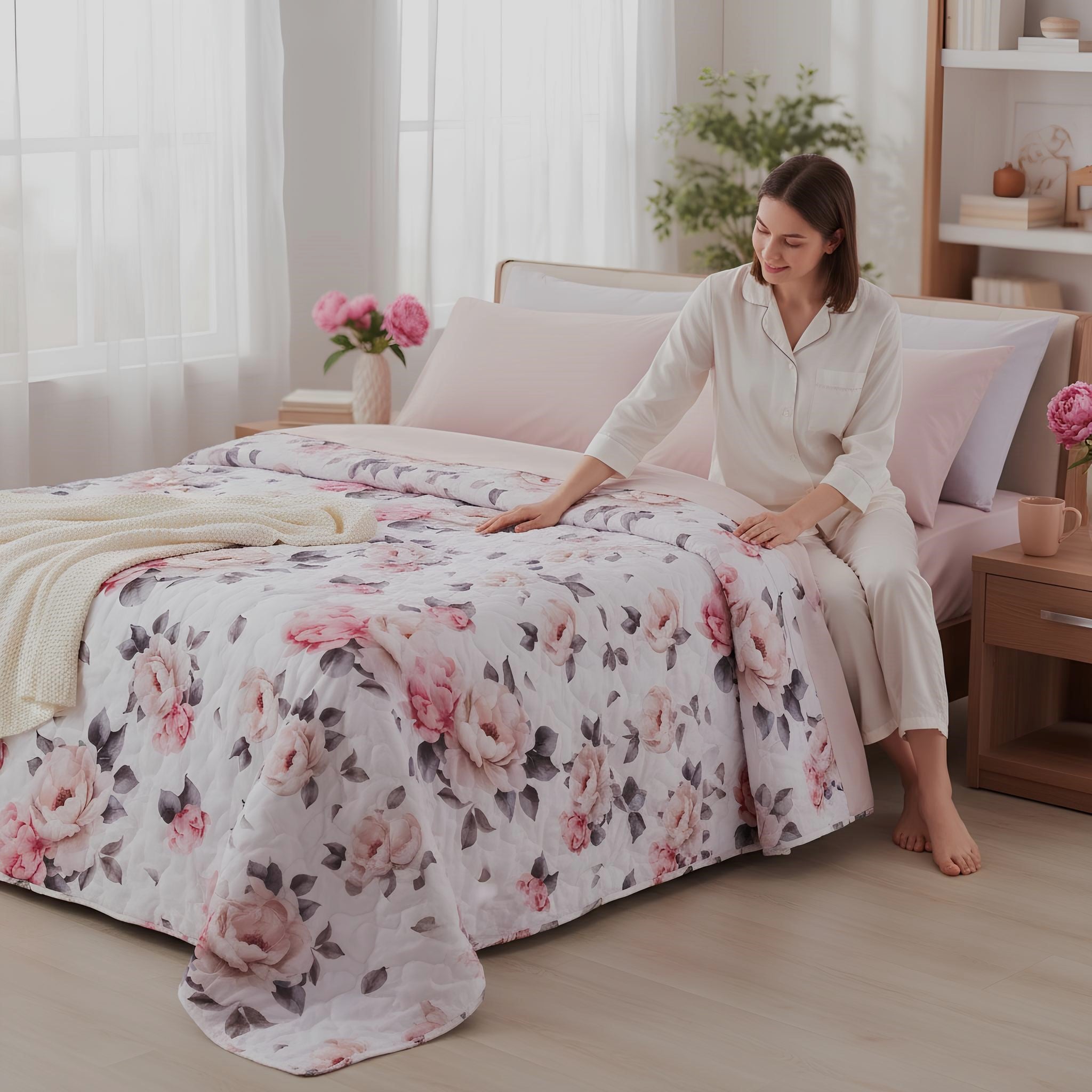 La stampa digitale floreale con peonie nei toni del rosa su fondo color ghiaccio aggiunge un tocco romantico e raffinato alla camera da letto.