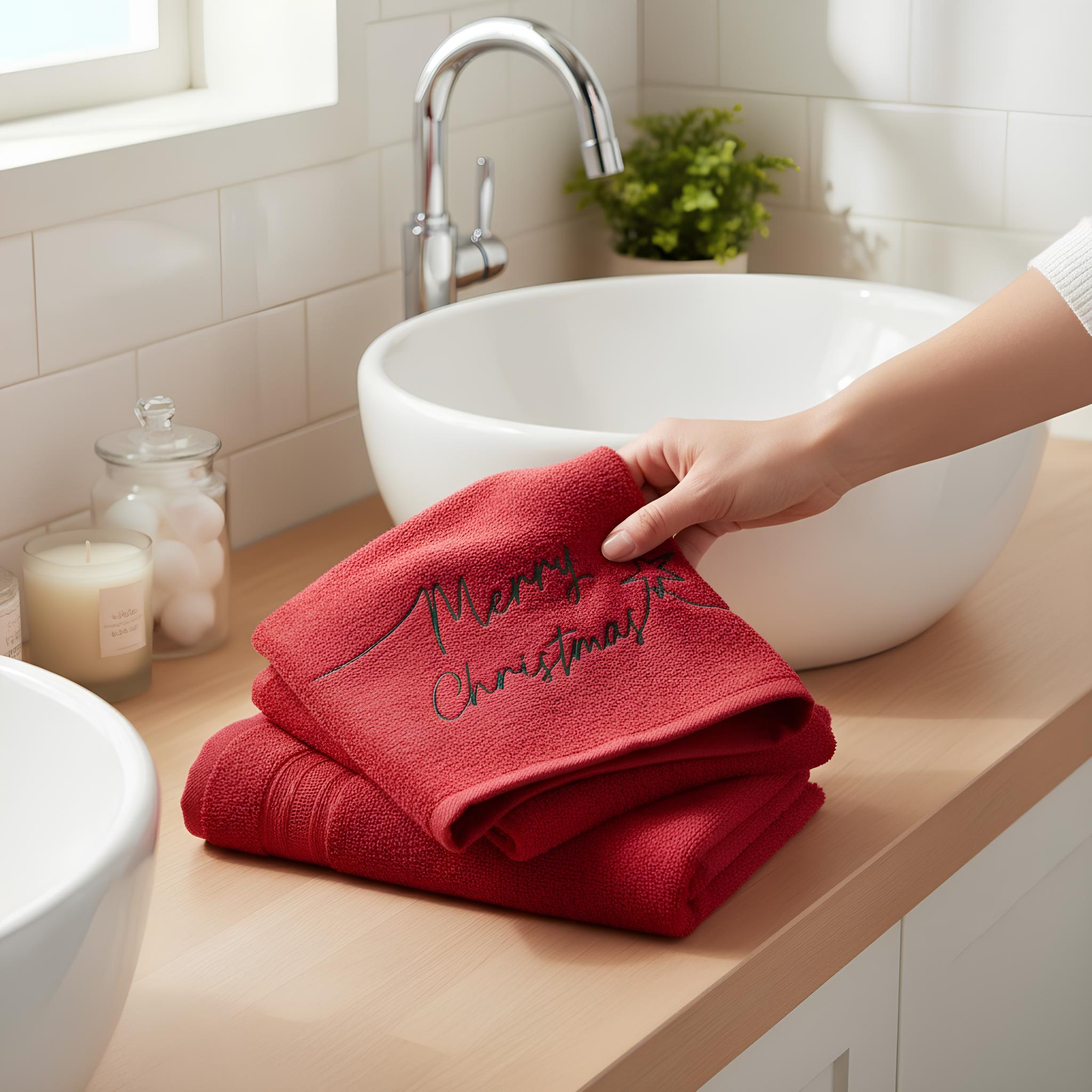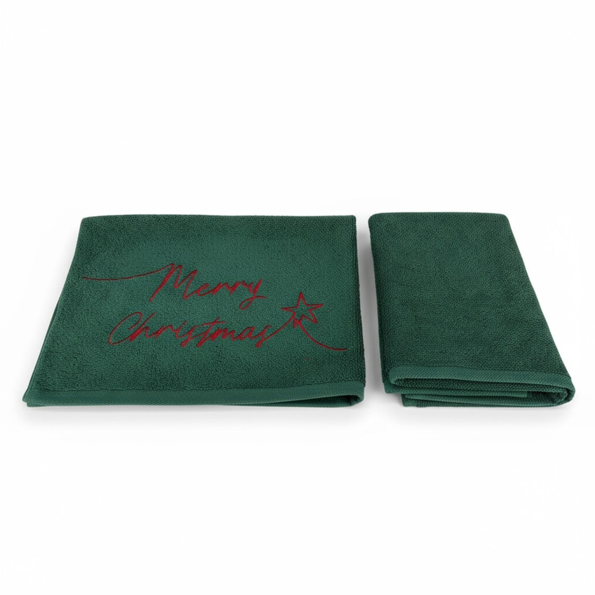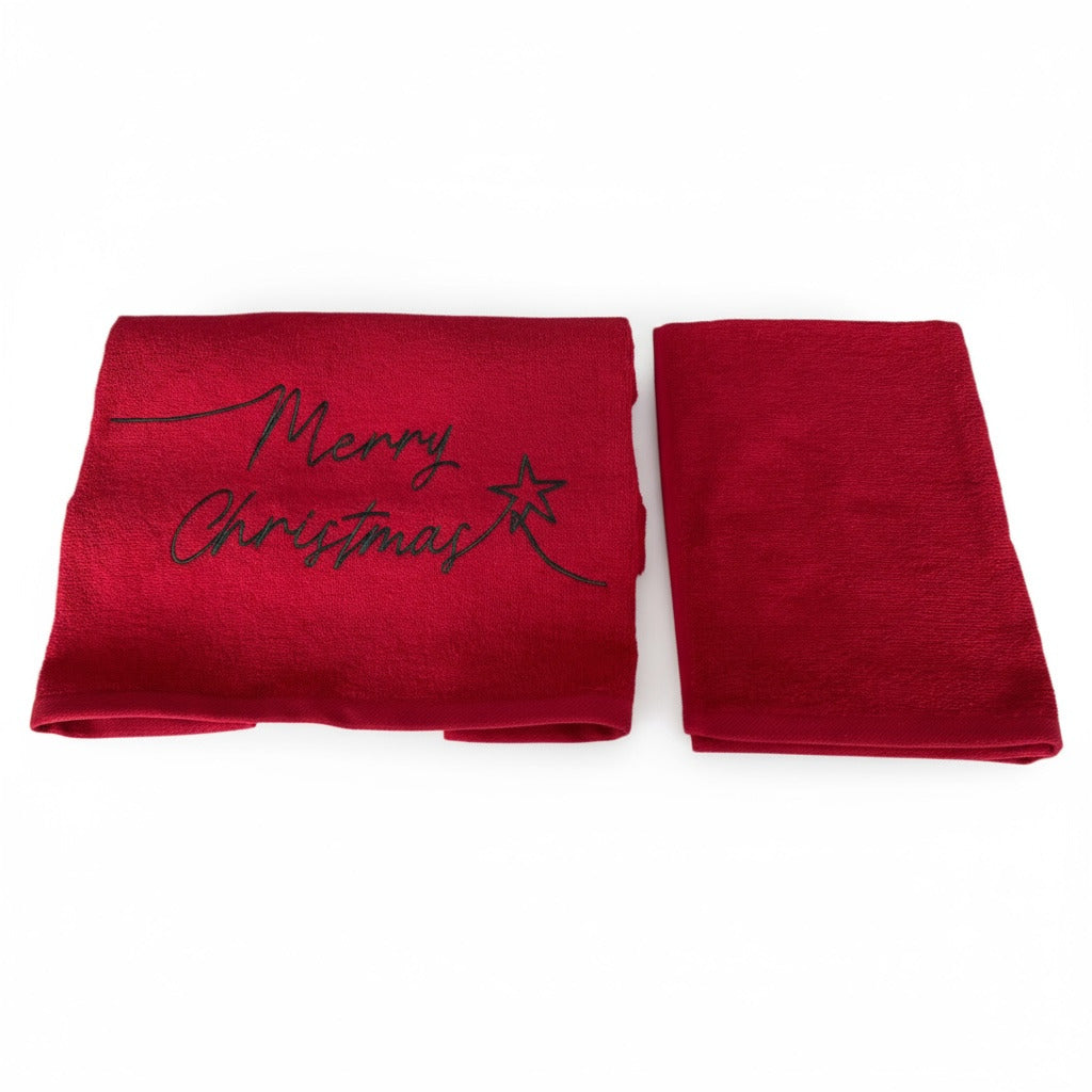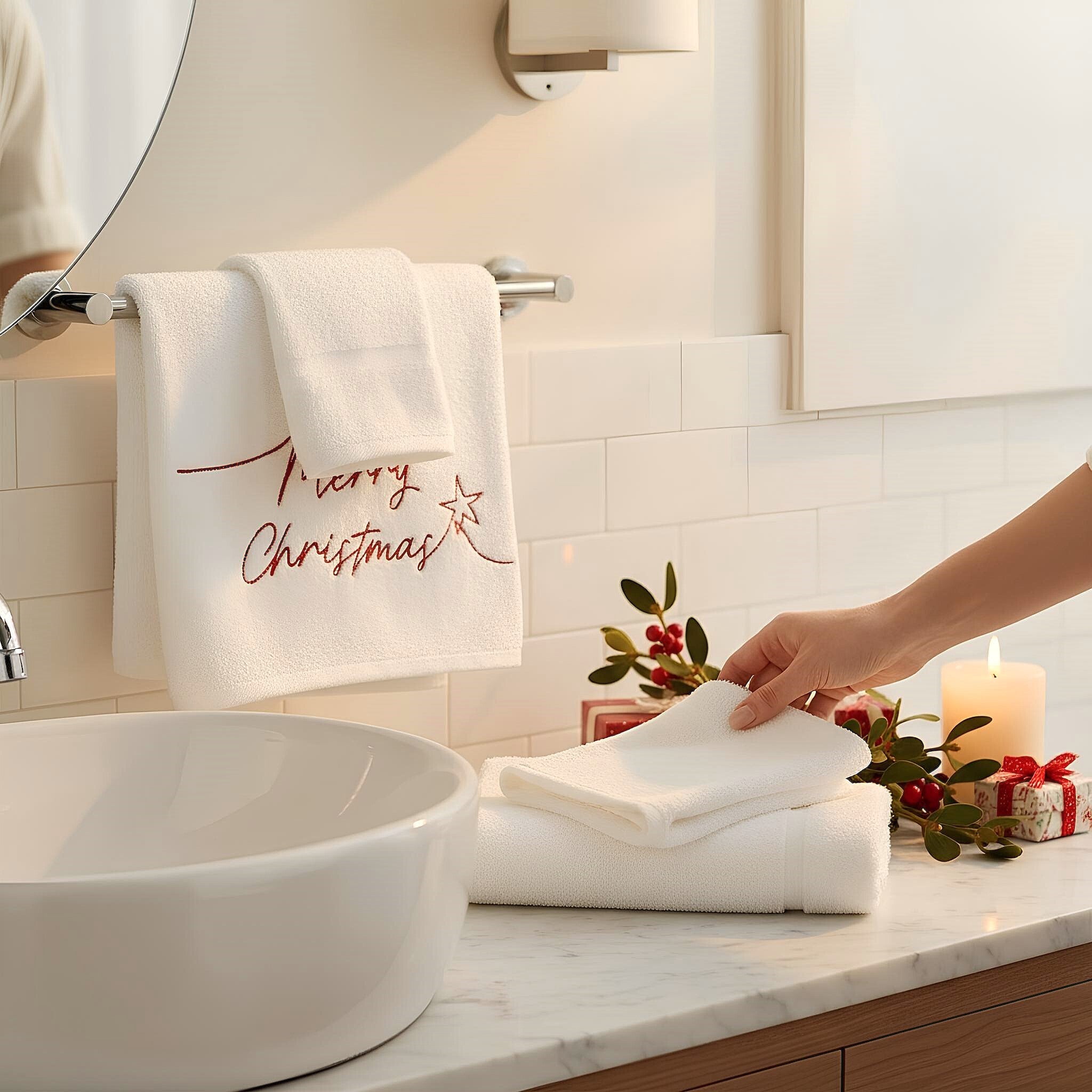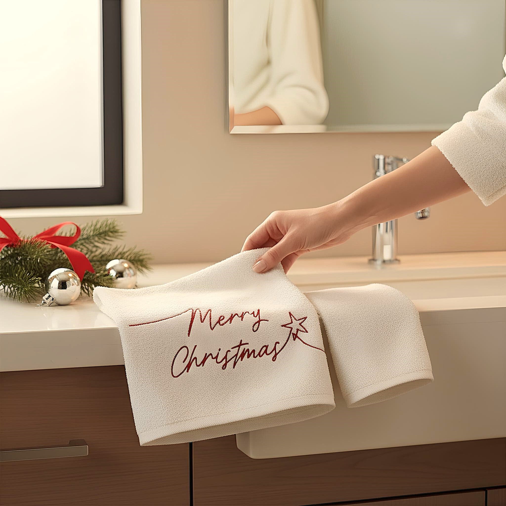🎄 Set 2 asciugamani natalizi – Composto da 1 asciugamano viso (60x104 cm) ricamato e 1 ospite (58x38 cm) in tinta unita.