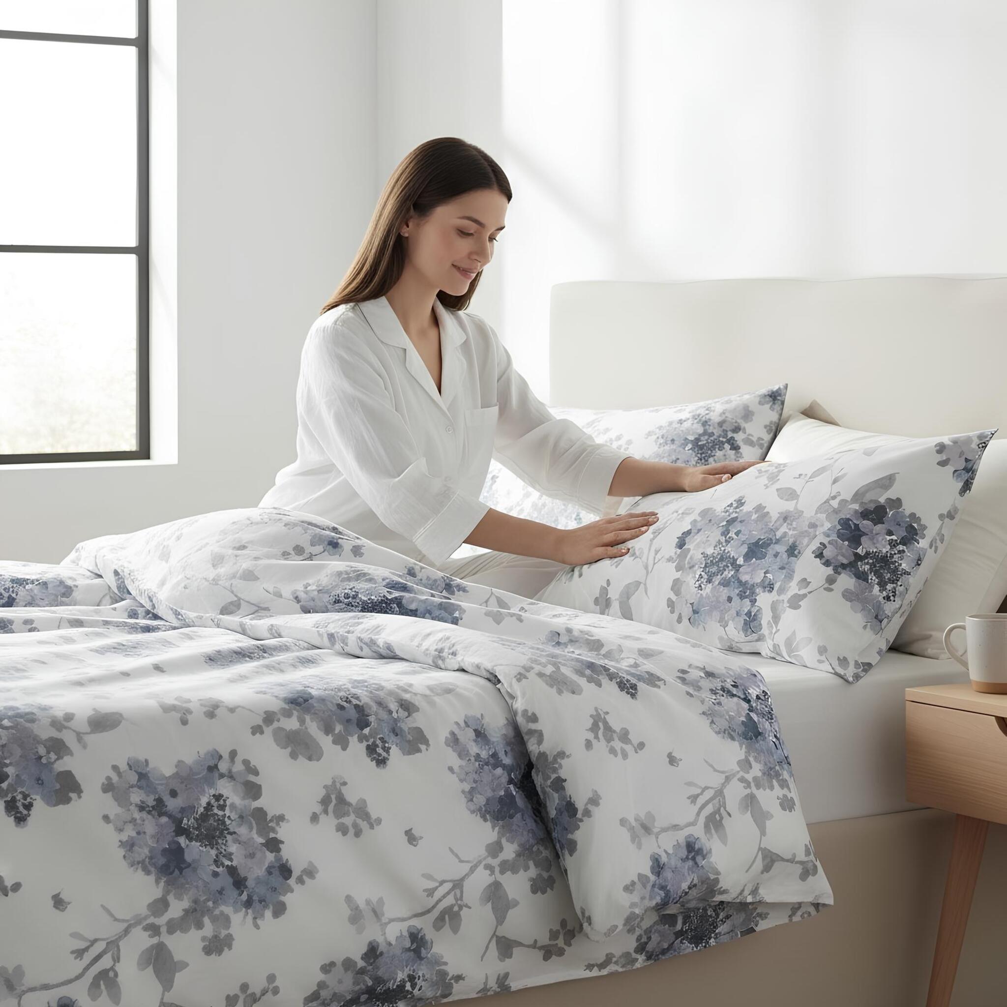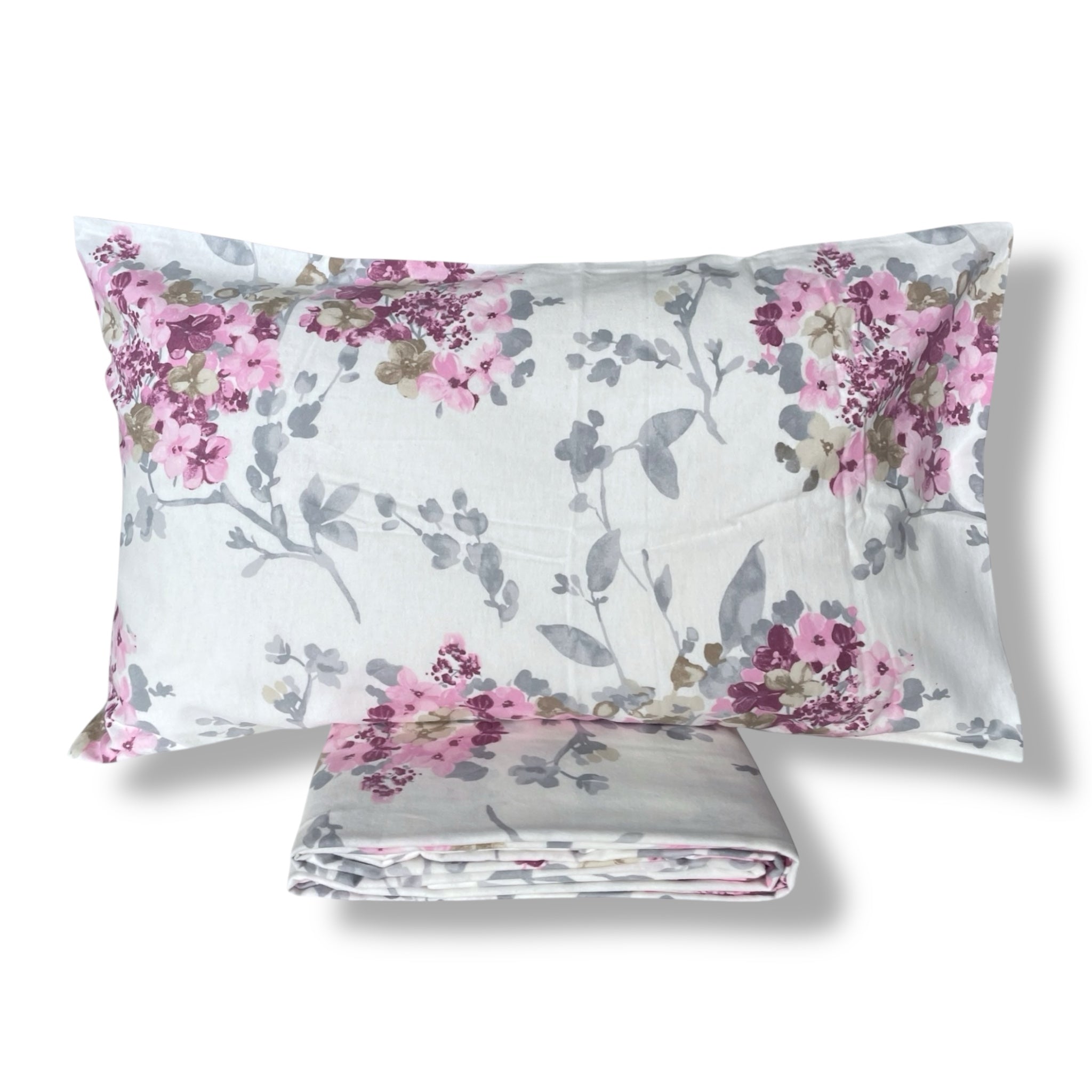 Realizzato in 100% flanella di cotone, questo set unisce morbidezza, calore e qualità. La stampa floreale delicata, nei toni azzurro o rosa, regala un tocco elegante e rilassante alla camera da letto.