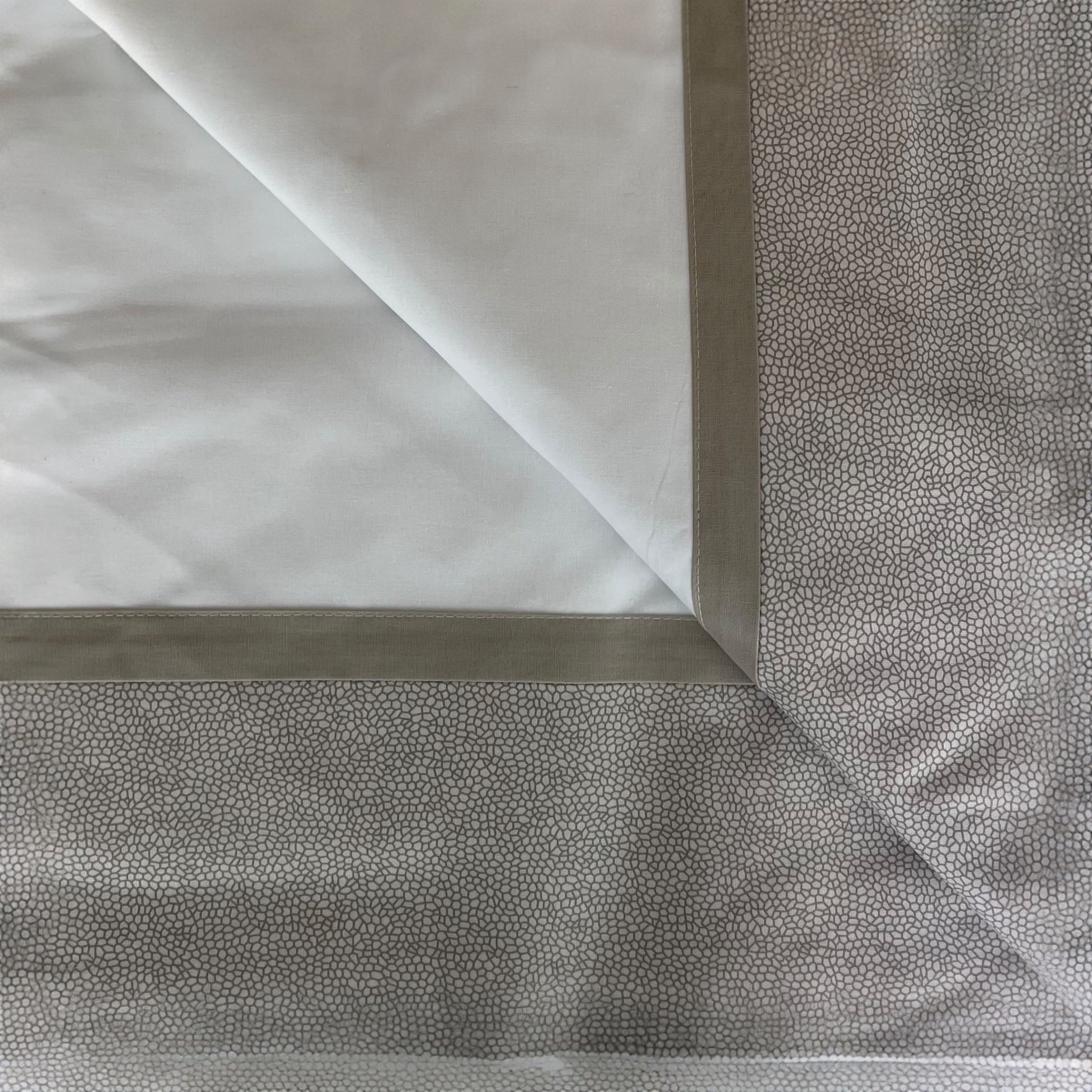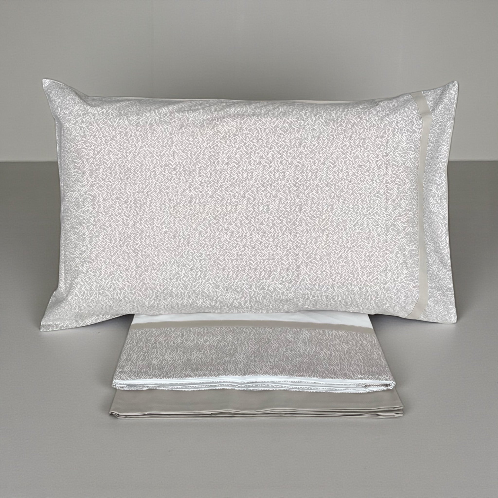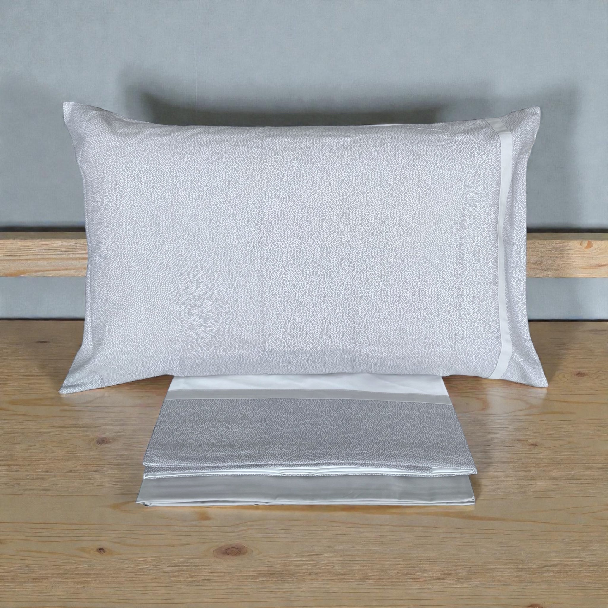 Il protagonista del design è il lenzuolo superiore con balza applicata stampata, studiata per creare un raffinato effetto copriletto, capace di valorizzare il letto anche senza l’aggiunta di ulteriori elementi decorativi. Il lenzuolo inferiore con angoli è in tinta unita, per un perfetto equilibrio tra estetica e praticità.