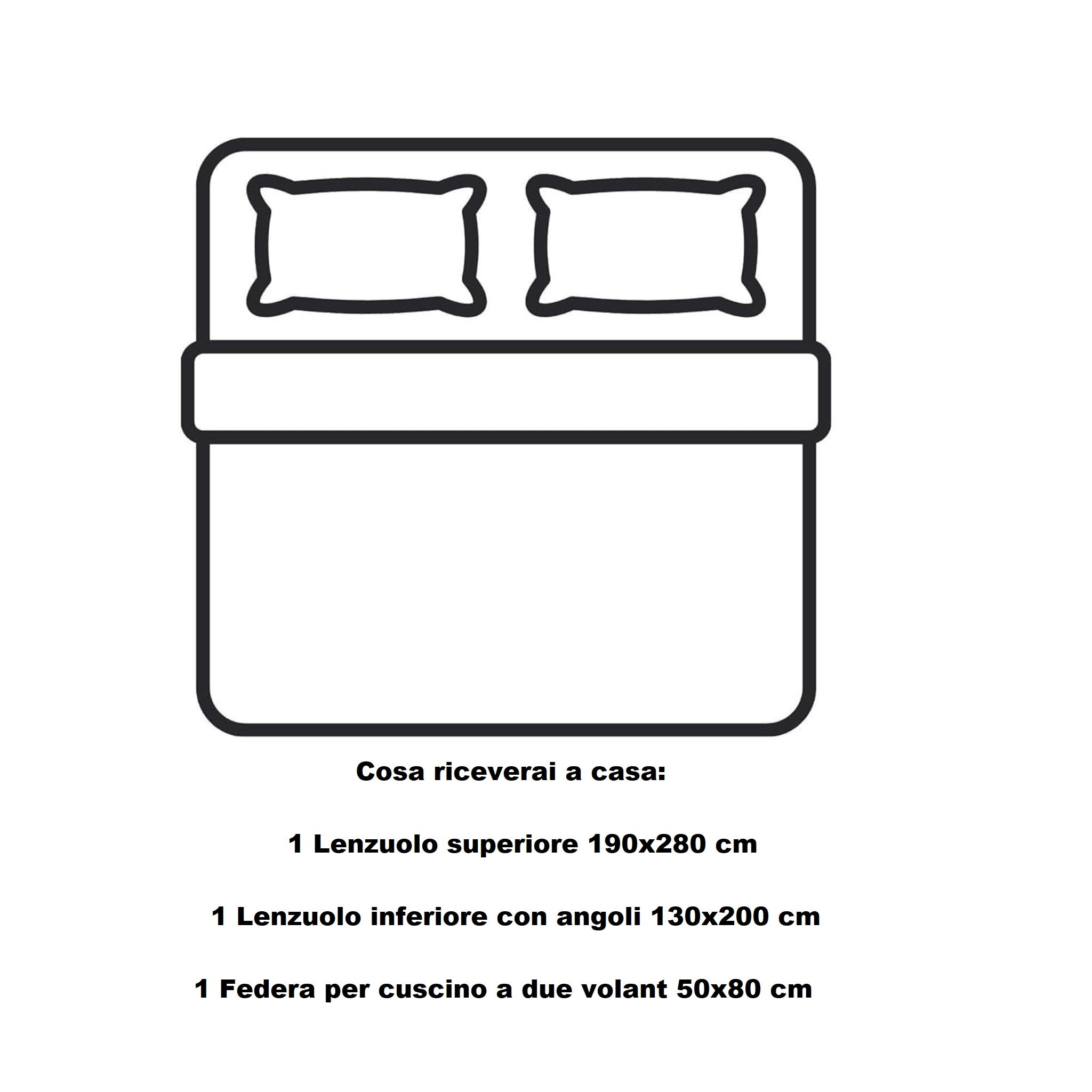 🛏️ Misura piazza e mezza: lenzuolo sopra 190x280 cm, sotto con angoli 130x200 cm e federa 50x80 cm