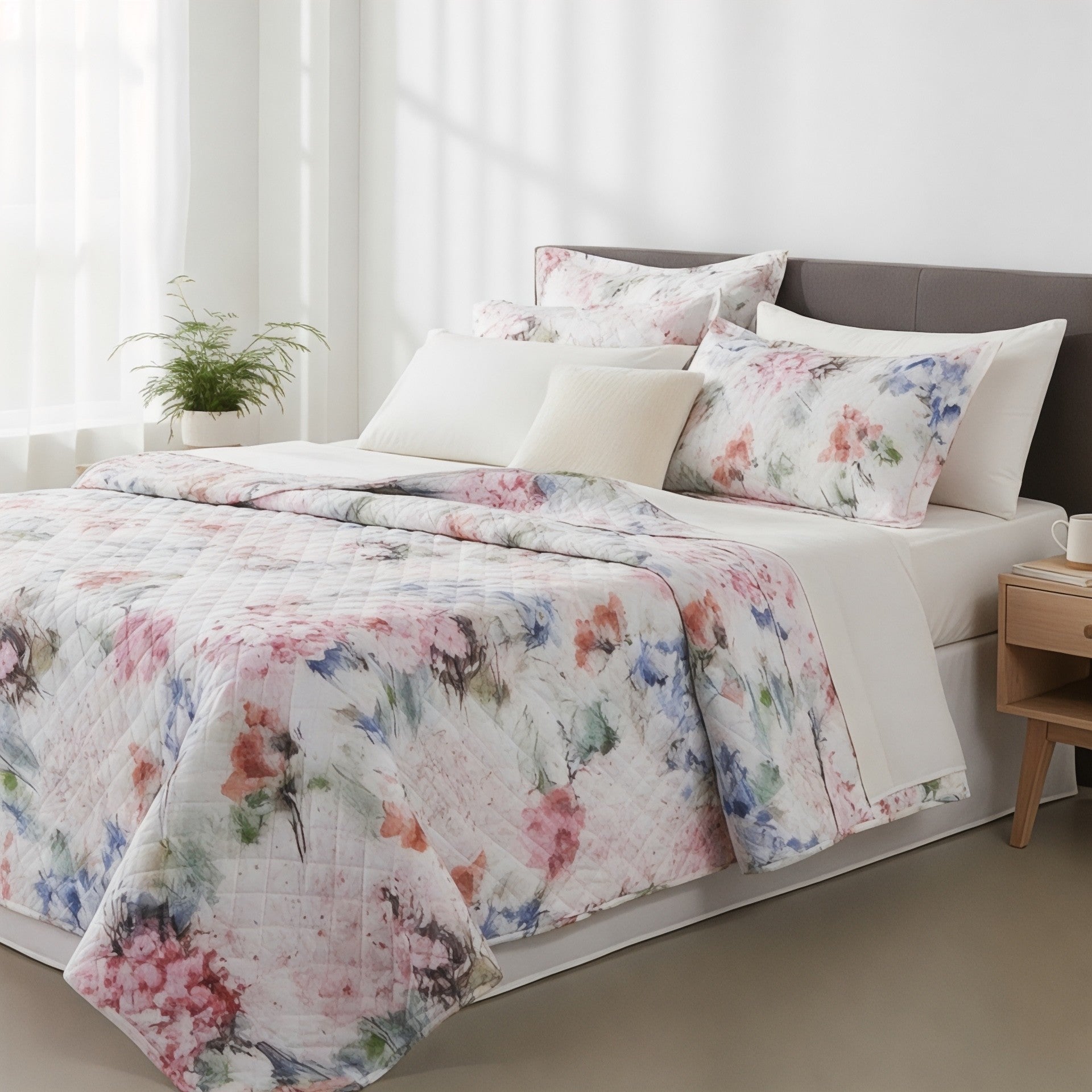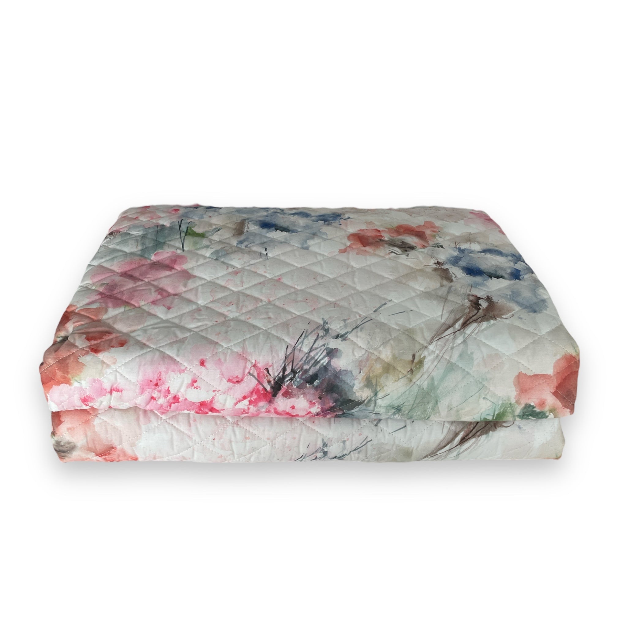 Realizzato in pregiato percalle di puro cotone 100%, si distingue per la stampa floreale acquerellata dai toni delicati e per la trapuntatura a rombi con angoli stondati.