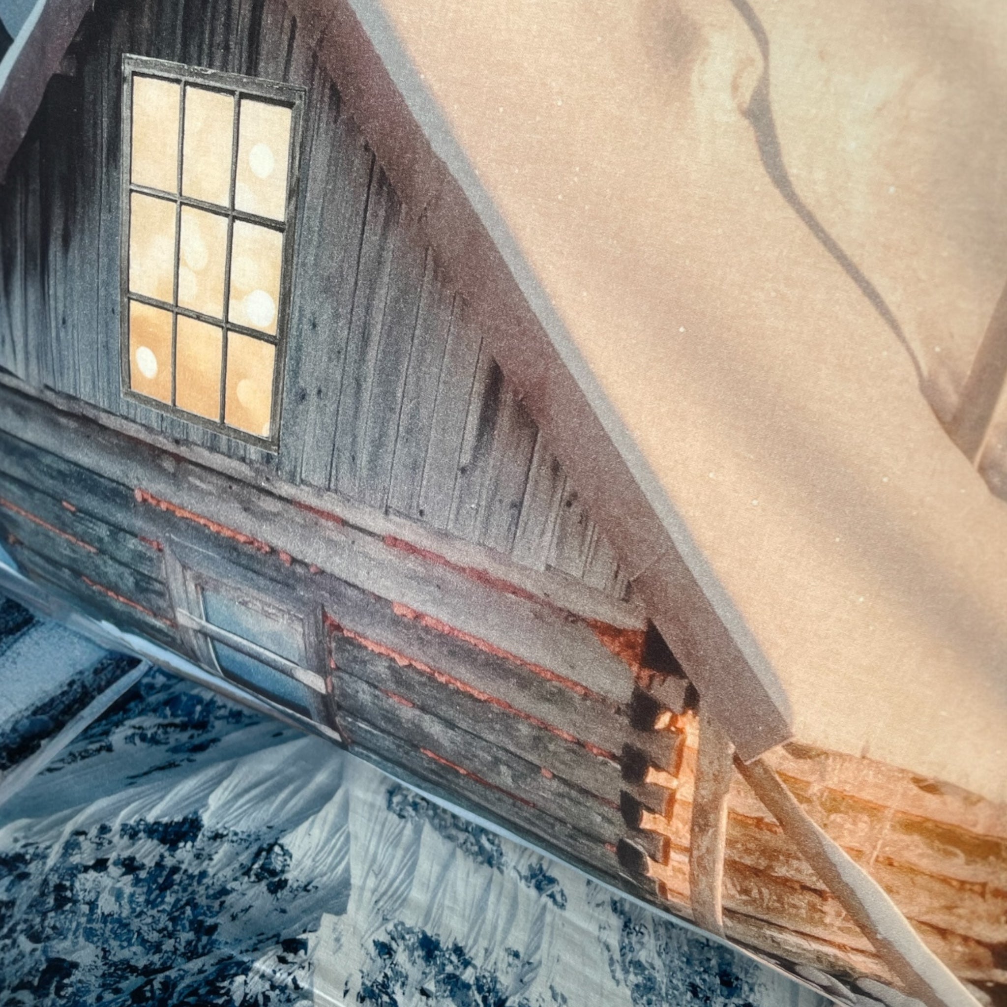 La stampa digitale ad alta definizione raffigura uno chalet di montagna illuminato dalla luna, con paesaggi innevati e boschi suggestivi, per un effetto realistico e avvolgente.