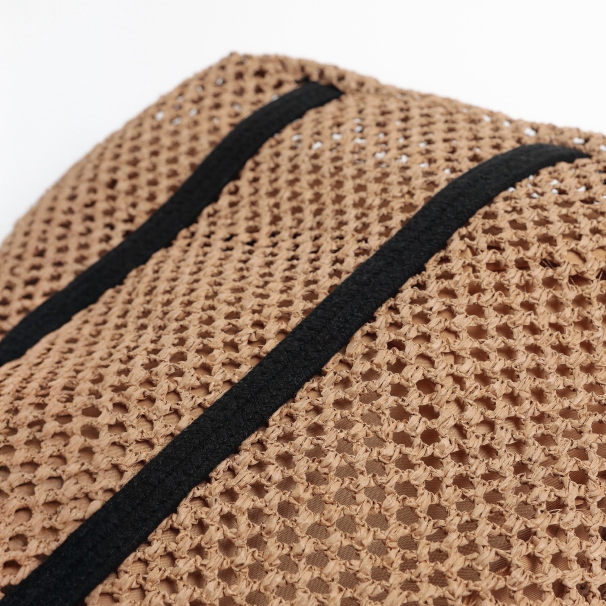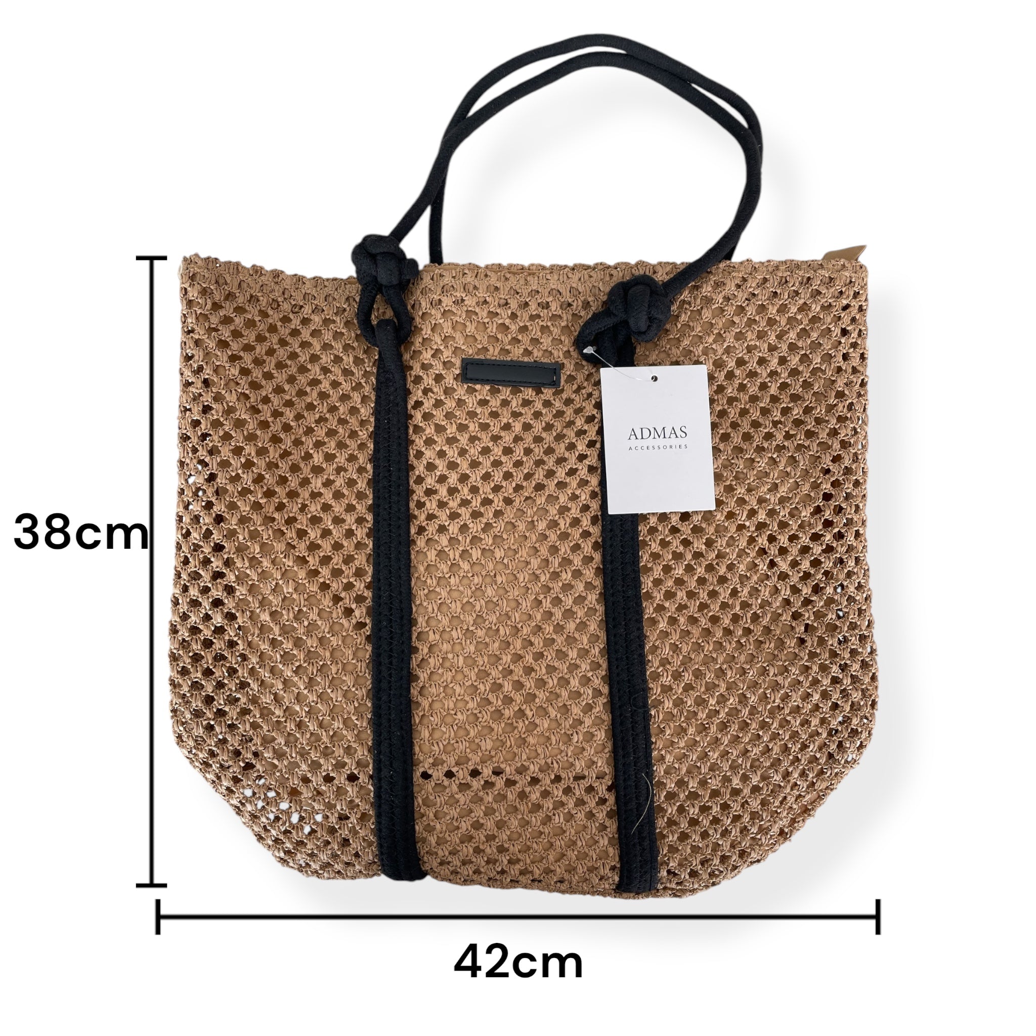 Questa borsa in cellulosa si distingue per il suo design intrecciato a rete, che le conferisce un aspetto naturale e sofisticato. Il colore beige caldo si abbina perfettamente ai manici in corda nera, creando un contrasto elegante e moderno