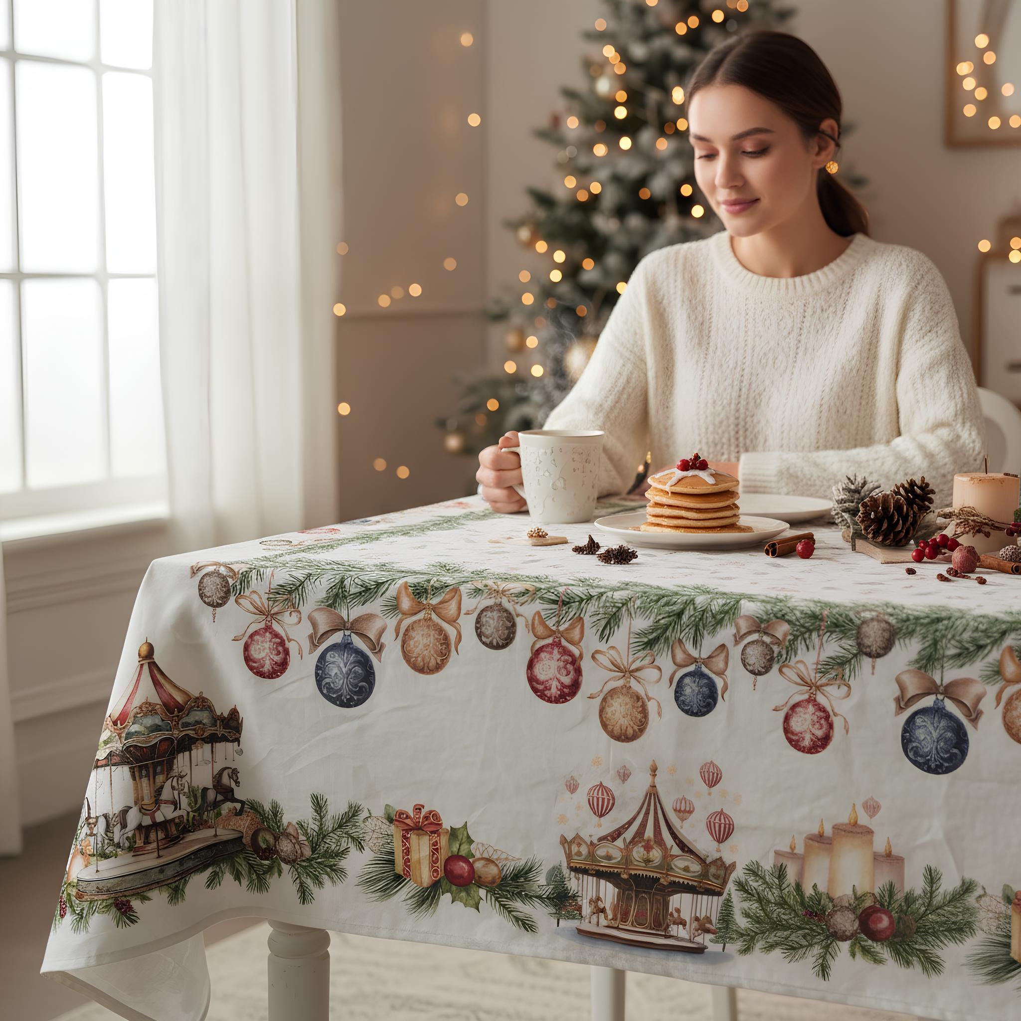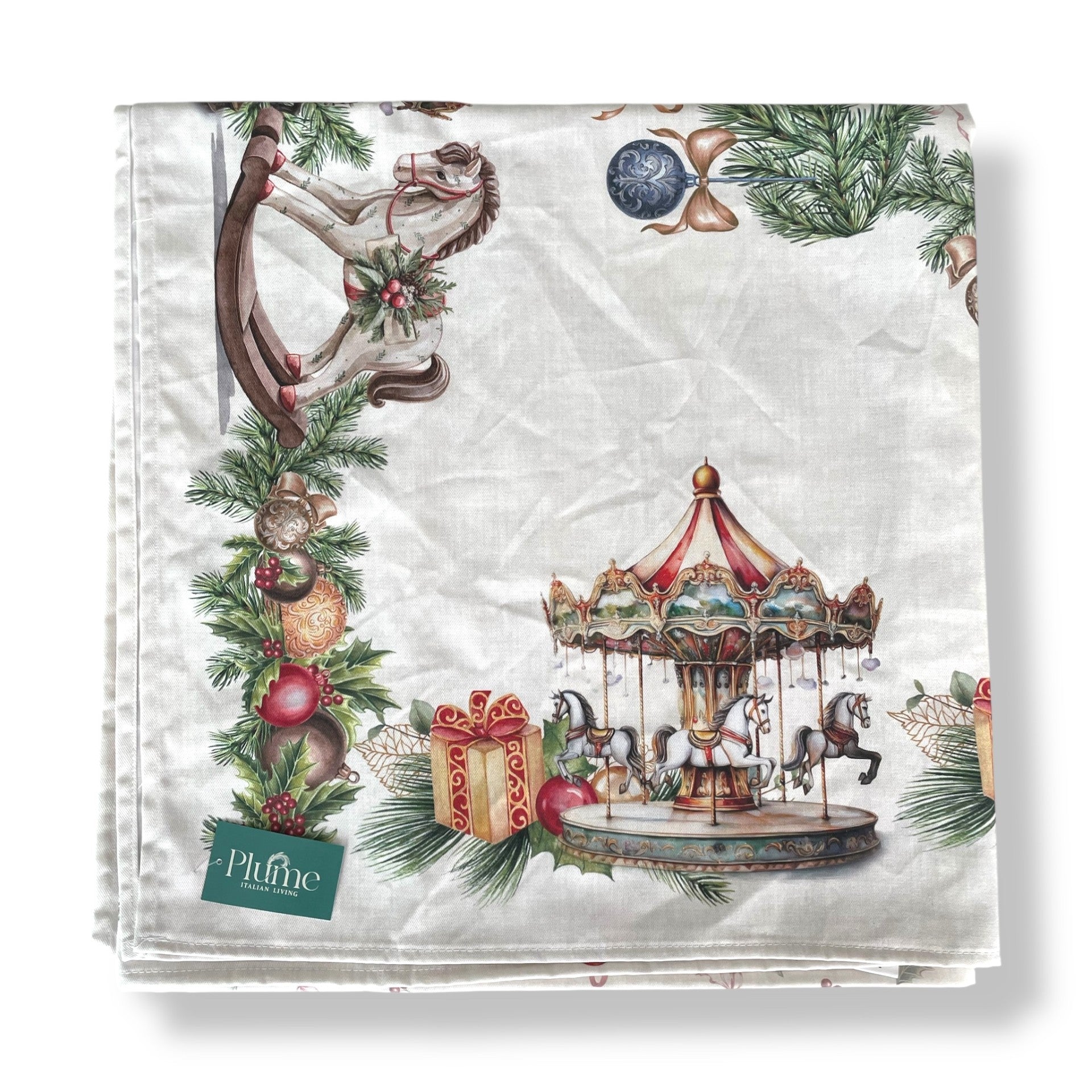 La stampa digitale sublimatica ad alta definizione regala colori vivi e dettagli straordinari: cavalli a dondolo, giostre, palline e ghirlande natalizie che evocano la poesia del Natale più tradizionale, reinterpretata in chiave raffinata e luminosa.