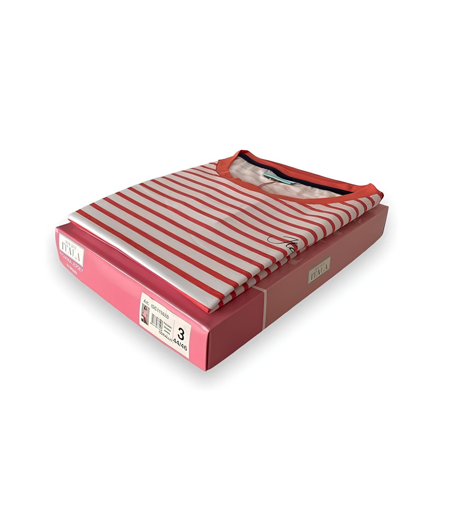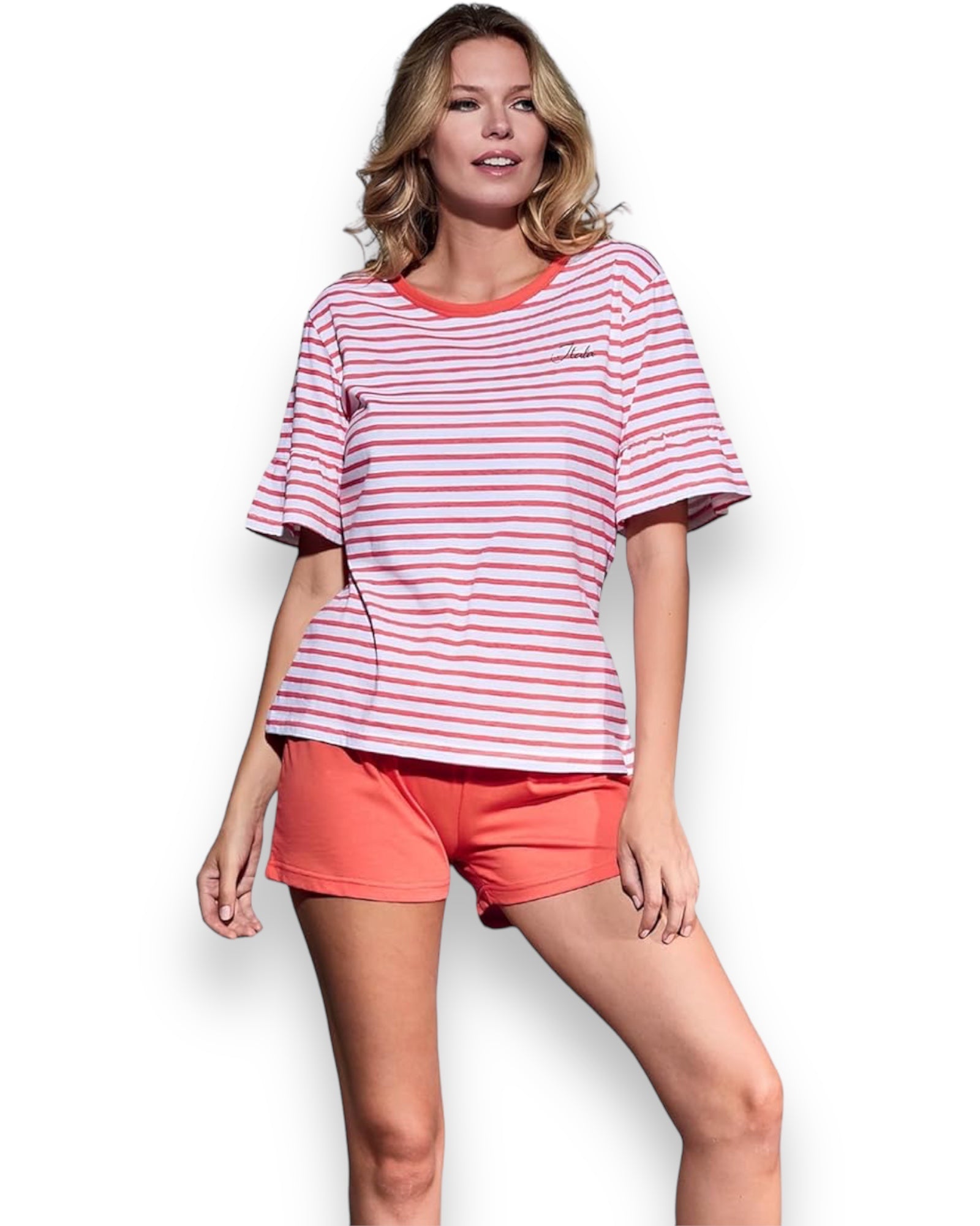Pigiama Itala dalla stampa moderna e fresca, realizzato in tessuto 100% Cotone che lo rende compatto e morbido all’indosso. Maglia a mezze maniche modello girocollo e pantaloncino corto. Confezionato in scatola
