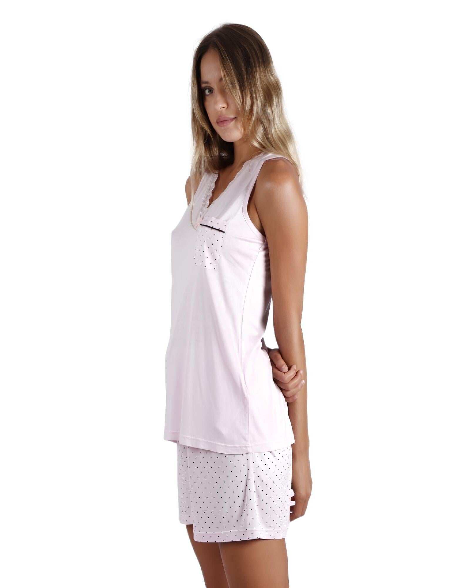 Pigiama Donna a giromanica e shorts. La maglia con scollo a V a giromanica con spalla larga presenta dettagli ricamati e in pizzo. Gli shorts con cintura regolabile e motivo a pois stampato. Tessuto fresco e morbido al tatto. Confezionato in una bellissima scatola personalizzata Admas
