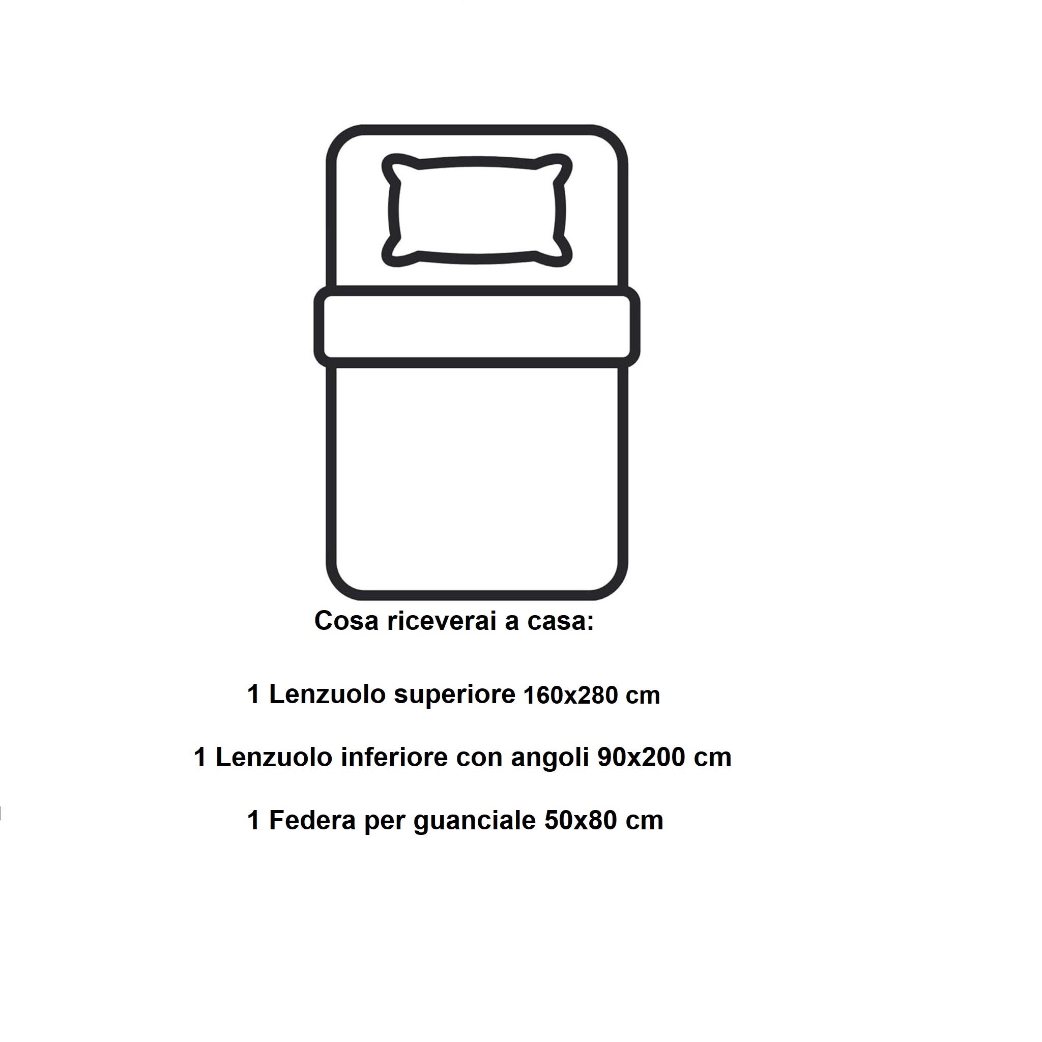 🛌 Set completo per letto singolo (1 piazza): lenzuolo sopra 160x280 cm + sotto con angoli 90x200 cm + federa 50x80 cm