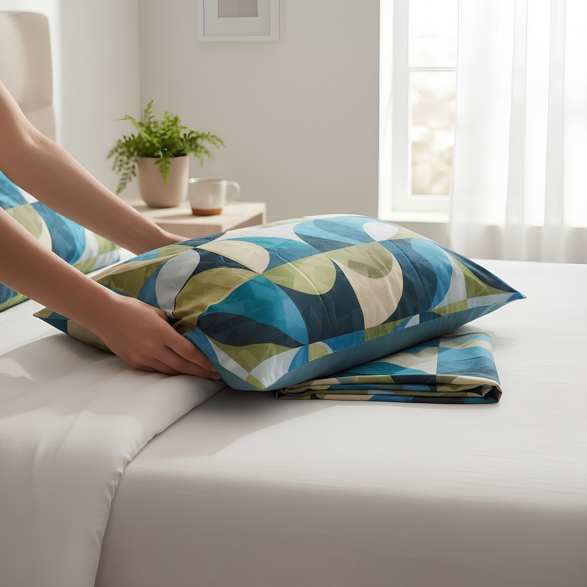 La fantasia geometrica blu e verde dona alla camera da letto un tocco contemporaneo e raffinato.