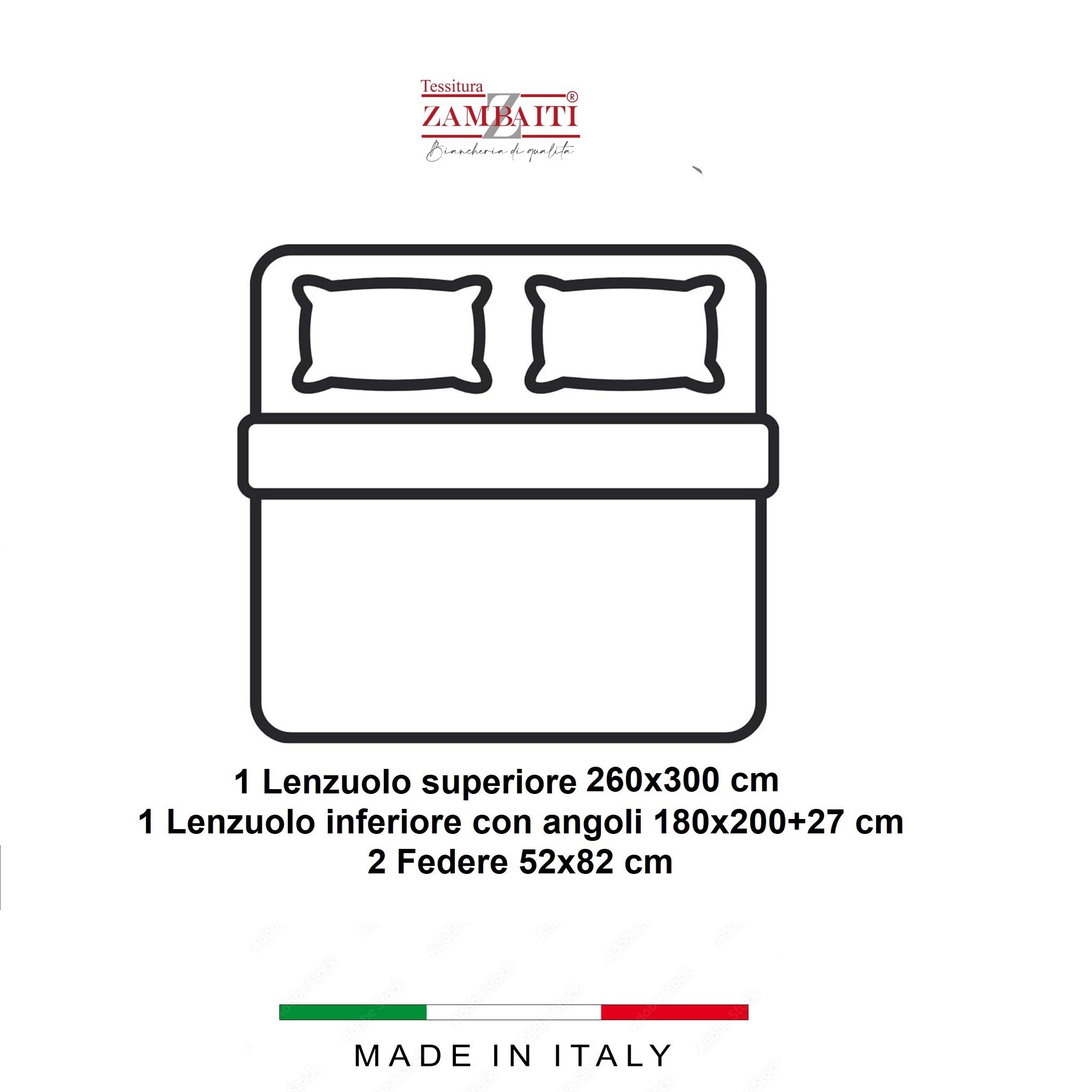 🛏️ Set completo matrimoniale: lenzuolo sopra 260x300 cm, sotto con angoli 180x200+27 cm, 2 federe 52x82 cm