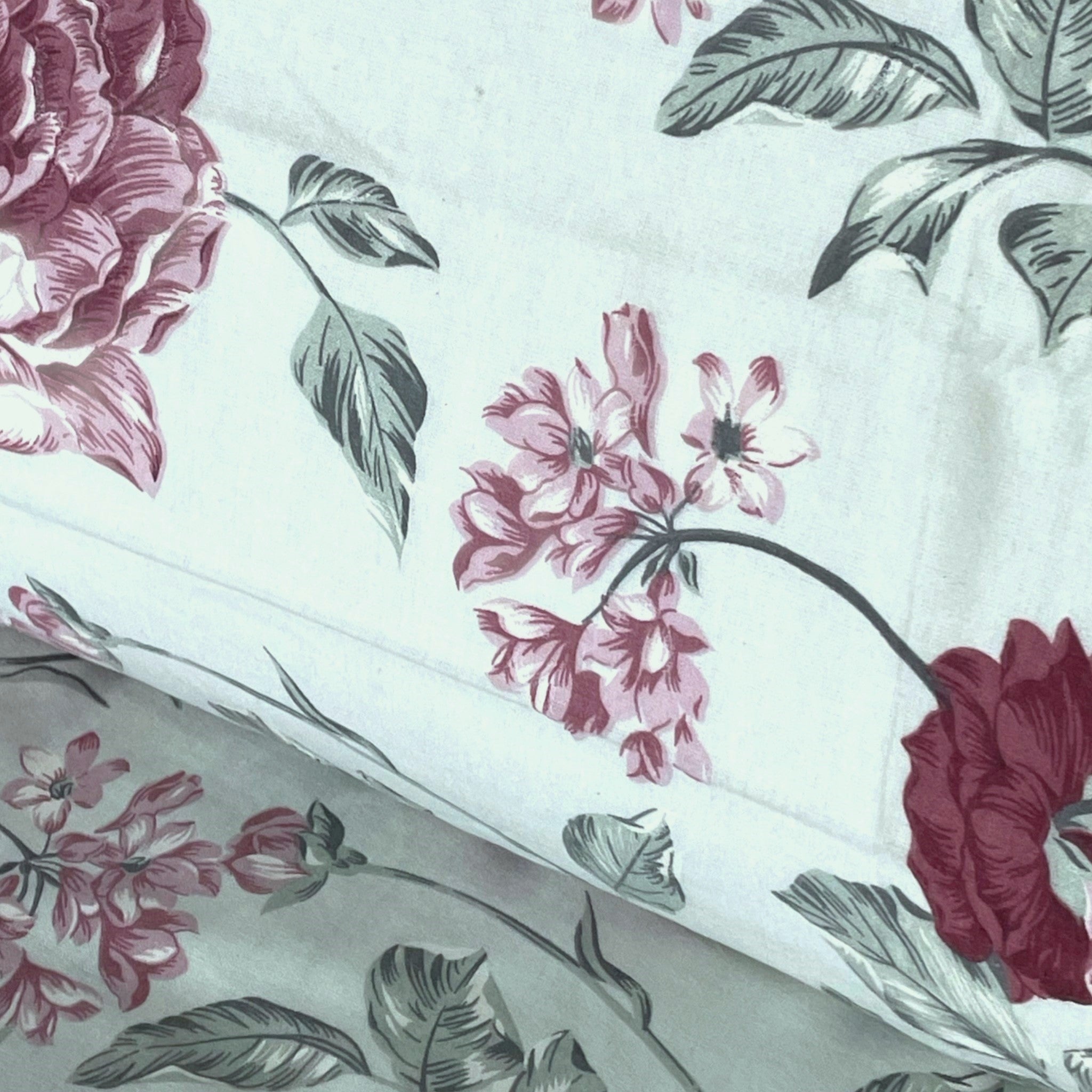 La fantasia floreale nei toni del verde salvia dona eleganza e armonia alla camera da letto, mentre il lenzuolo inferiore abbinato completa l’insieme con uno stile coordinato e raffinato.