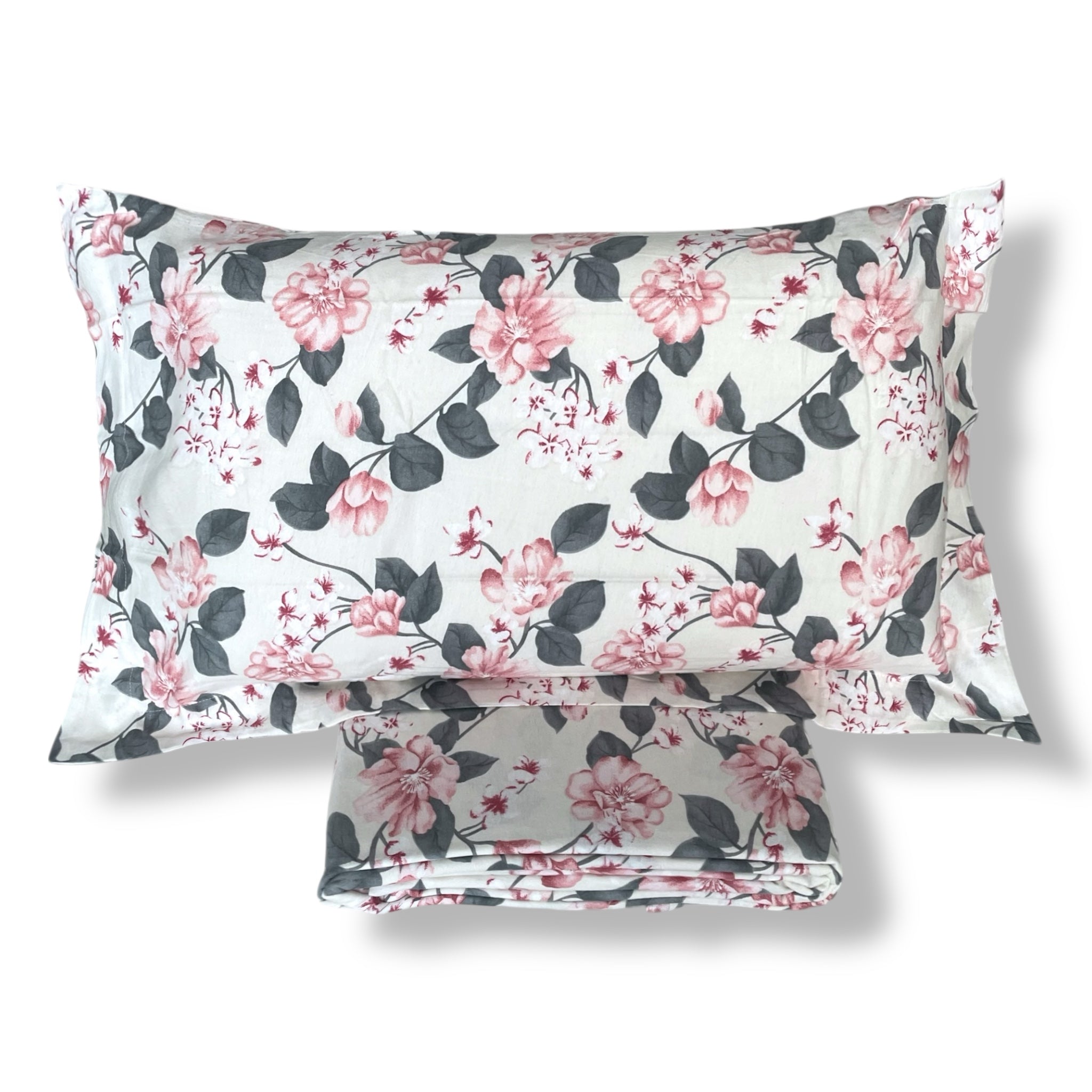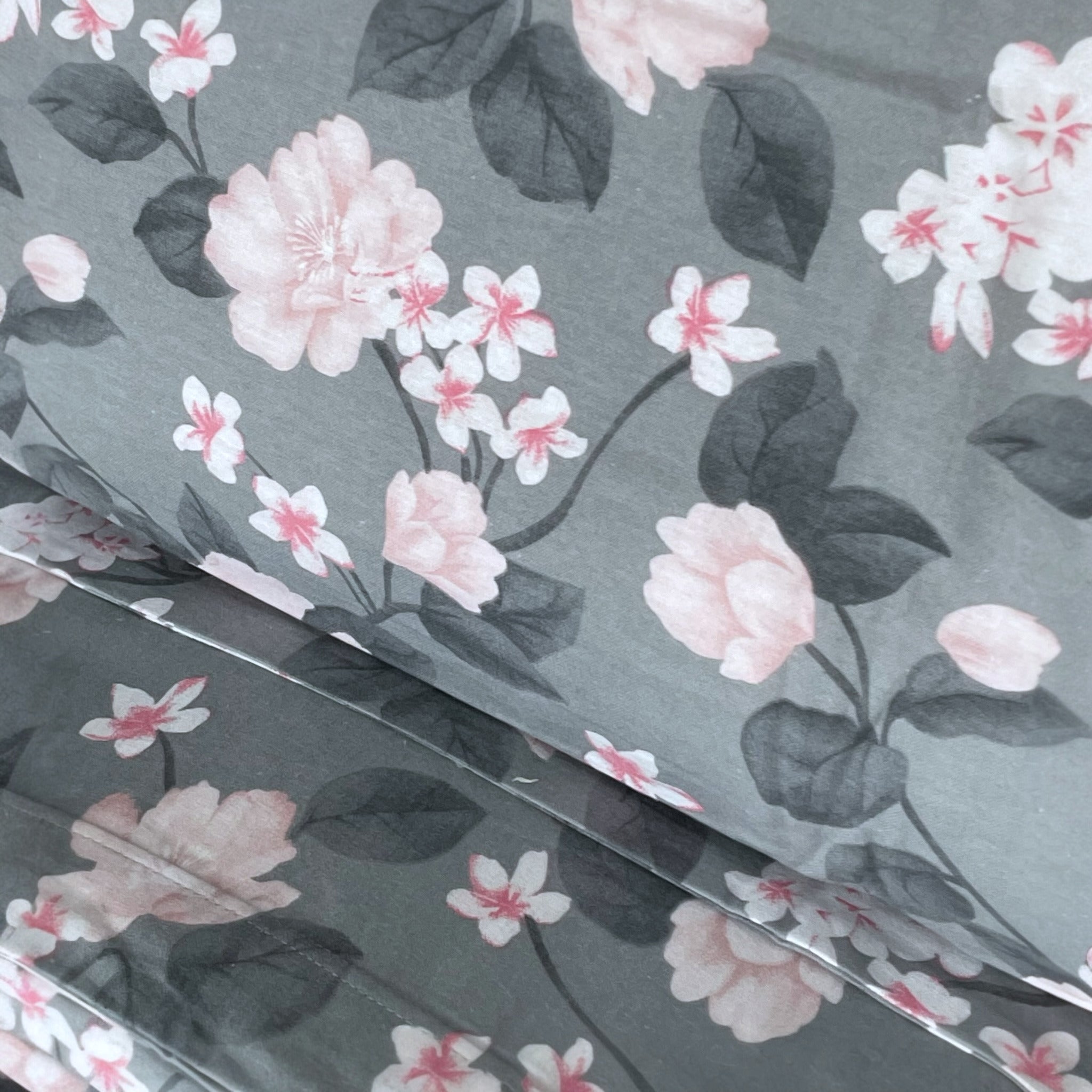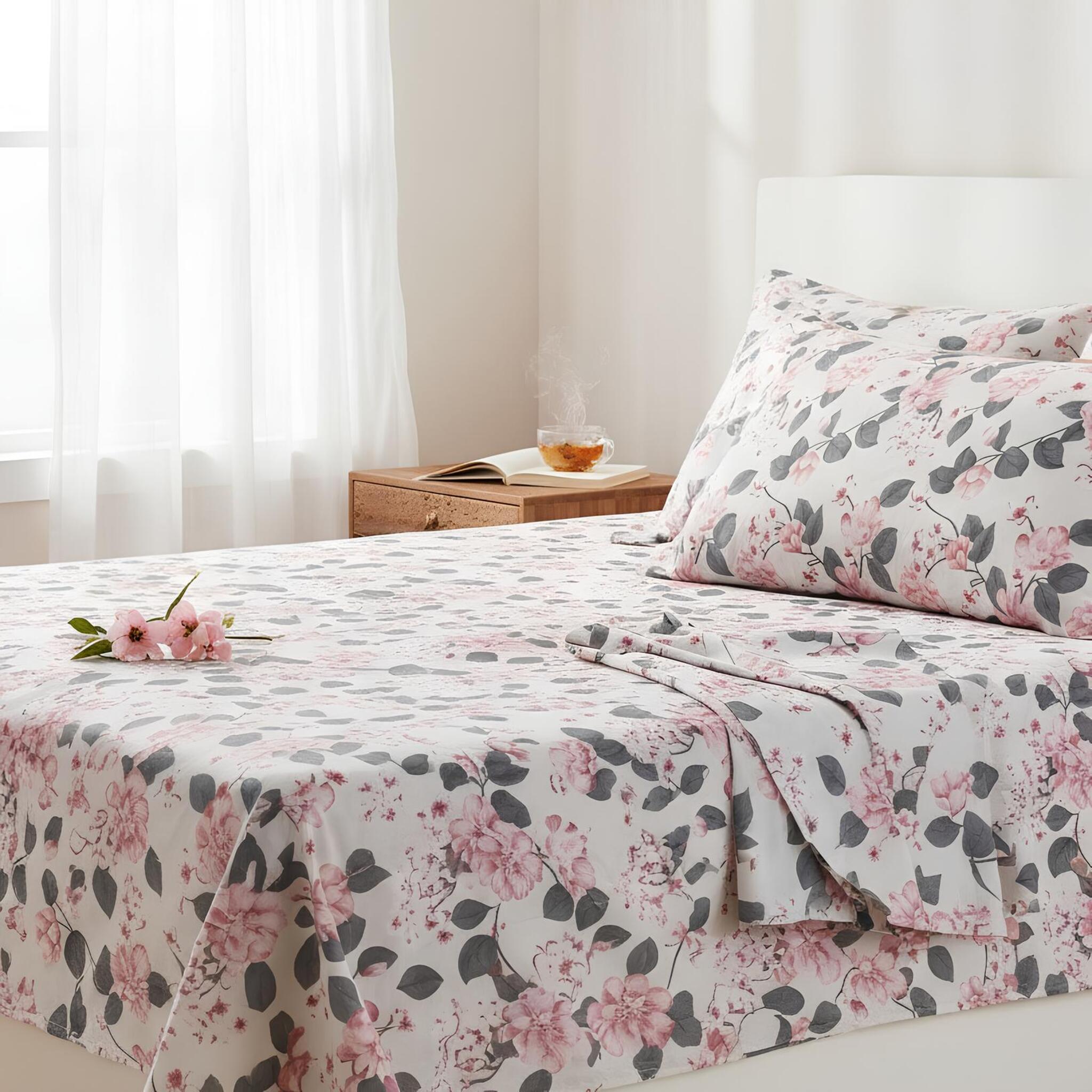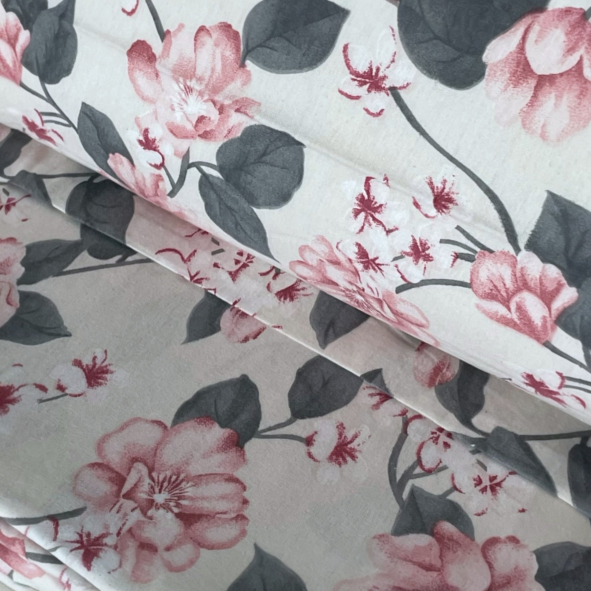 Il design floreale con delicati motivi rosa e verdi su fondo avorio o grigio regala eleganza e armonia a ogni camera da letto.