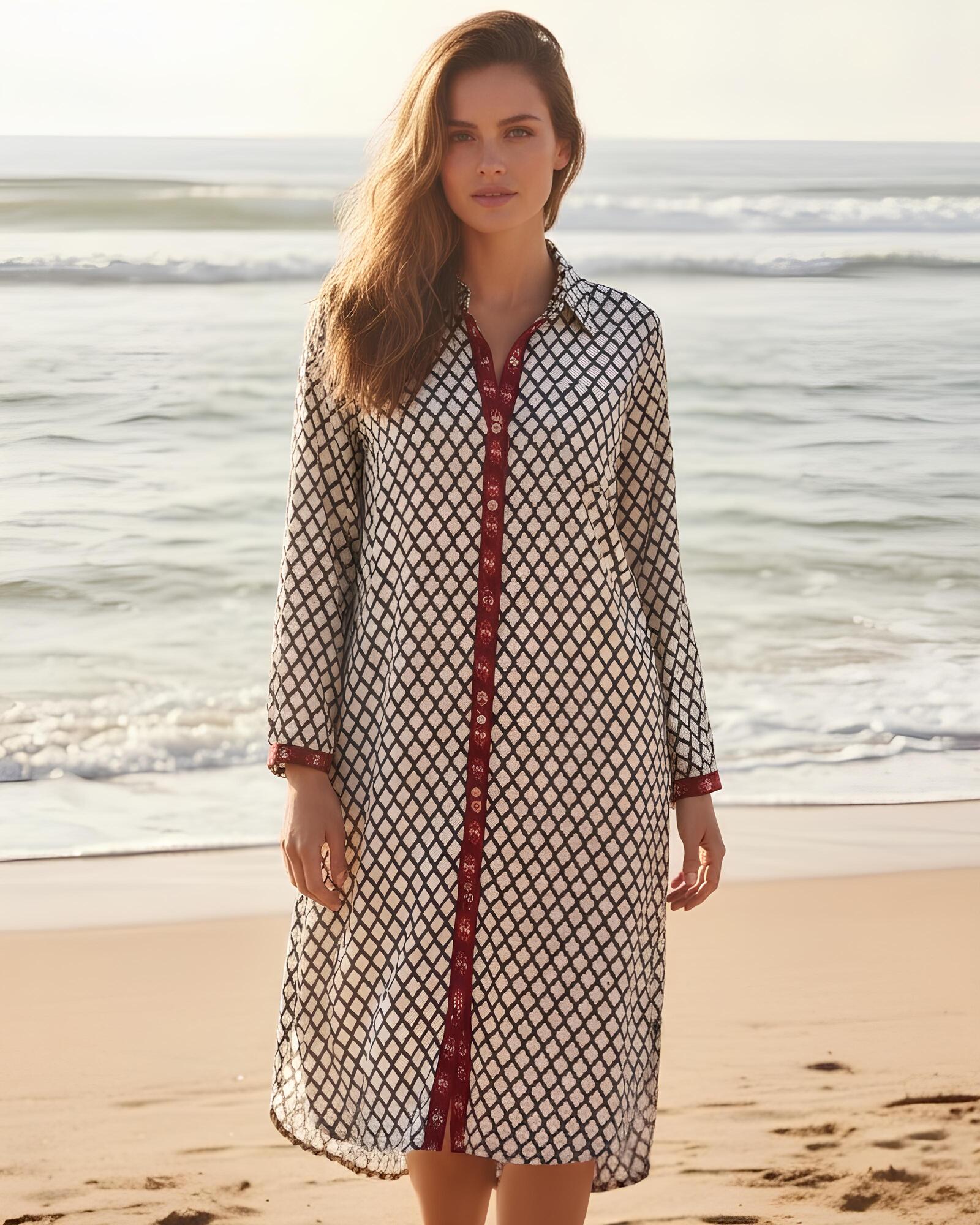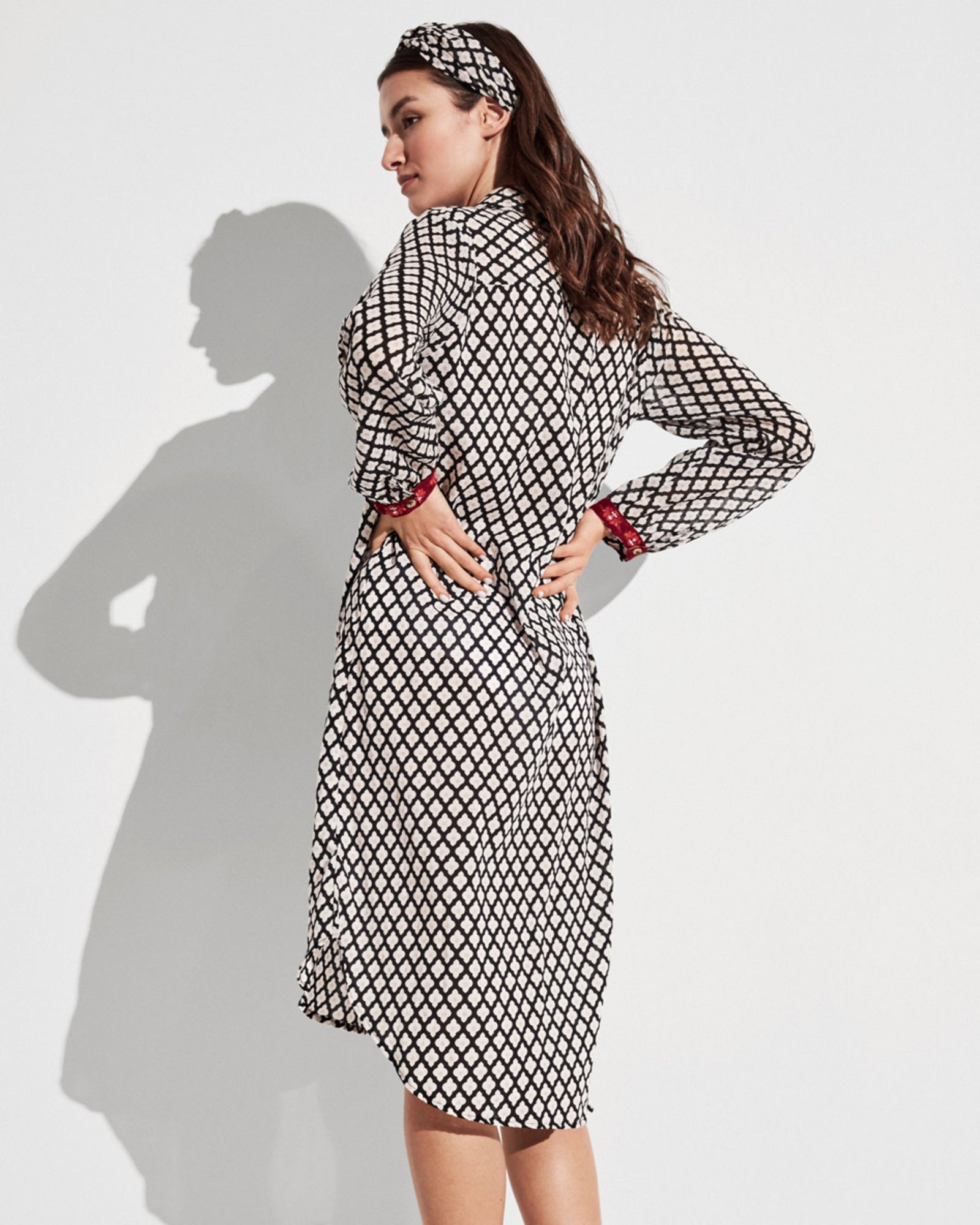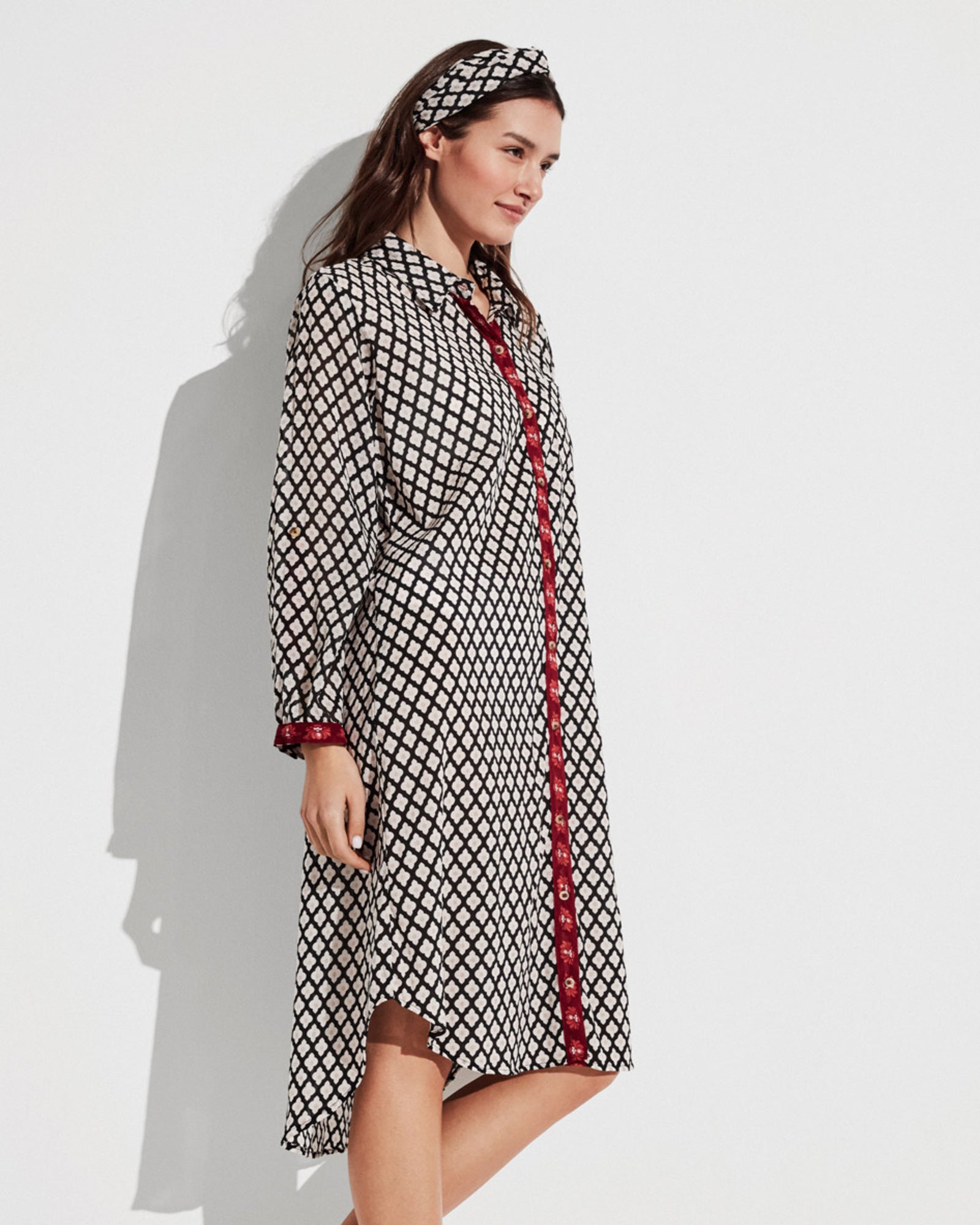 La fantasia geometrica bianco e nero dona un look raffinato e moderno, mentre i dettagli rossi a contrasto lungo l’abbottonatura frontale e sui polsini aggiungono carattere e personalità. Il taglio chemisier con colletto valorizza la silhouette con naturalezza, rendendolo pratico, versatile e sempre attuale.