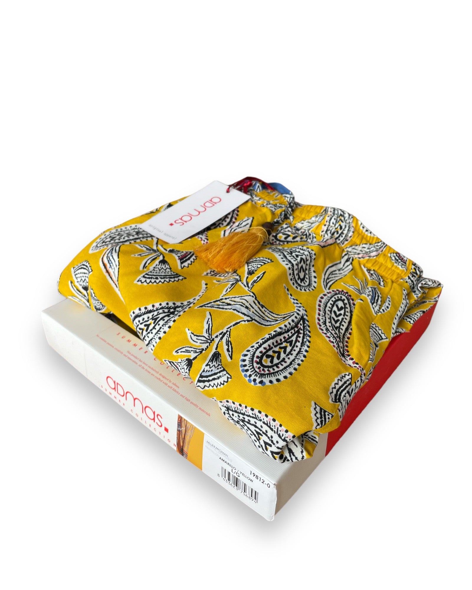 Il design lungo e fluido in colore giallo ocra, arricchito da una fantasia elegante, li rende versatili e facili da abbinare. L’elastico in vita con cordoncino decorativo regolabile garantisce una vestibilità comoda e adattabile, ideale sia sopra il costume da bagno sia per il tempo libero.