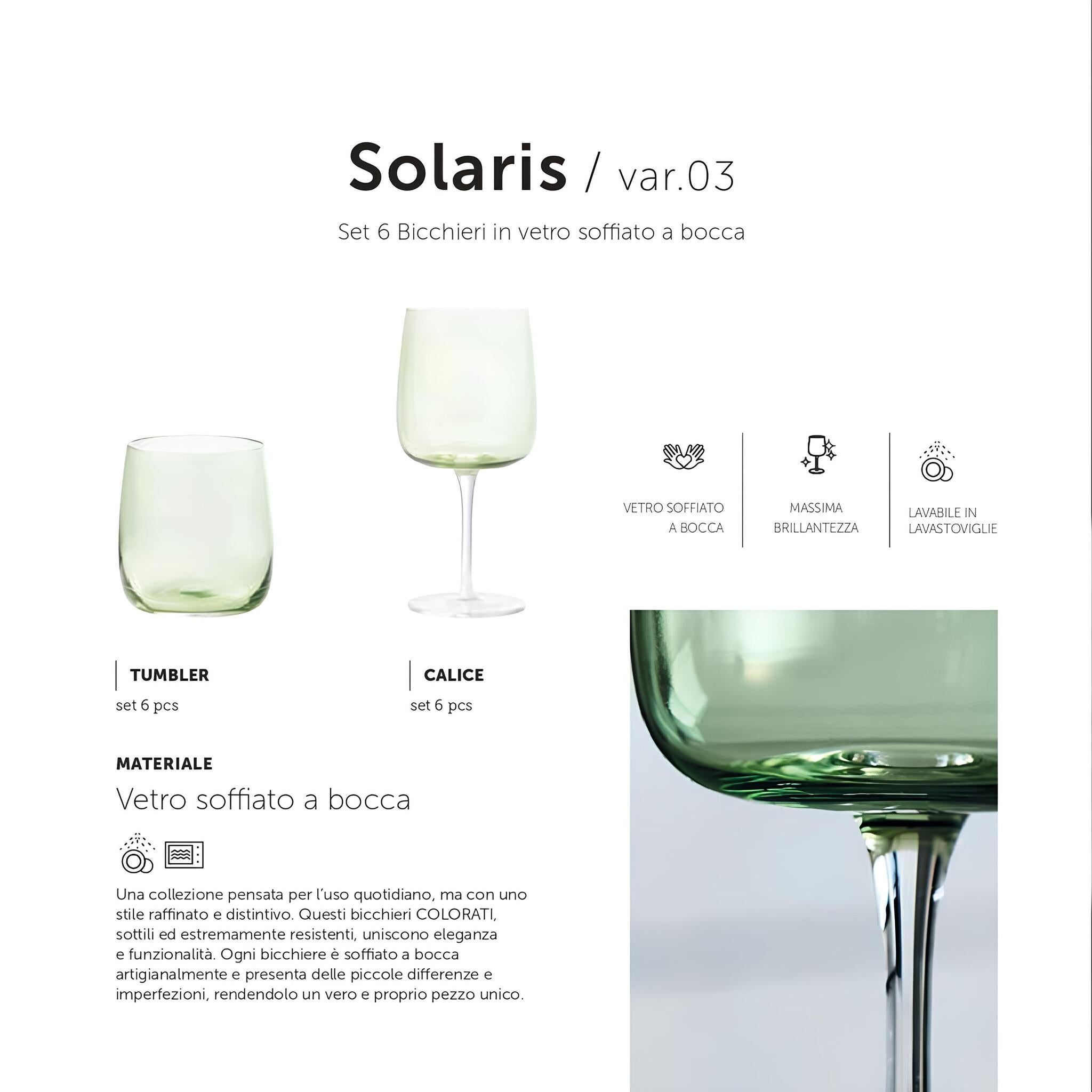 Disponibili in 5 raffinate tonalità, i bicchieri Solaris donano un tocco di colore e design a ogni tavola, perfetti sia per l’uso quotidiano sia per occasioni speciali.