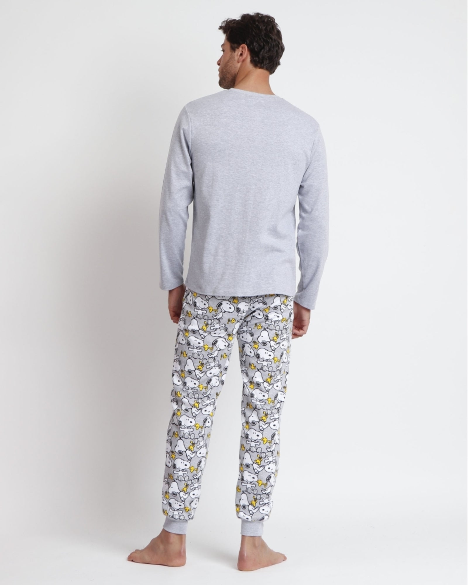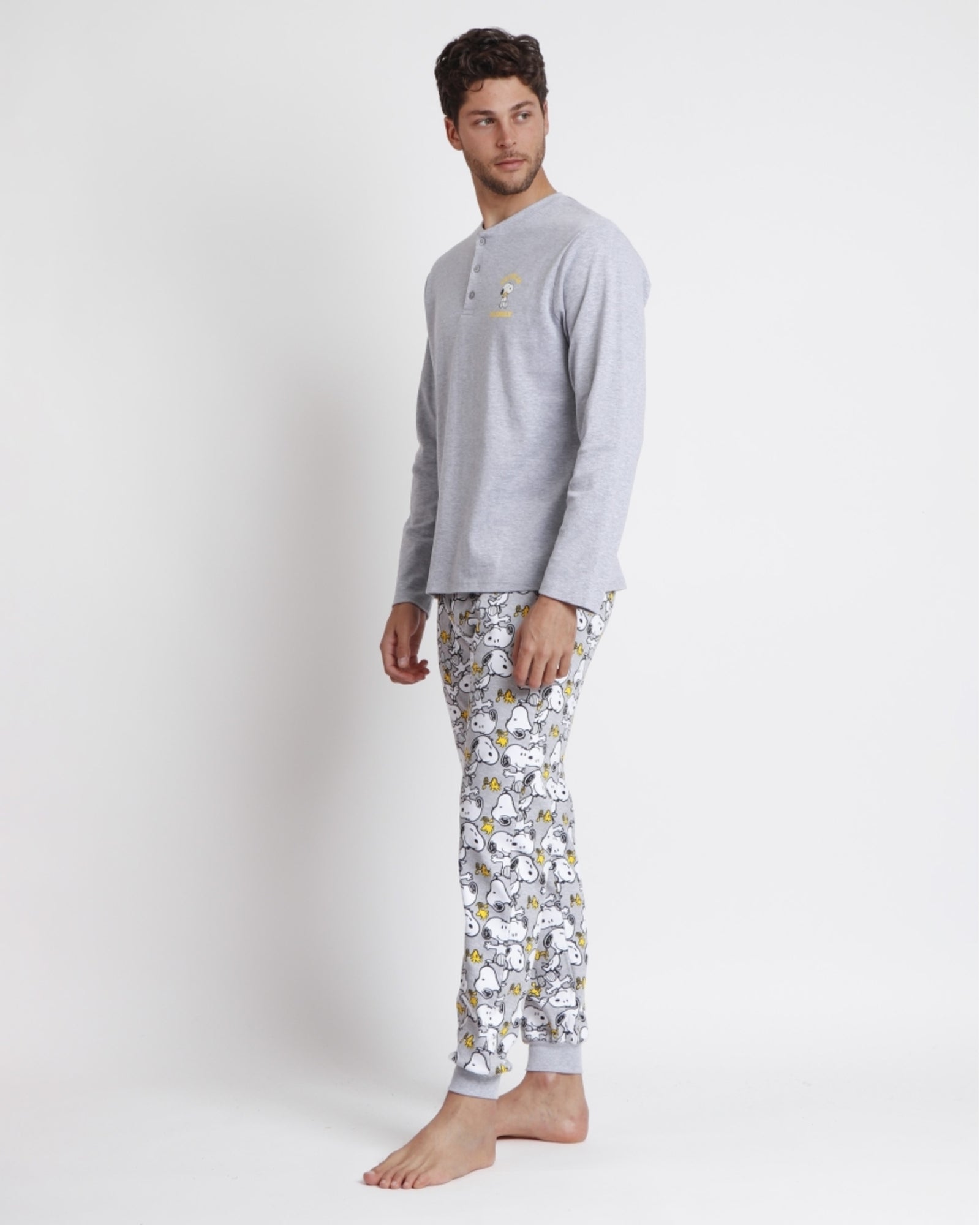 Il pigiama uomo Peanuts Art. 62014 è realizzato in caldo cotone interlock, morbido e traspirante, con maglia grigio mélange decorata da Snoopy e Woodstock.