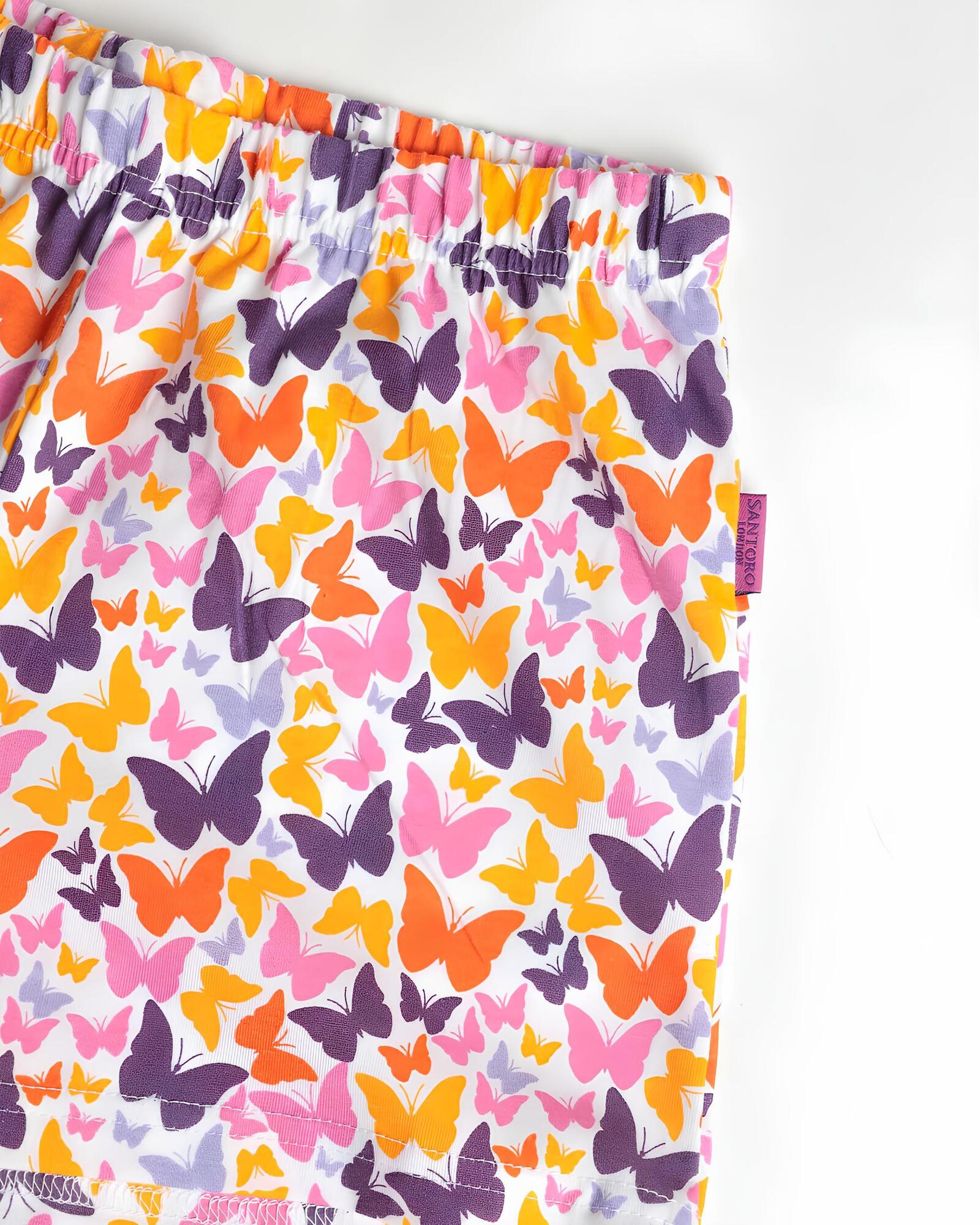 Il pantaloncino corto coordinato presenta una vivace fantasia di farfalle multicolore ed è dotato di elastico morbido in vita, per garantire comfort e libertà nei movimenti durante il riposo.