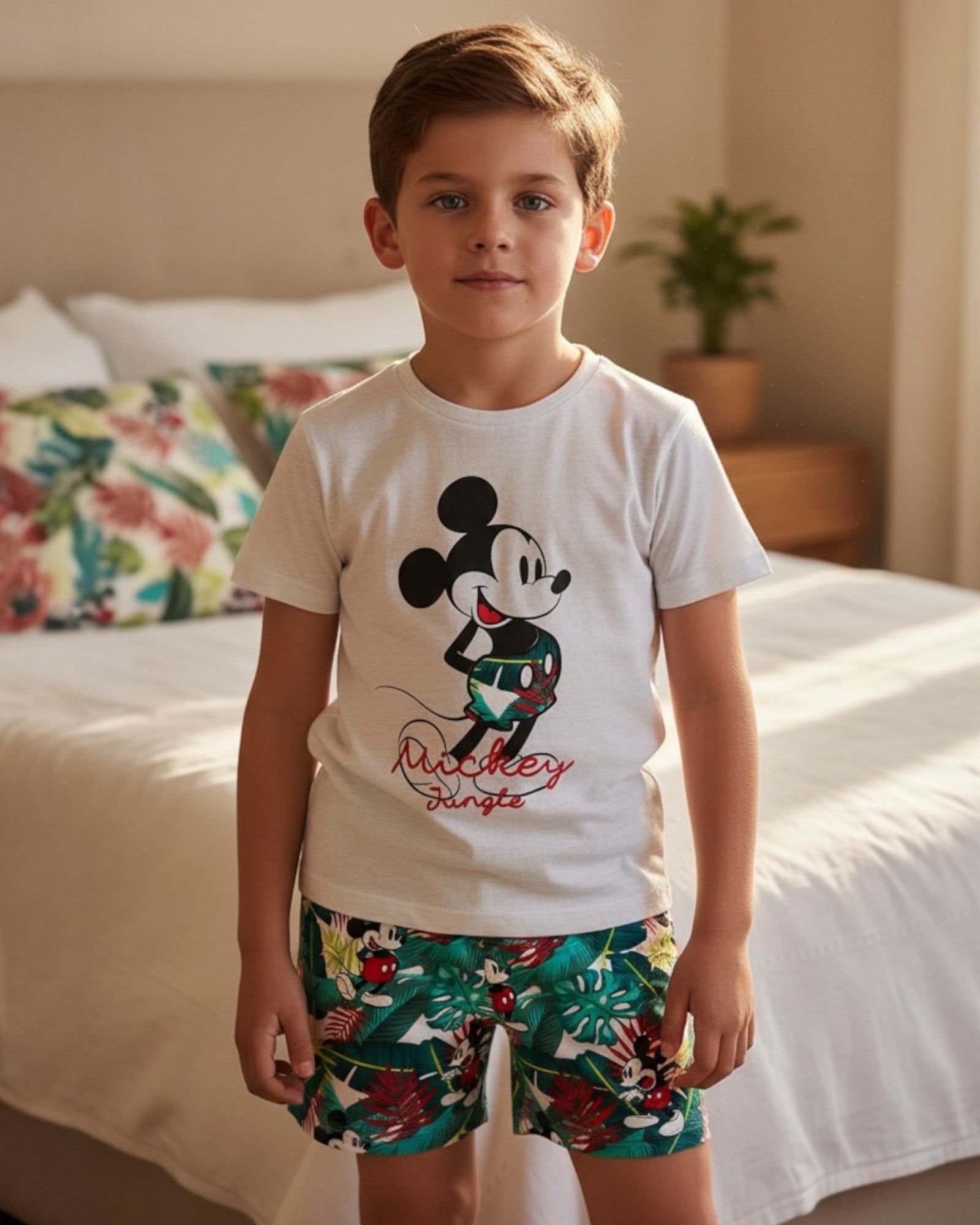 Il pigiama bambino Disney Mickey Jungle è pensato per accompagnare le notti estive con comfort e allegria. Realizzato in 100% cotone, è leggero, traspirante e delicato sulla pelle, ideale per la primavera e l’estate.