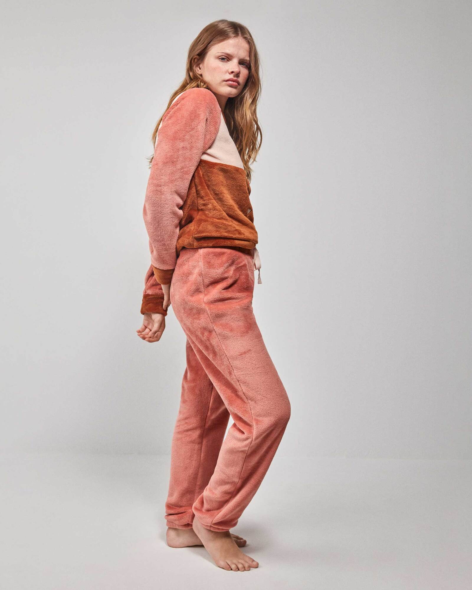 Pigiama Donna Gisela in caldo pile coral con maglia a maniche lunghe e pantalone lungo. La maglia girocollo a maniche lunghe con applicazioni e stampa. I pantaloni in tinta unita sono regolabili grazie ad un laccetto in vita. Tessuto morbido al tatto. Confezionato in scatola logata Gisela