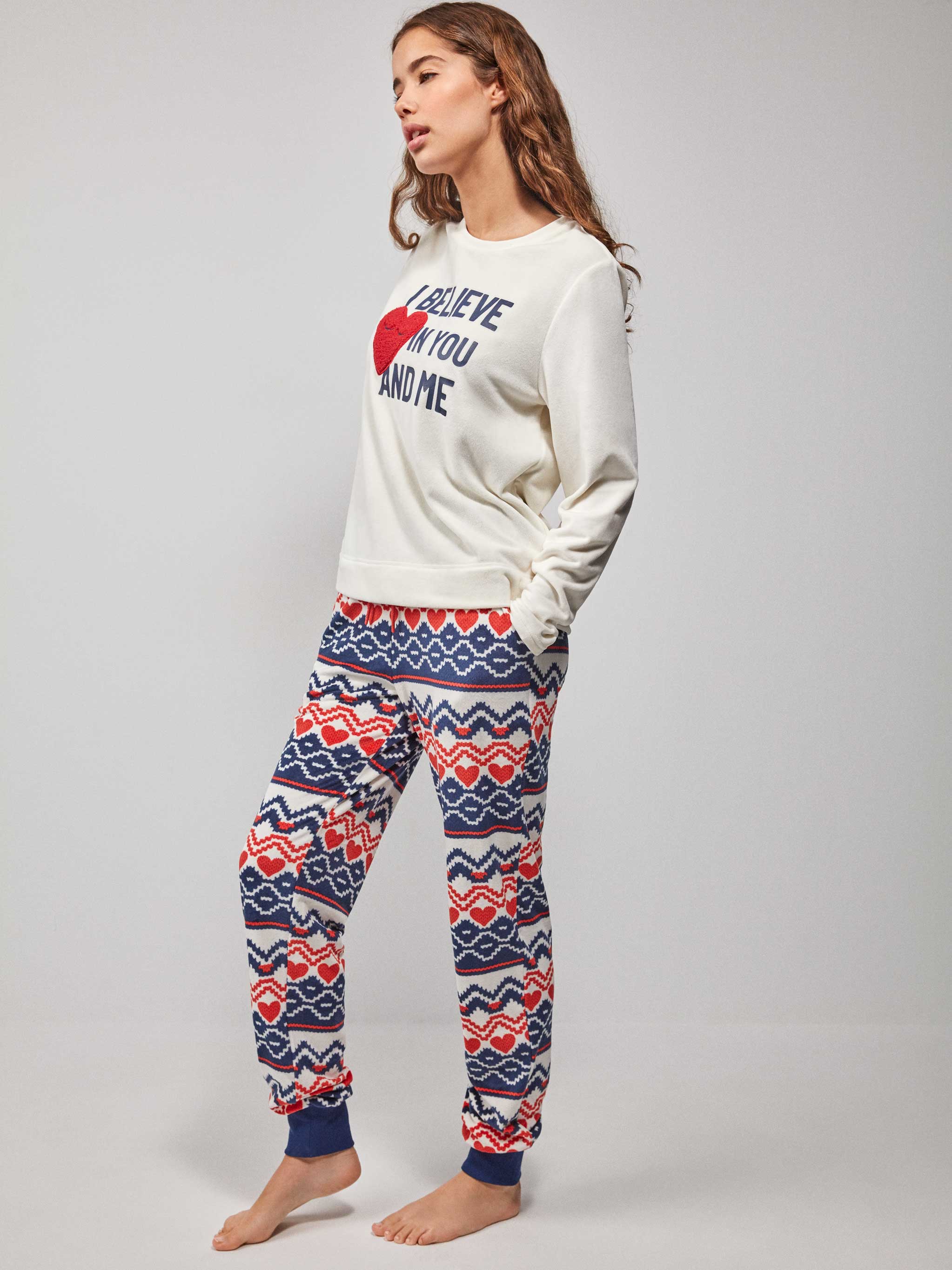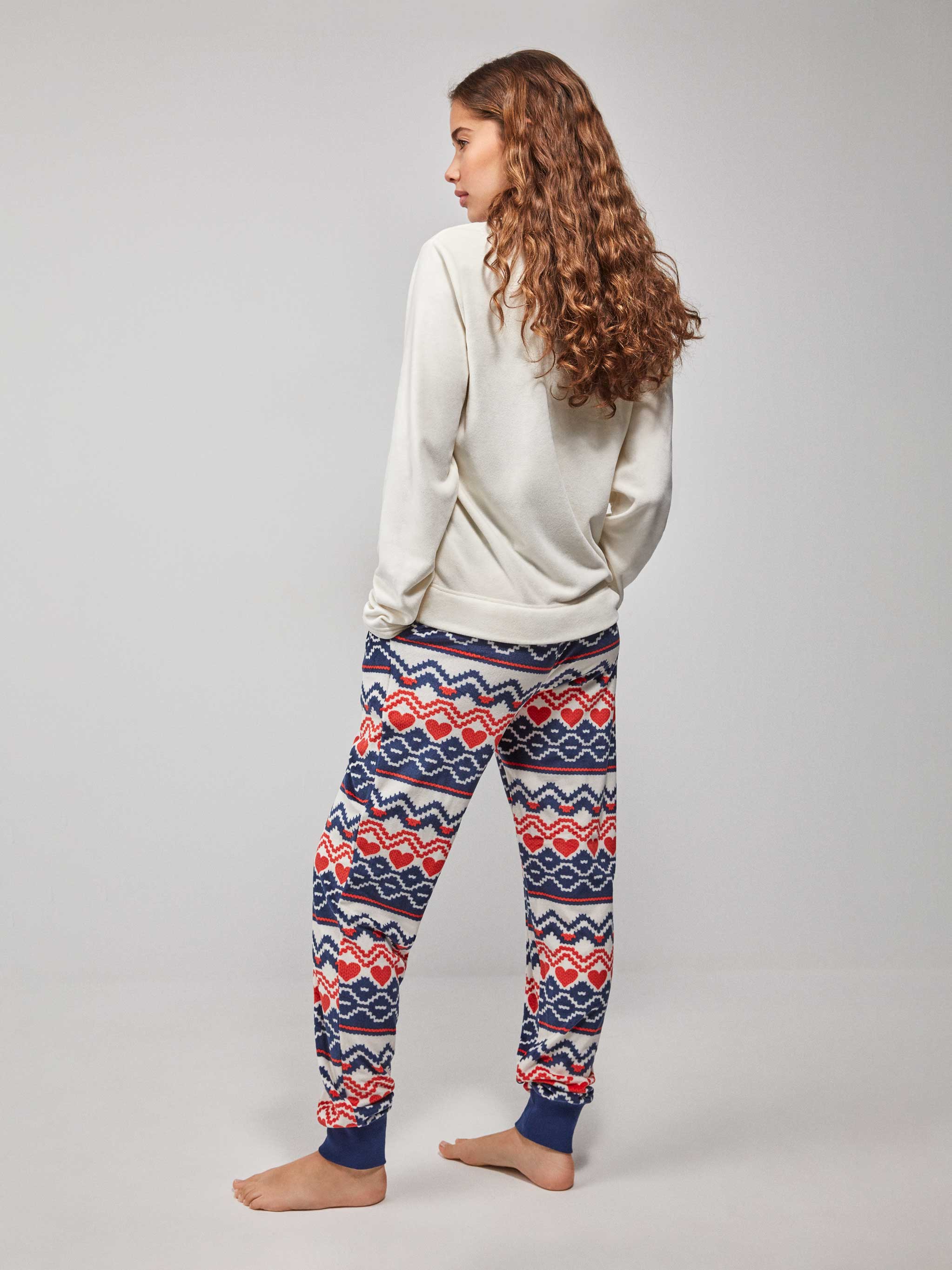 Pigiama Donna Gisela in caldo pile con maglia a maniche lunghe e pantalone lungo. La maglia girocollo a maniche lunghe con applicazioni e stampa. I pantaloni a fantasia sono regolabili grazie ad un laccetto in vita. Tessuto morbido al tatto. Confezionato in scatola logata Gisela