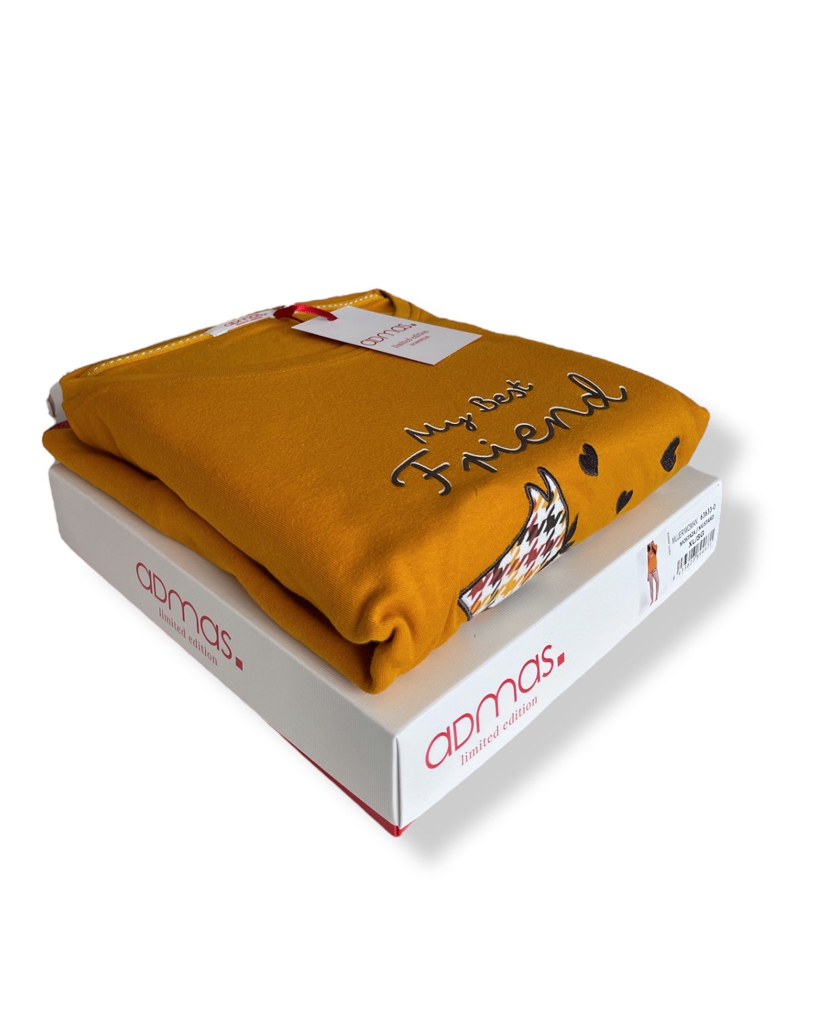🐶 Design dolce e originale – Maglia color senape con ricamo my best friend e simpatica stampa del cagnolino Lou Lou.