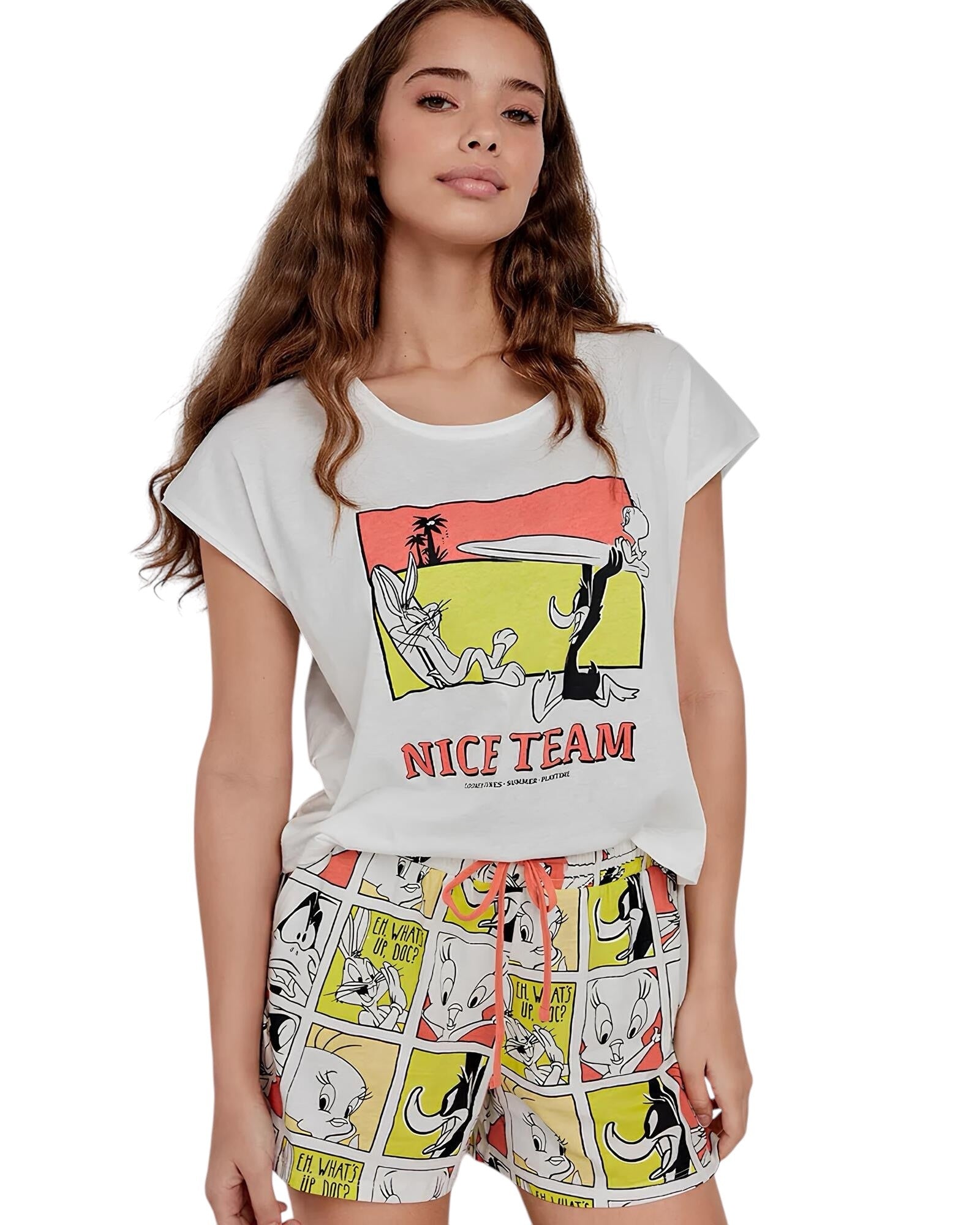 Divertente, comodo e perfetto per le serate estive! Il pigiama da donna Gisela in 100% cotone unisce comfort e stile con un tocco nostalgico grazie alla stampa ispirata ai personaggi iconici dei Looney Tunes. La maglietta bianca a maniche corte presenta una grafica vintage con Bugs Bunny e Daffy Duck e la scritta “Nice Team”, mentre gli shorts coordinati presentano una stampa all-over in stile fumetto con i volti dei personaggi e il celebre slogan “Eh, what’s up, doc?”. Ideale per dormire, rilassarsi a casa o anche come regalo originale per le amanti dei cartoon.