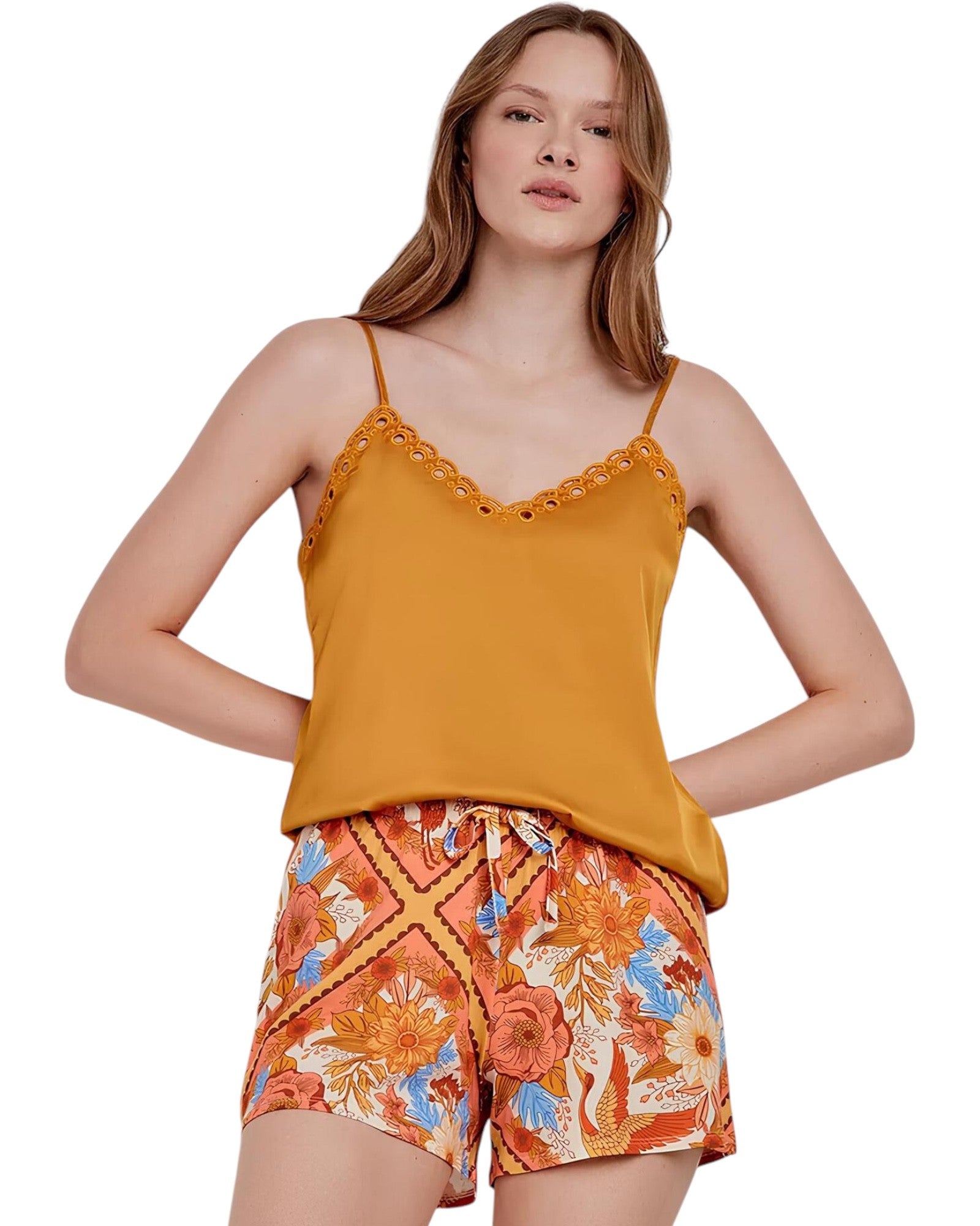 Questo pigiama da donna firmato Gisela è un perfetto mix tra comodità e stile raffinato. Realizzato in una combinazione leggera di raso e viscosa, è ideale per le stagioni più calde. Il top color ocra con spalline sottili è impreziosito da un raffinato bordo ricamato sullo scollo, mentre i pantaloncini sono decorati con una vivace stampa floreale nei toni caldi dell’arancio, del rosa e del blu. Un completo perfetto per chi desidera sentirsi elegante anche nei momenti di relax o durante la notte