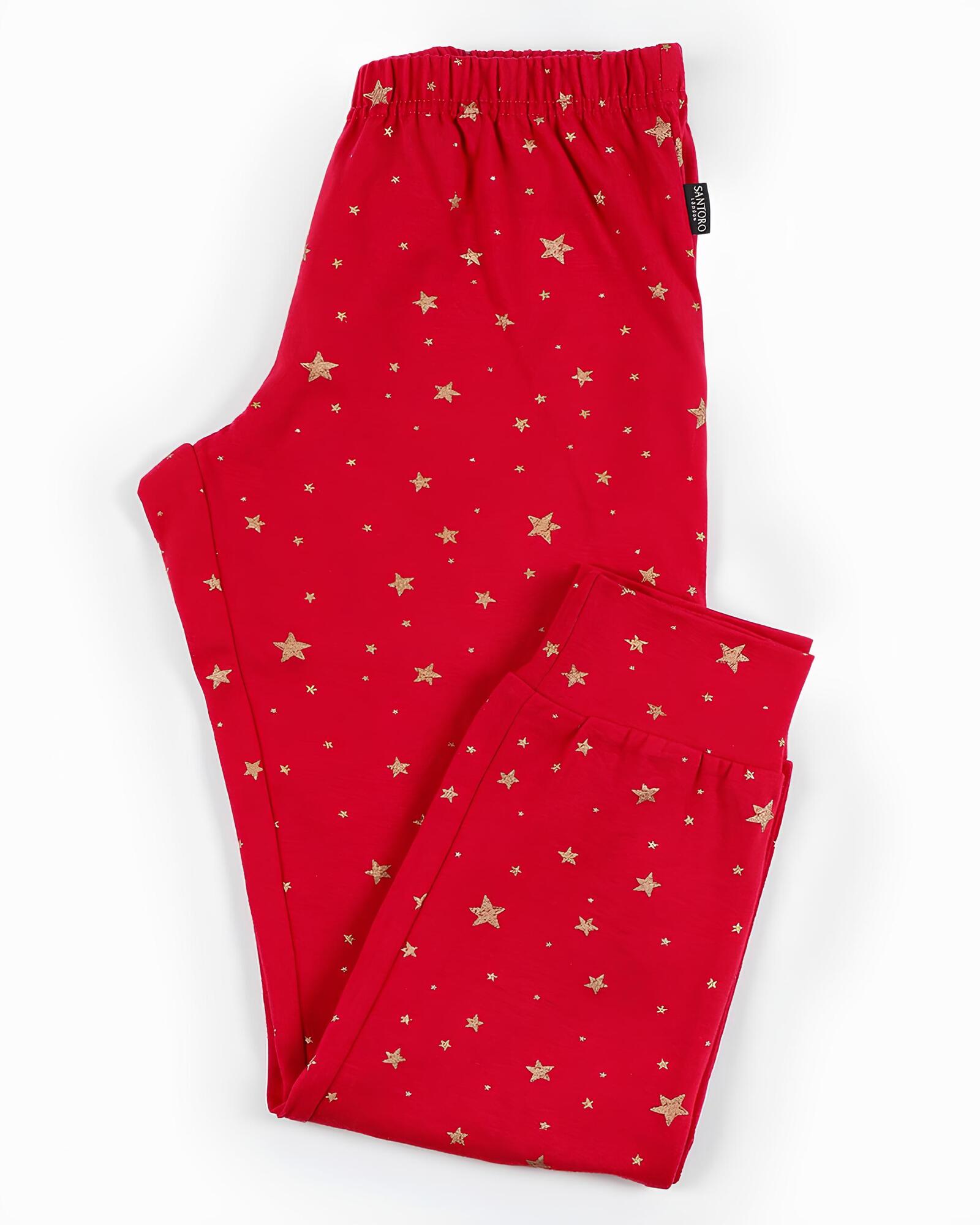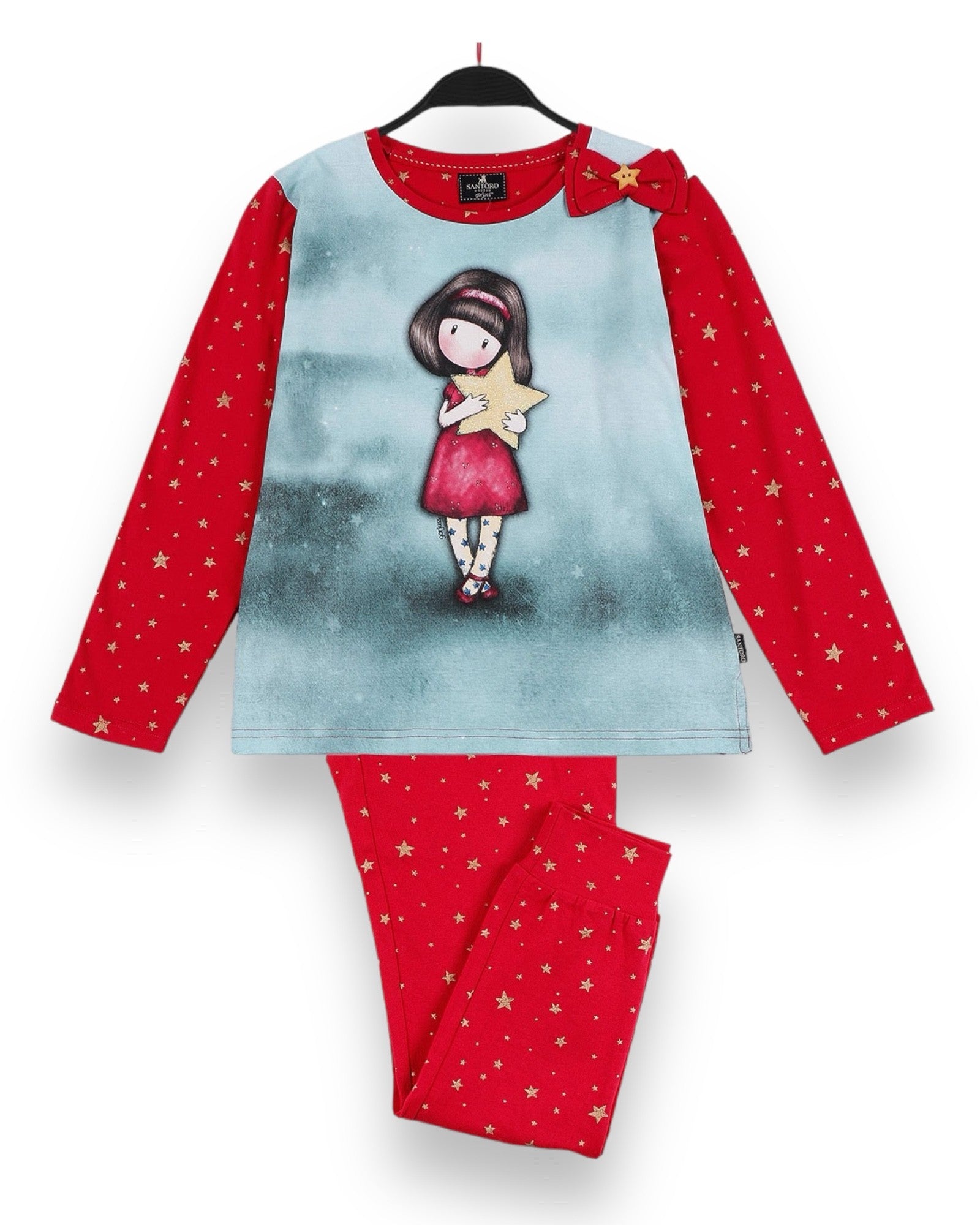 La maglia a maniche lunghe con girocollo è impreziosita da un fiocco applicato e dalla stampa natalizia della bambolina Gorjuss, mentre i pantaloni lunghi coordinati presentano una fantasia di stelline dorate e vita regolabile.