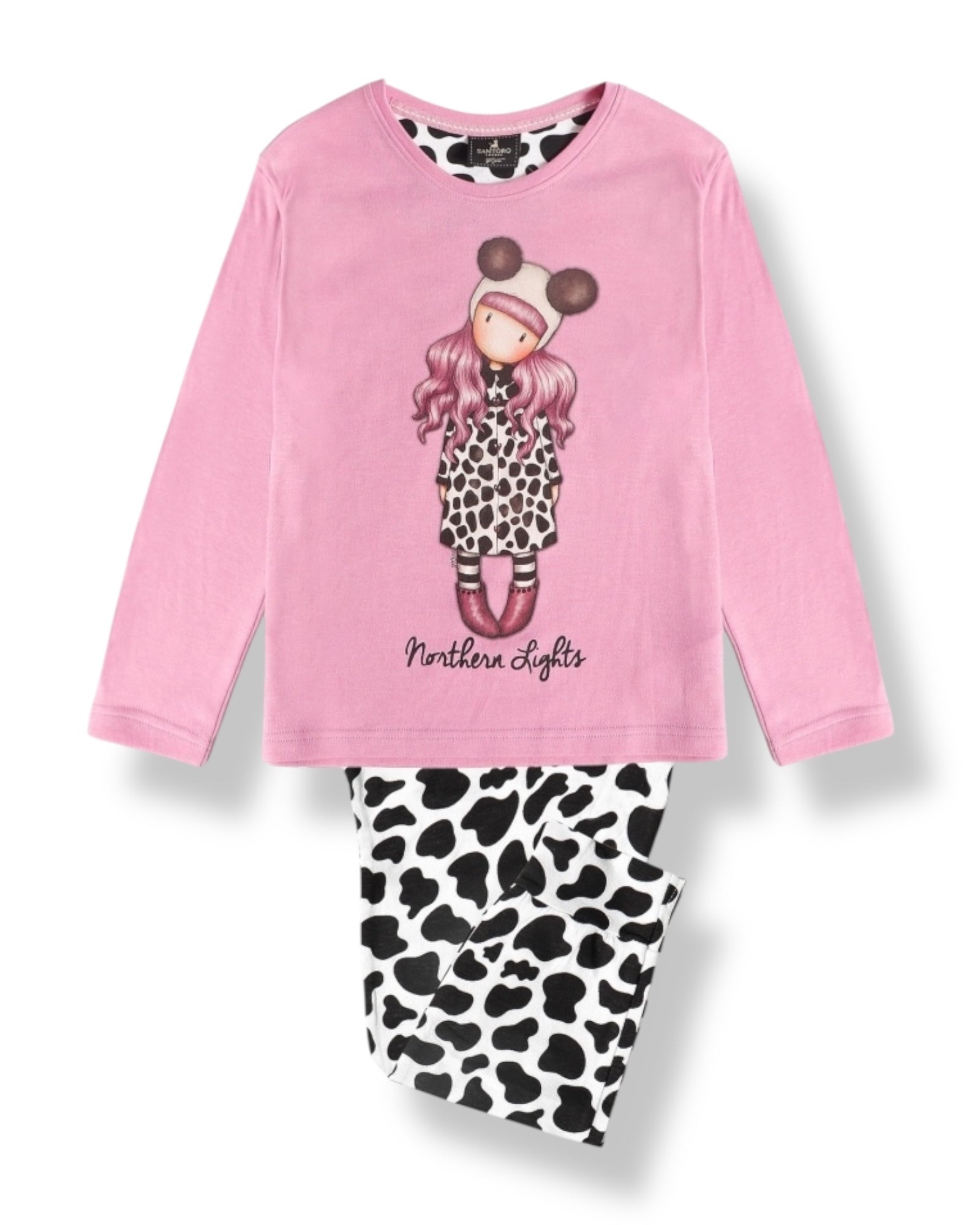 La maglia a maniche lunghe, in morbido interlock rosa mélange, è impreziosita dalla classica illustrazione Gorjuss in versione Northern Lights, delicata e ricca di dettagli. Il pantalone lungo, in 100% cotone, presenta una vivace fantasia maculata in bianco e nero, con vita e polsini regolabili per garantire massimo comfort.