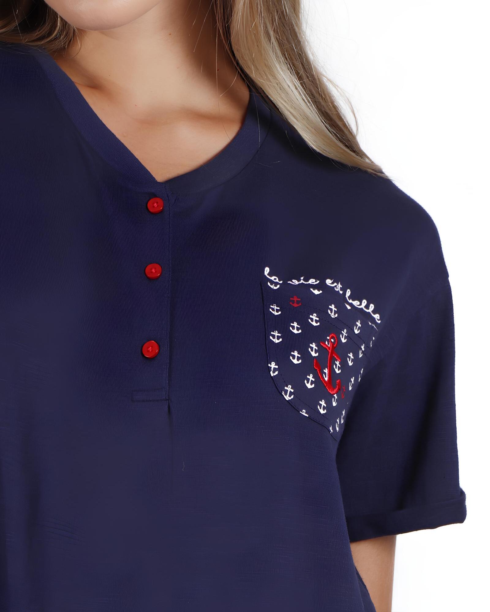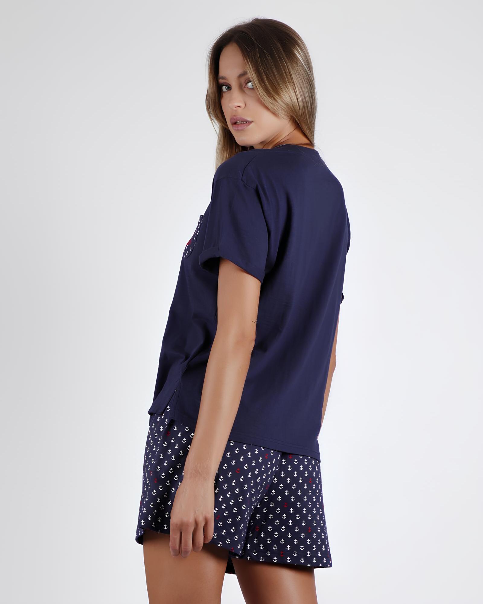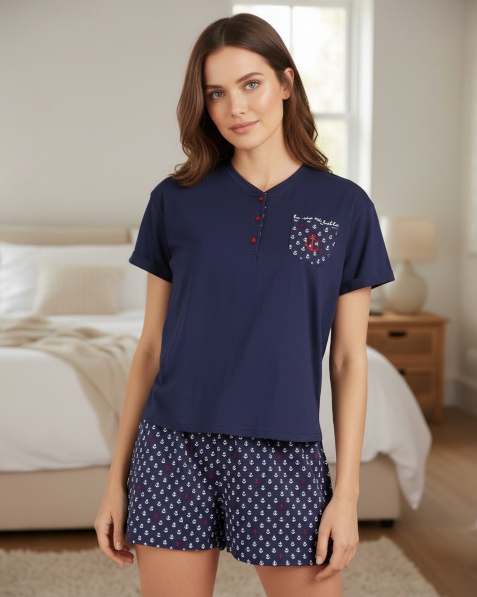 Il colore navy, intramontabile e raffinato, unito alla fantasia delicata, rende questo pigiama un must-have nella selezione di pigiameria di qualità.