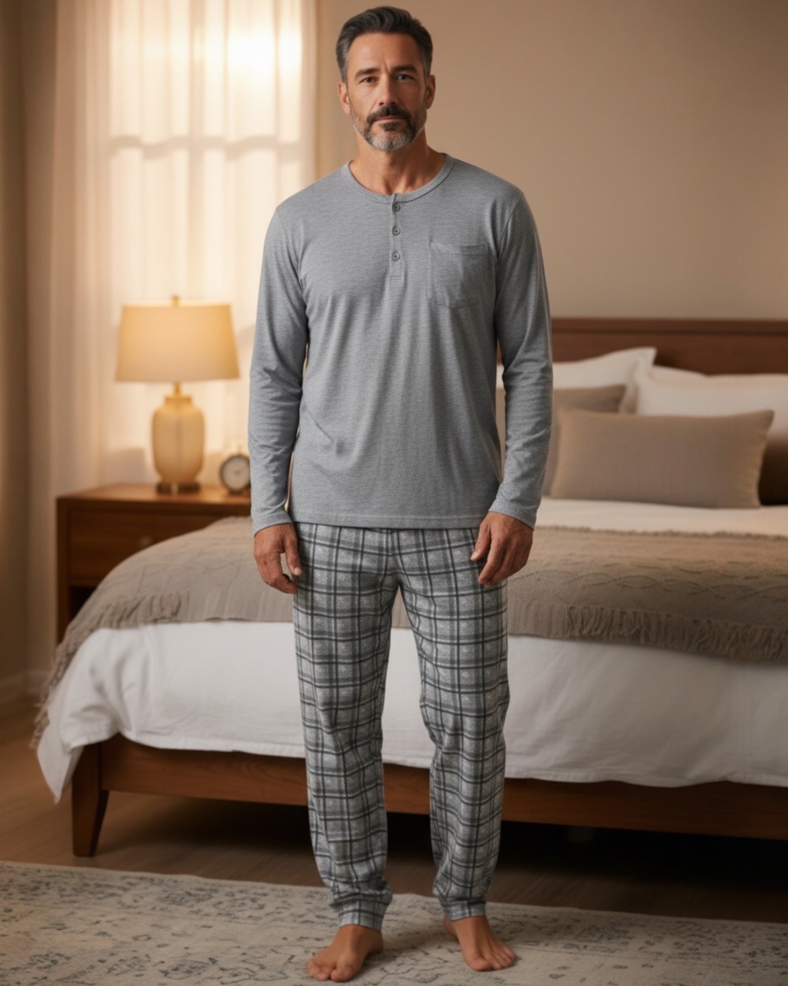🌙 Maglia serafino a manica lunga – Modello classico con bottoncini e taschino sul petto, comfort e stile anche a casa