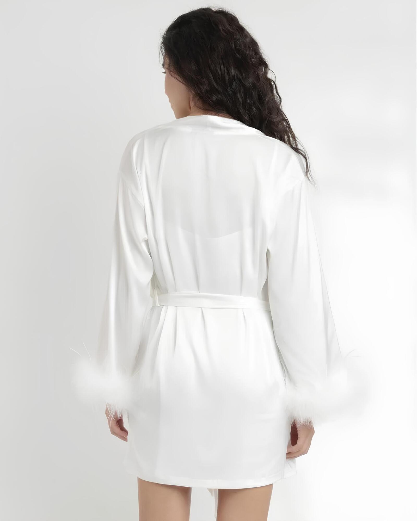 Realizzata in morbido raso satinato, presenta maniche ampie in stile kimono con piume di marabù ton sur ton removibili, fissate tramite pratici bottoncini per personalizzare il look con un tocco glamour.