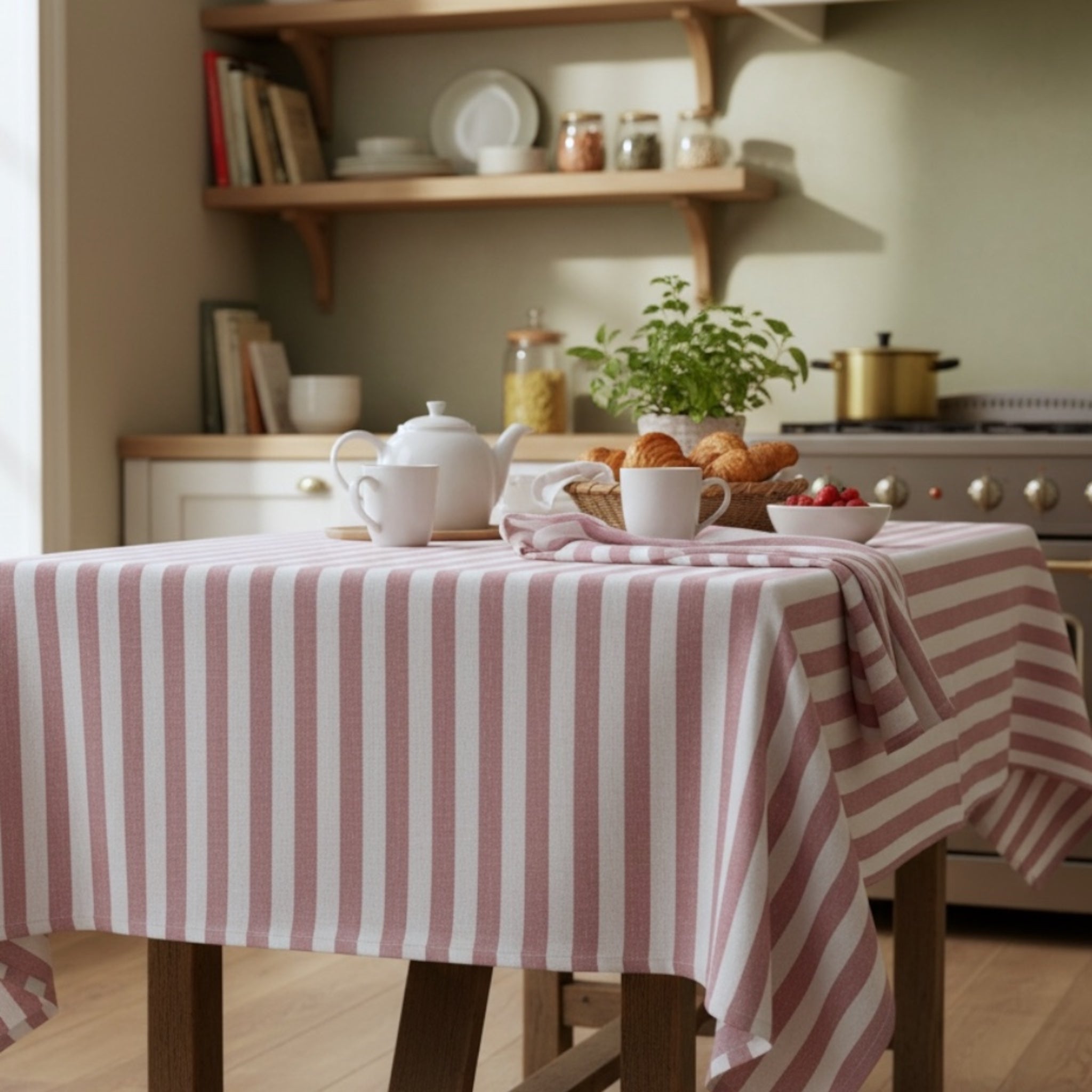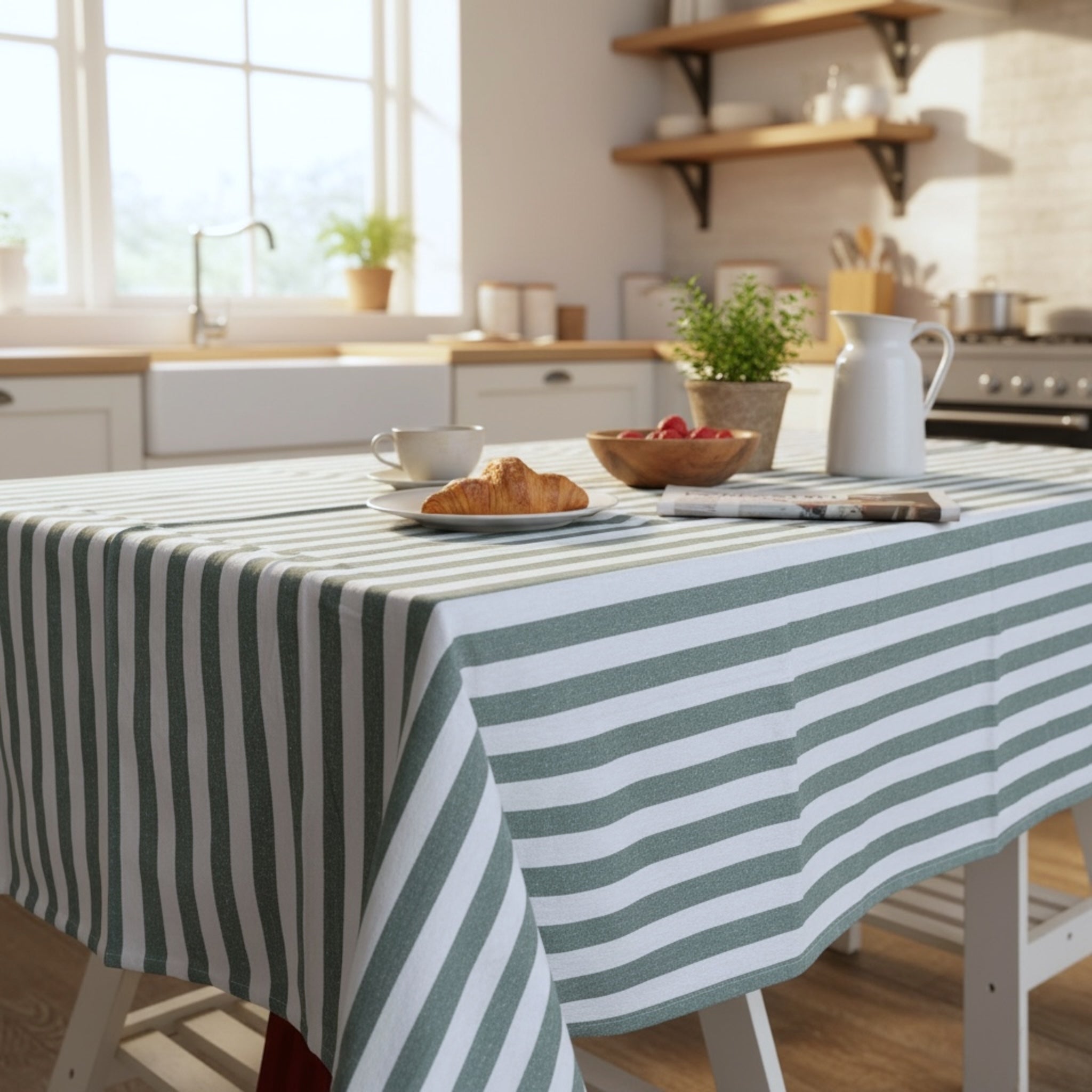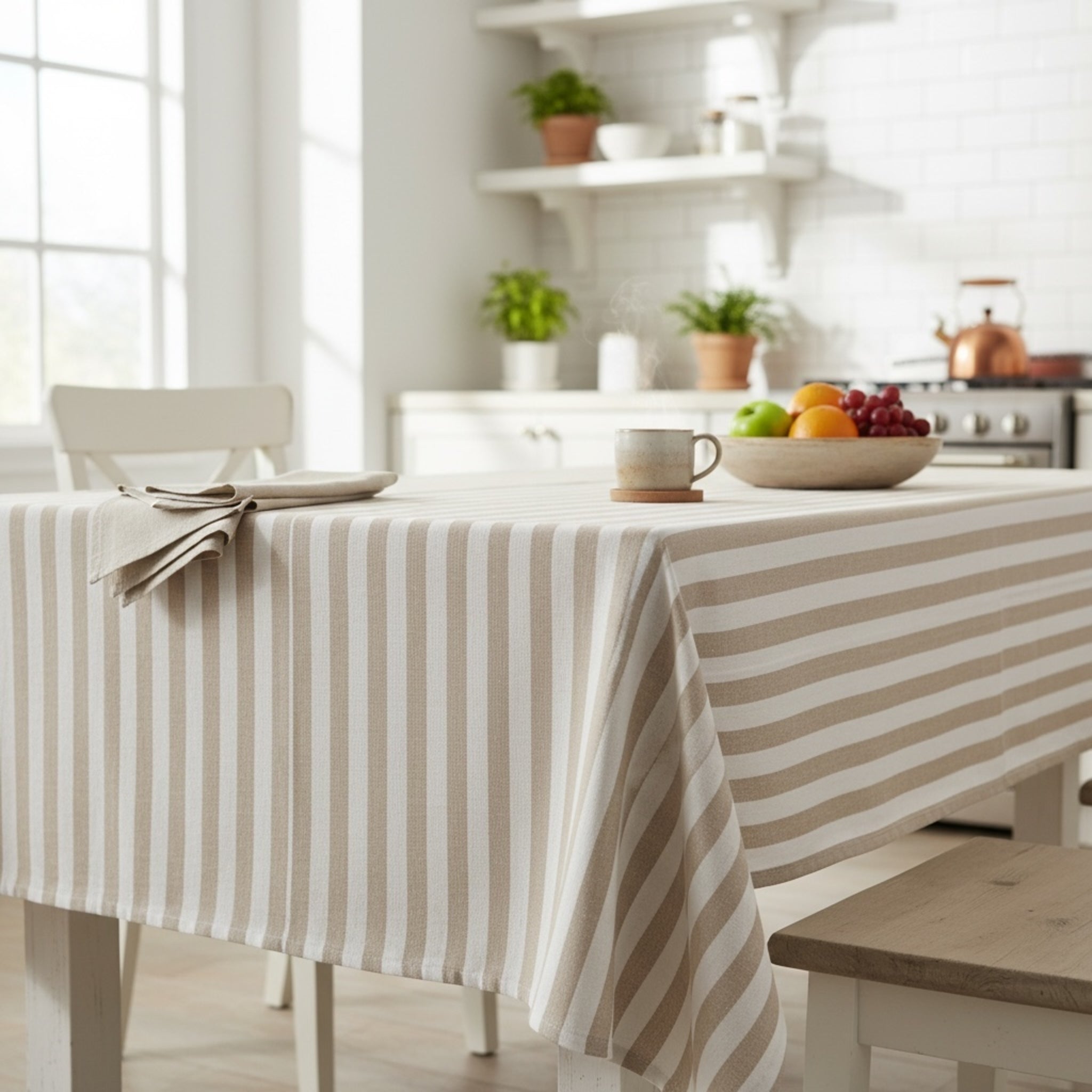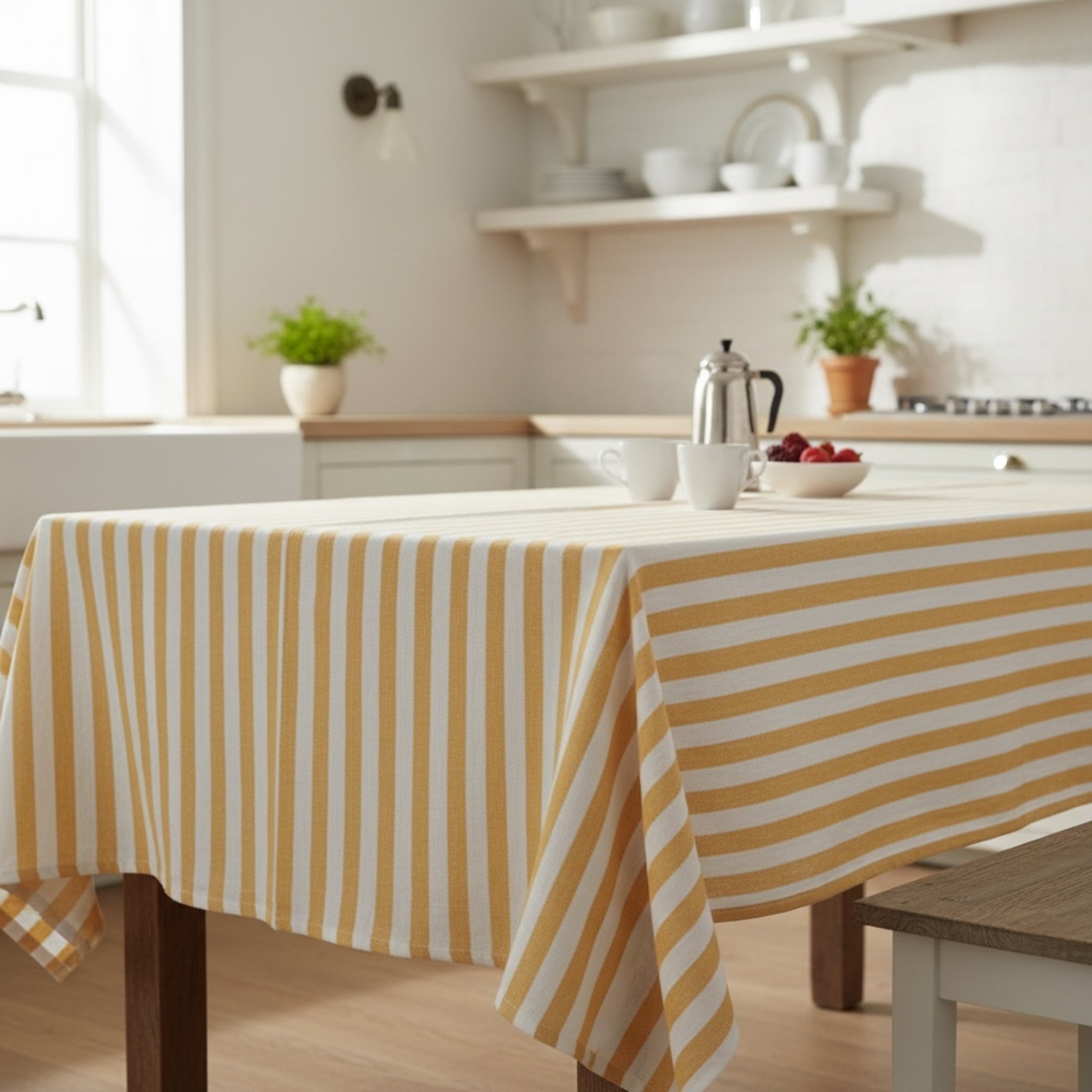 La sua fantasia a righe bicolore è il vero elemento distintivo: le righe regolari e ben definite creano un effetto armonioso e luminoso, capace di adattarsi sia a cucine moderne che ad ambienti più classici o in stile nordico.