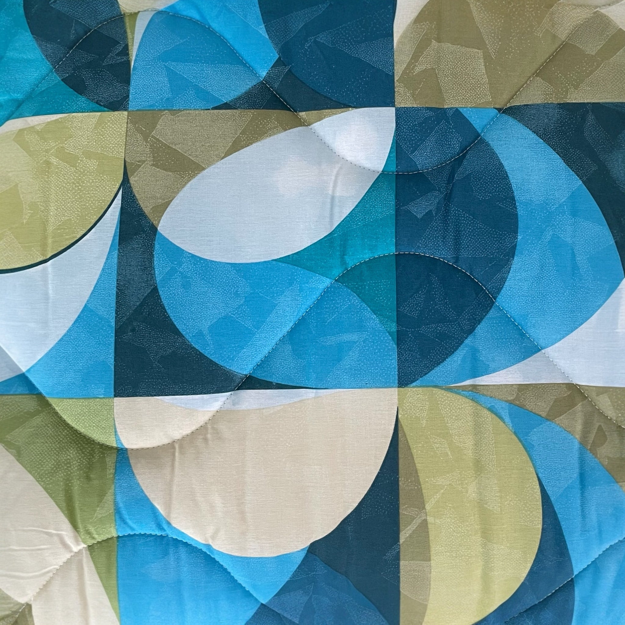 La stampa digitale geometrica nei toni del blu aggiunge un tocco moderno e luminoso all’ambiente, adattandosi facilmente a ogni stile d’arredo.