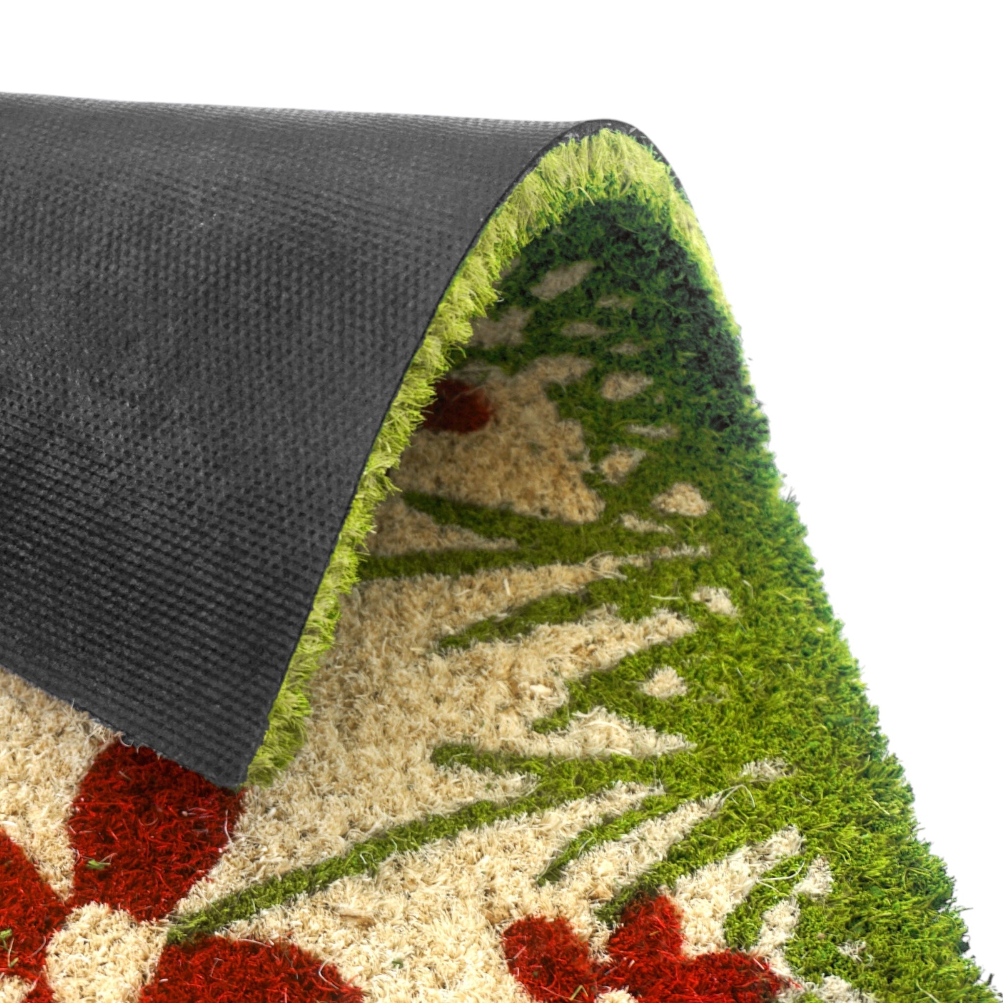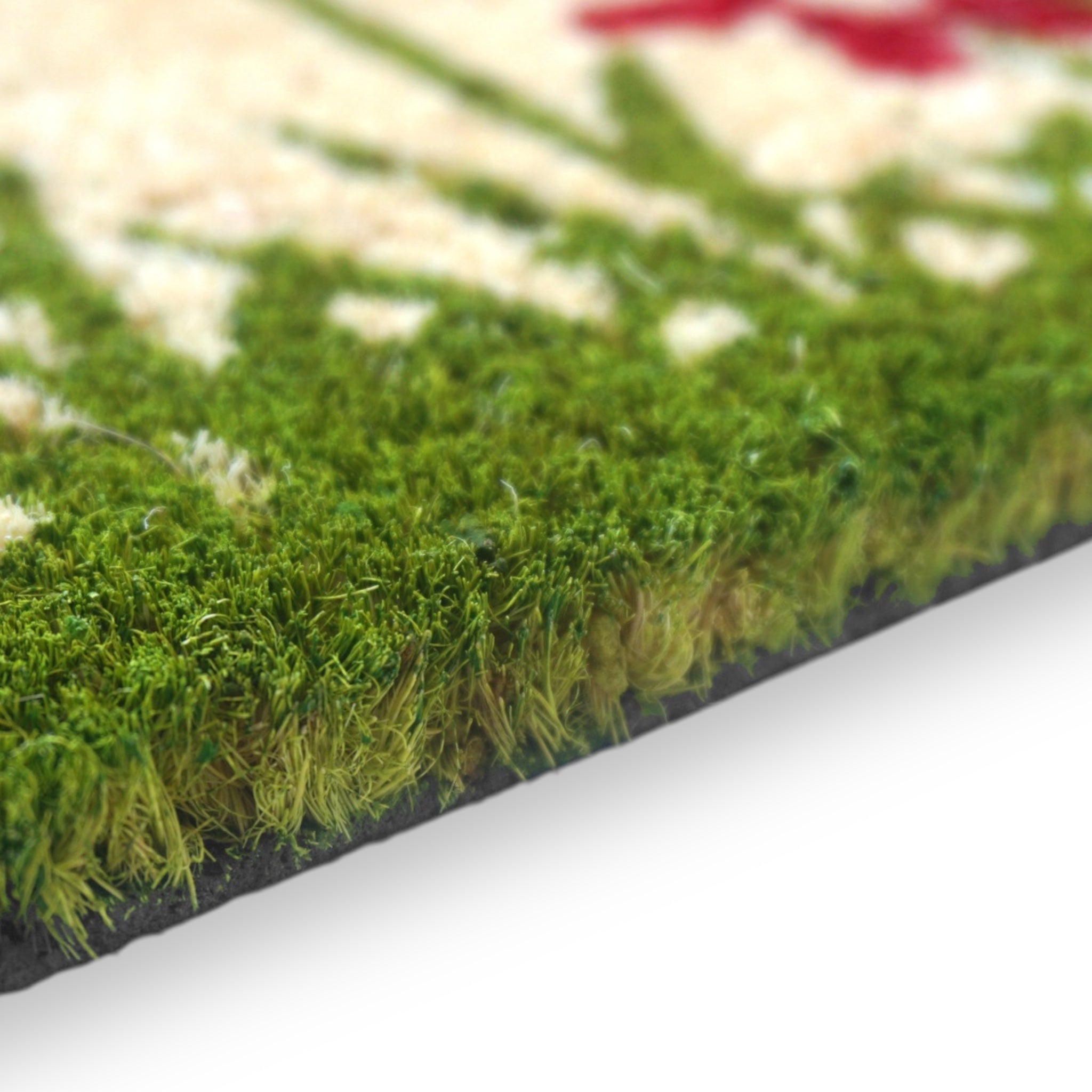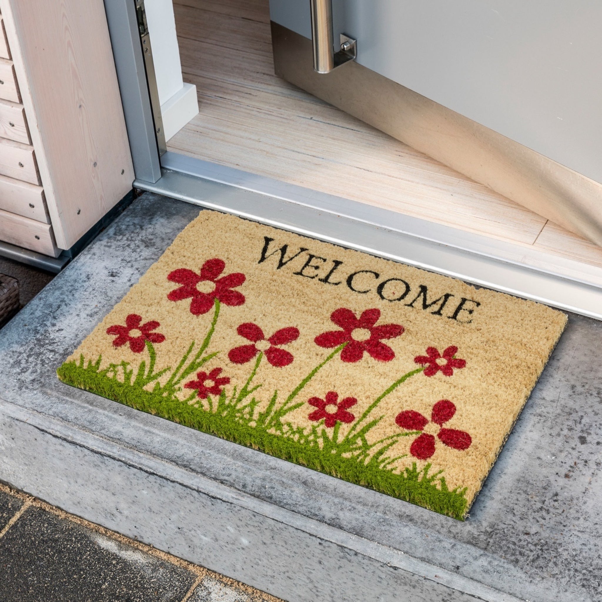 Questo zerbino da esterno è realizzato in fibra di cocco naturale antibatterica con fondo antiscivolo. Il disegno raffigura un prato fiorito con la scritta welcome